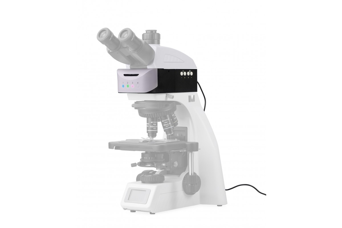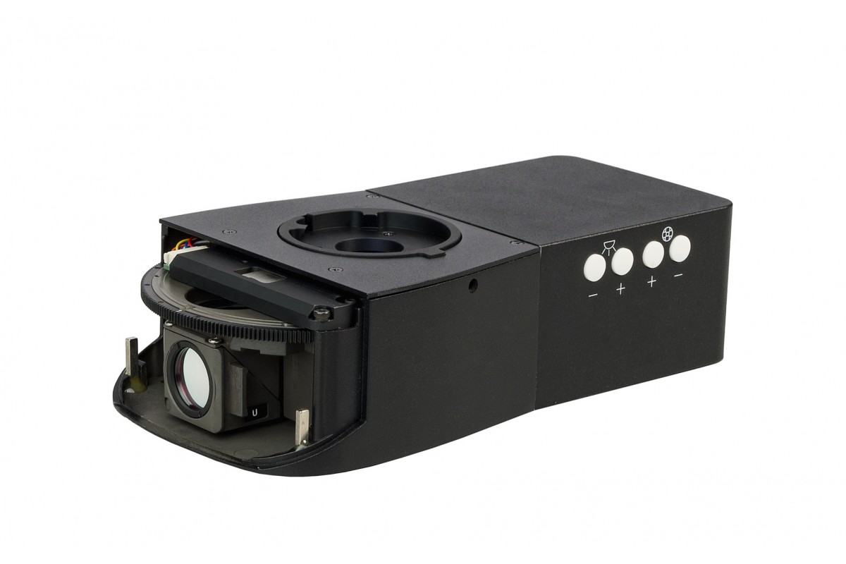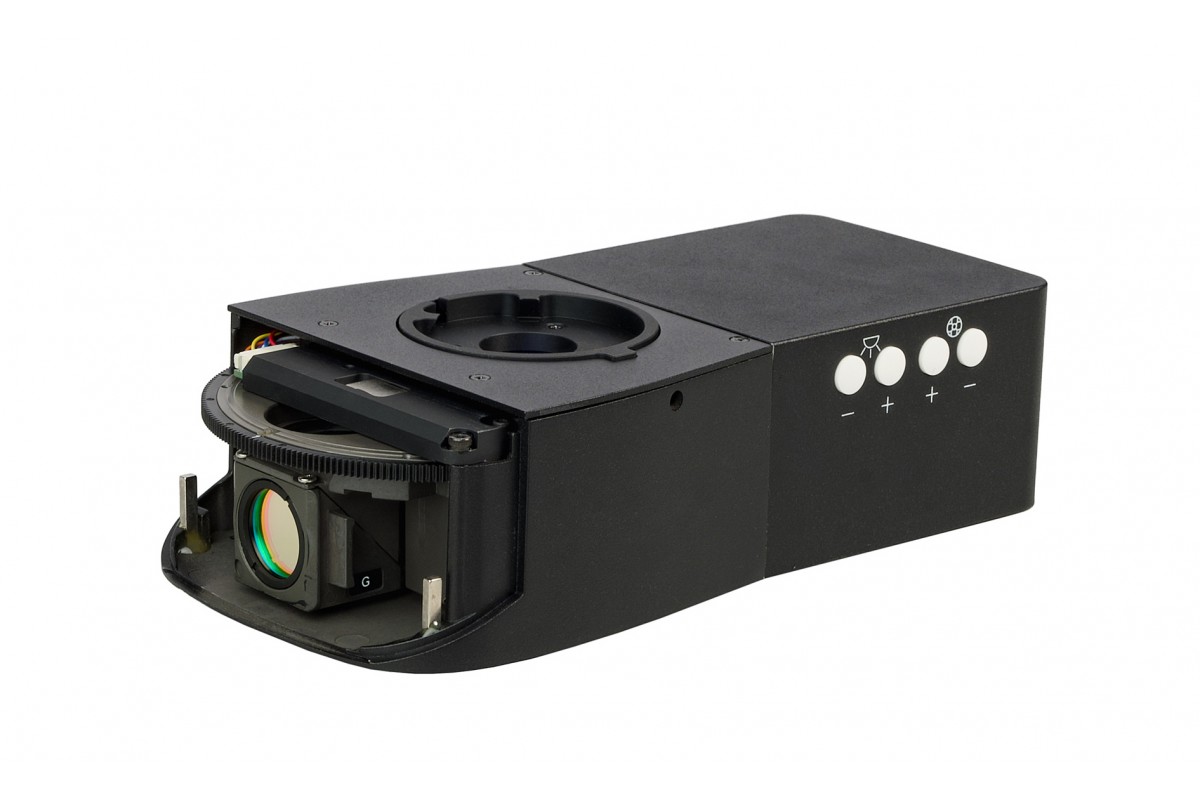 Насадка интегрируется в оптический путь микроскопа, располагаясь между револьверным устройством и штативом. Ее конструкция включает моторизованную турель, предназначенную для одновременной установки нескольких фильтров, а также для работы в светлом поле. Смена фильтра осуществляется нажатием на кнопки: одна кнопка отвечает за поворот турели по часовой стрелке, другая – против часовой стрелки. Благодаря этому пользователь может быстро переключаться между режимами работы, что упрощает процесс исследования образцов и повышает эффективность проведения экспериментов.