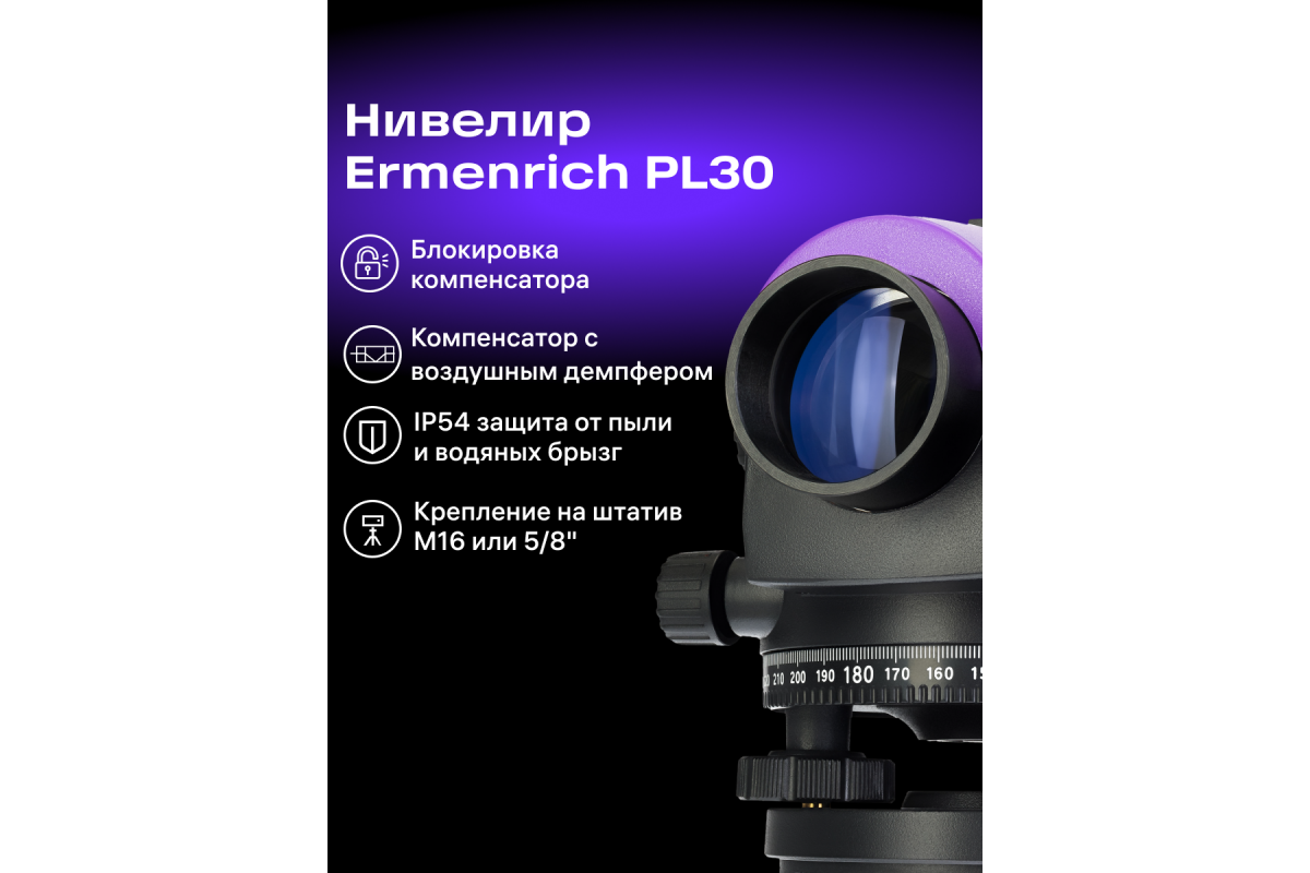 Ermenrich PL30 – это оптический нивелир, который найдет свое применение в геодезических работах, при строительстве зданий, устройстве парковых зон, разметке участка под возведение теплицы или беседки. Может использоваться как для решения бытовых задач на приусадебном участке, так и для профессиональной работы. Нивелир снабжен надежным компенсатором, который обеспечивает точное и быстрое выравнивание визирной линии. Предусмотрена защита от воздействия влаги.