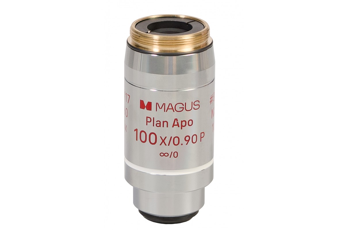 Увеличение объектива составляет 100 крат, апертура – 0,90. Для получения изображения с оптимальным сочетанием разрешения и приближения рекомендует использовать объектив совместно с окулярами 10х. Объектив спроектирован для работы без покровного стекла, парфокальная высота – 60 мм. Не предназначен для иммерсионных исследований, имеет пружинящую оправу передней линзы.