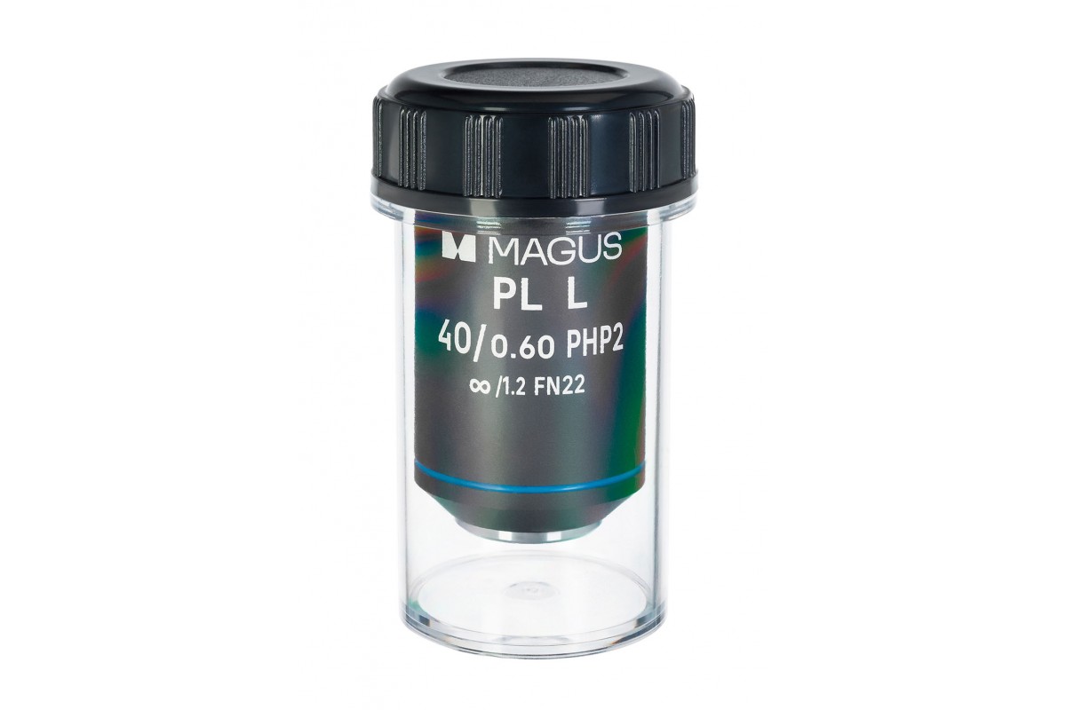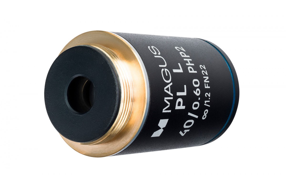 Объектив обладает увеличением в 40 раз и пределом разрешения 0,46 мкм. Вместе с окулярами с увеличением от 7,5 до 15 крат он создаст полезное увеличение микроскопа от 300 до 600 крат. Использовать окуляры с другой кратностью не рекомендуется, поскольку либо изображение не будет достаточно подробным, либо увеличение будет чрезмерным для системы и не повлияет на результат.