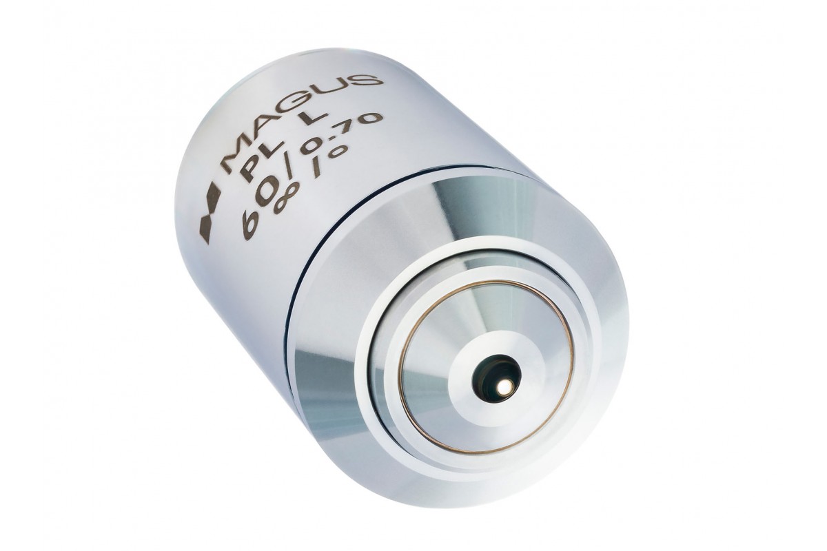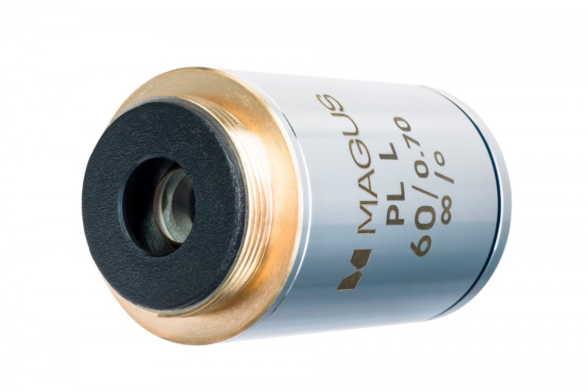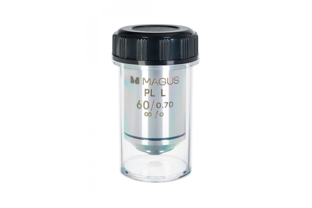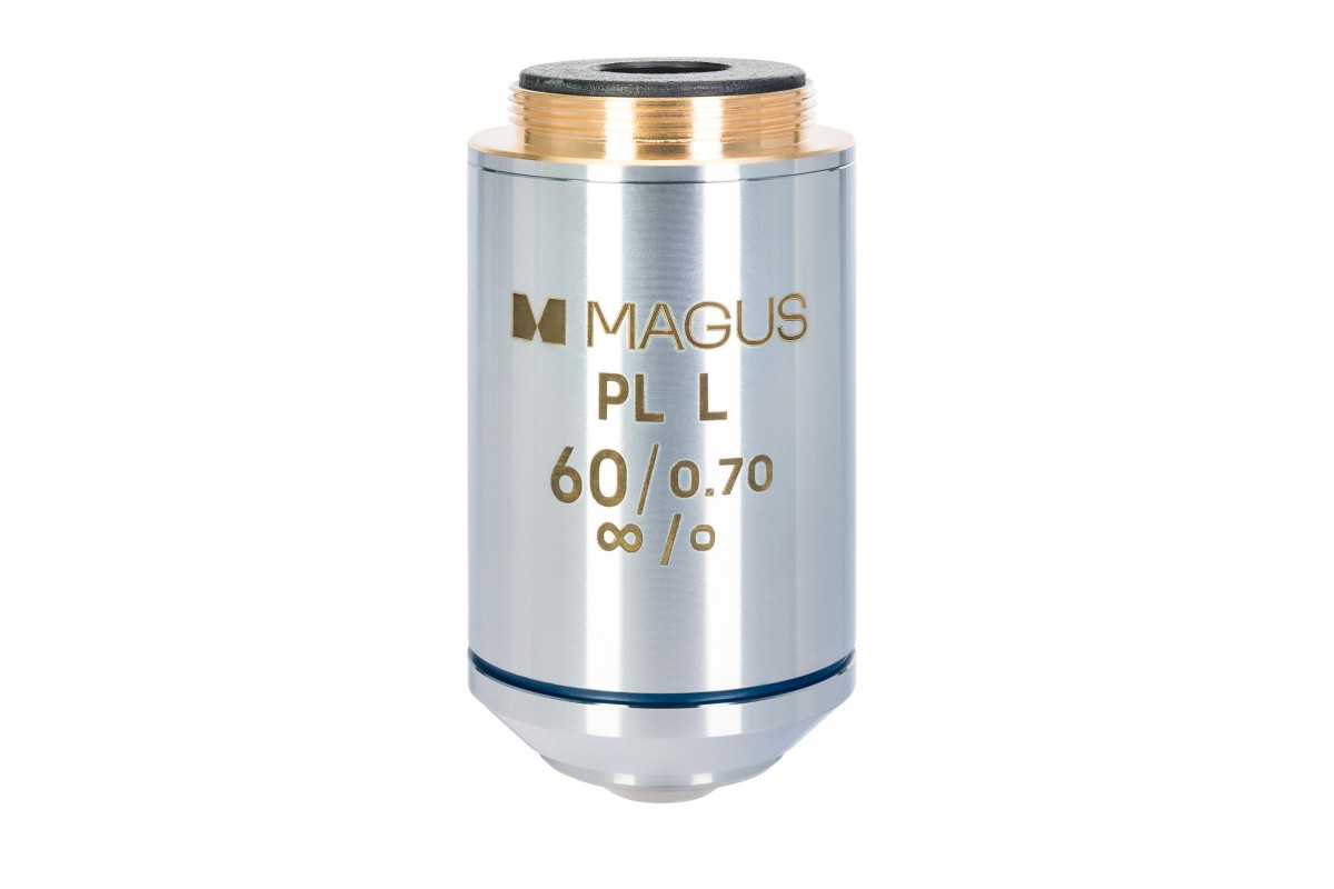 Кратность объектива – 60х. Полезное увеличение микроскопа с установленным объективом 60PLL находится в промежутке от 350х до 700х. С меньшей кратностью не удастся разглядеть мелких деталей, а большая не даст новой информации. Получить полезное увеличение можно при комбинации объектива с окулярами от 5х до 15х. Модель объектива 60PLL имеет предел разрешения 0,39 мм.