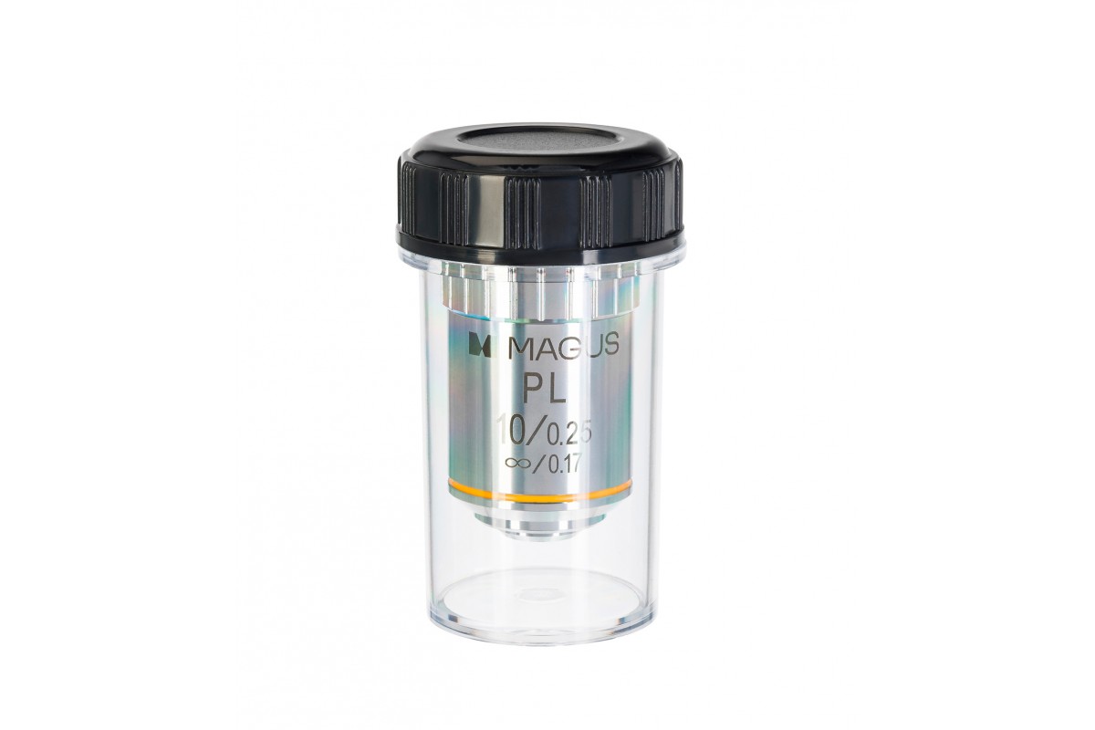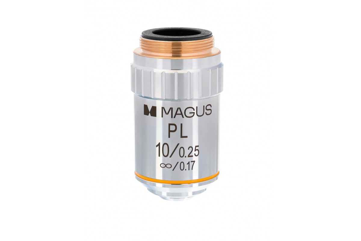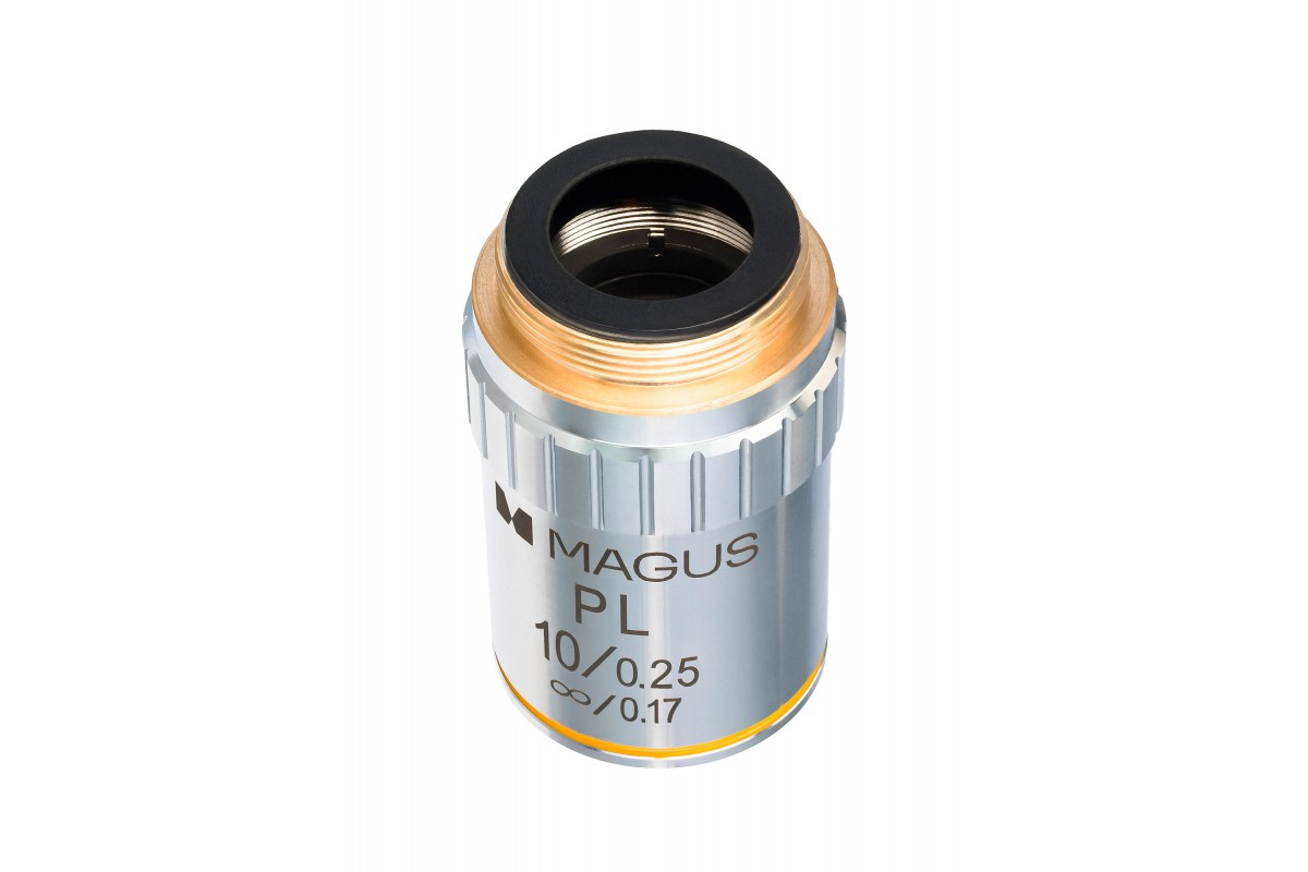 Планахроматическая оптическая конструкция избавляет от хроматизма на двух спектральных волновых диапазонах и от сферических искажений на одном. Поле плоское на 90% диаметра. Объектив MAGUS MP10 обеспечивает полезное увеличение микроскопа в диапазоне от 125 до 250 крат, поэтому наилучшее по детализации и четкости изображение показывает совместно с окулярами, увеличение которых составляет от 12,5 до 25 крат. Для сканирования образца возможно использование с окулярами 10х/22 мм, поле зрения при этом составит 2,2 мм.