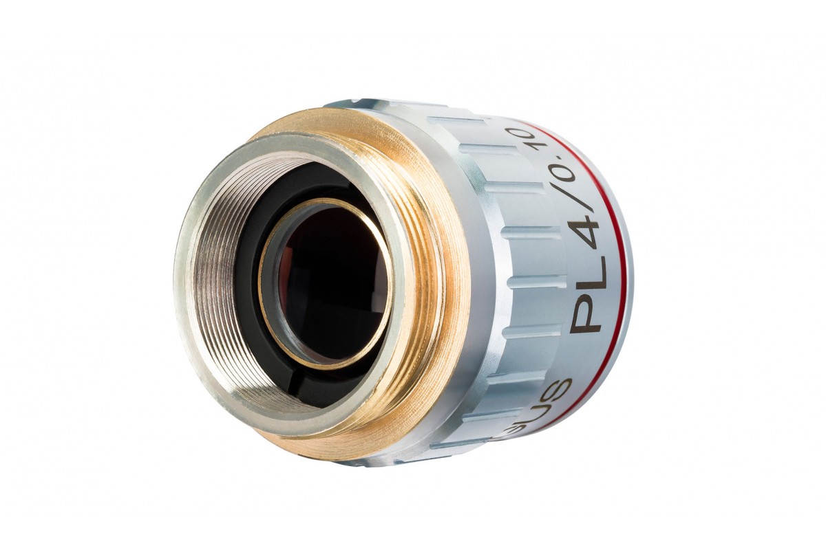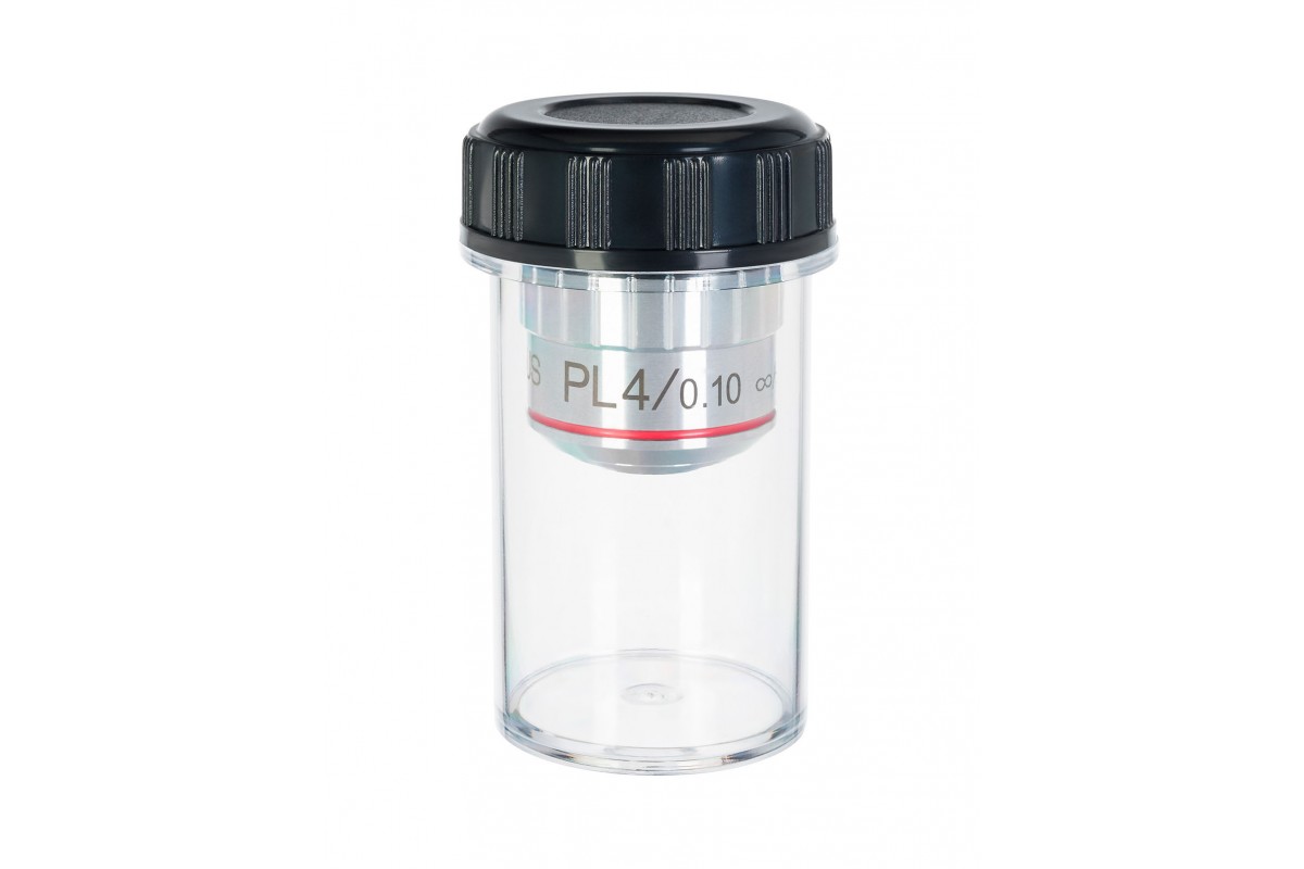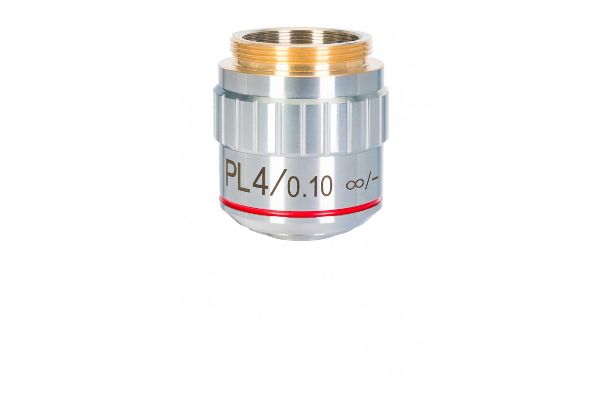 Объектив с увеличением 4 крата и пределом разрешения 2,75 мкм. Ориентирован на тубус с длиной «бесконечность», парфокальная высота 45 мм. Рассчитан для работы с образцами как с покровным стеклом, так и без него. Так как рабочее расстояние составляет 21 мм объектив может использоваться и на инвертированных микроскопах для изучения образцов в лабораторной посуде, толщина дна которой составляет 1,2 мм.