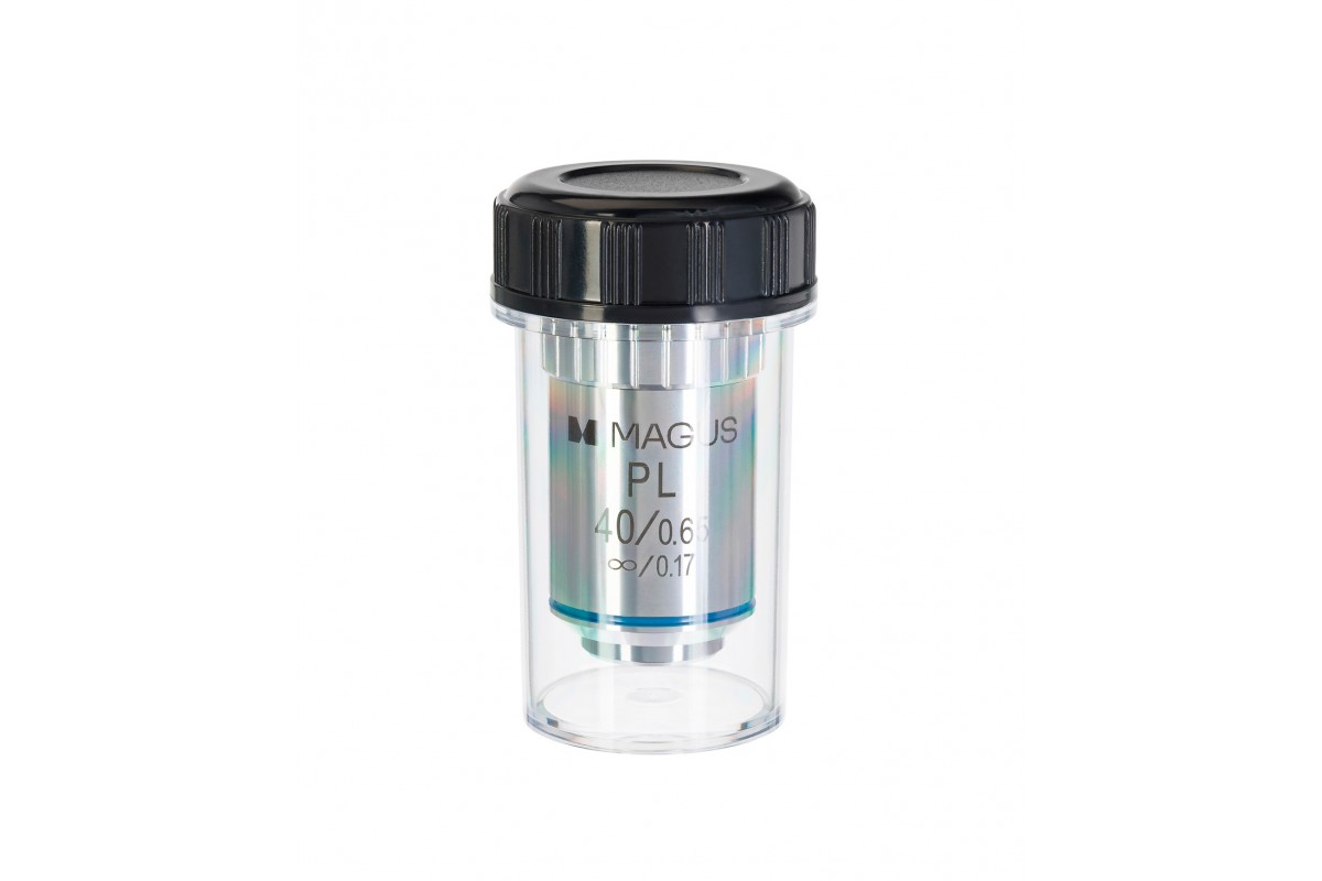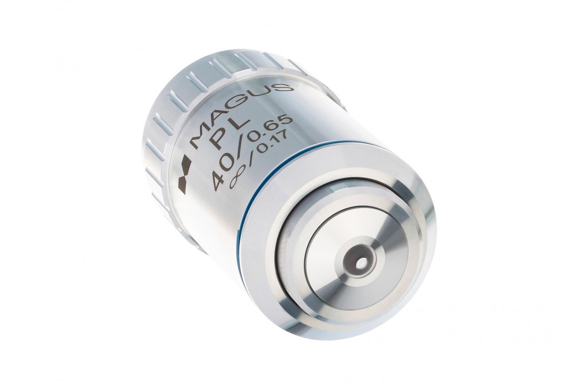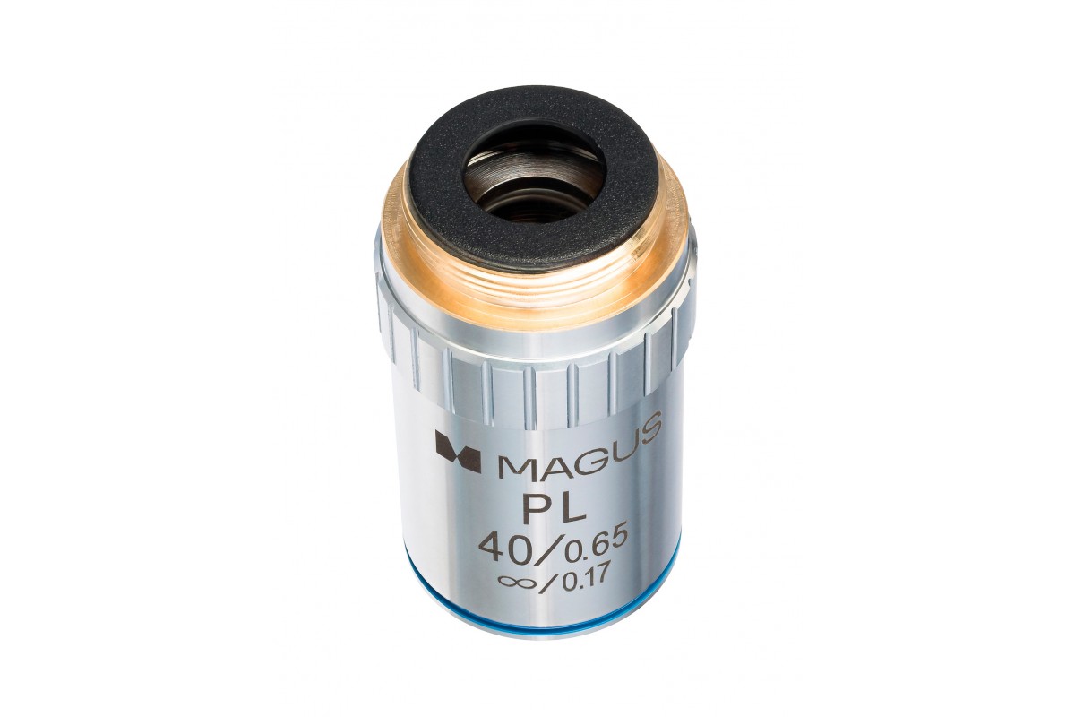 40-кратный объектив MAGUS MP40 с апертурой 0,65 и корректировкой на бесконечность используется для работы в светлом поле. Объектив является планахроматом, т. е. корректирует сферические искажения для одного цвета, хроматические – для двух цветов, а кривизну поля – на 90% диаметра наблюдаемой области. Объектив имеет парфокальную высоту 45 мм и совместим с большим количеством биологических и люминесцентных микроскопов MAGUS. Предел разрешения составляет 0,43 мкм, поле зрения с окуляром 10х/22 мм – 0,55 мм. При работе образец требуется накрывать покровным стеклом толщиной 0,17 мм.