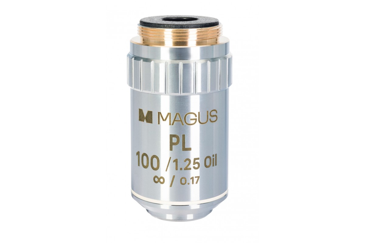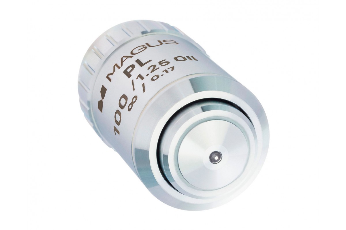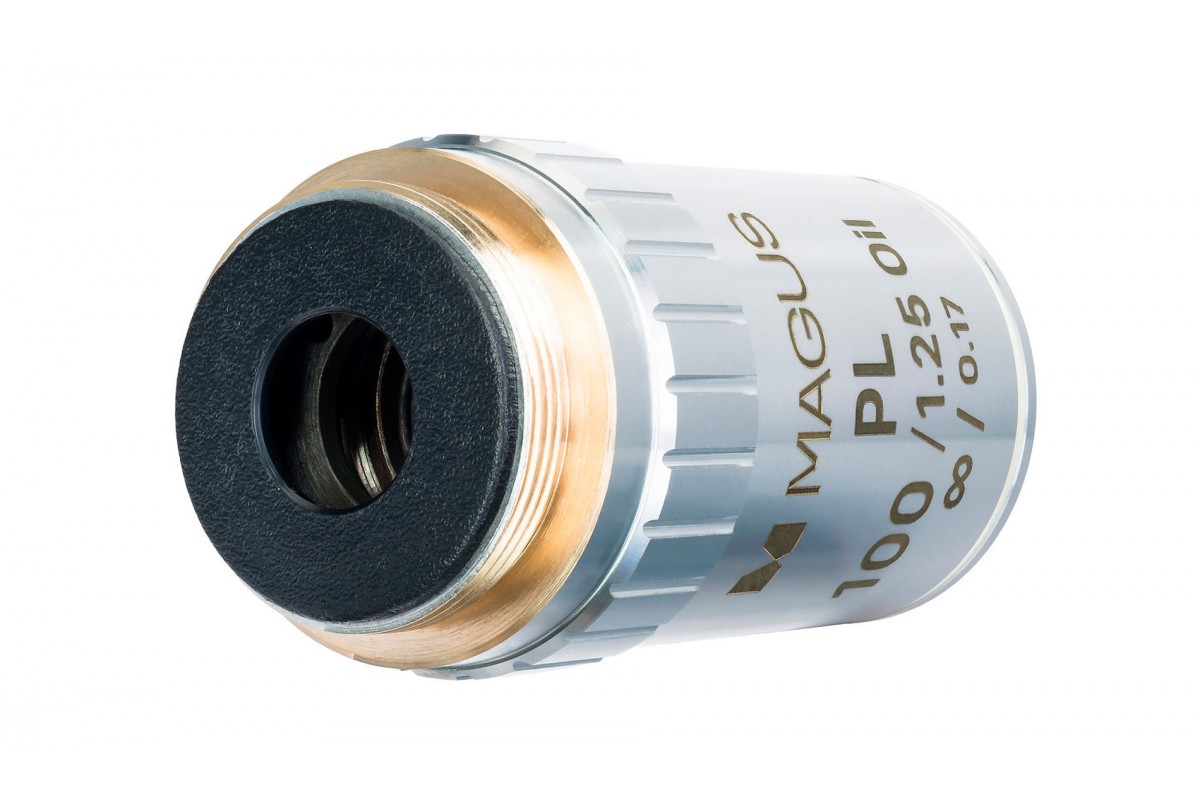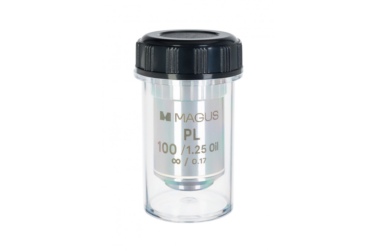 Кратность этой модели – 100х. Наименьшее расстояние между двумя различимыми точками – 0,22 мкм. В сочетании с окулярами с увеличением от 5 до 15 крат объектив SF100 OIL дает полезное увеличение в интервале 625–1250х. Коррекция кривизны поля создает чистое, сфокусированное и геометрически правильное изображение на площади 90% поля зрения. Объектив хорошо сочетается с цифровой камерой и окулярами с полем зрения 22 мм. Окуляр с характеристиками 10х/22 мм сформирует поле зрения шириной 0,22 мм.