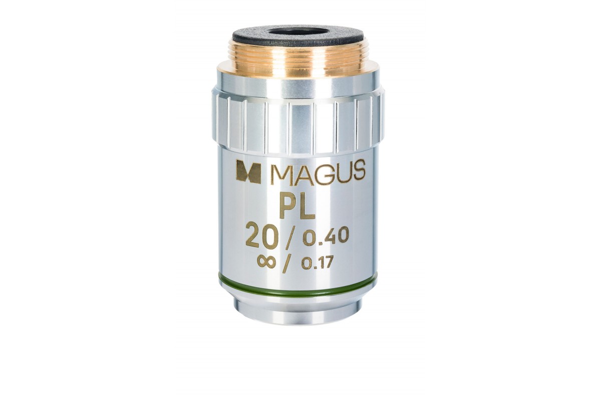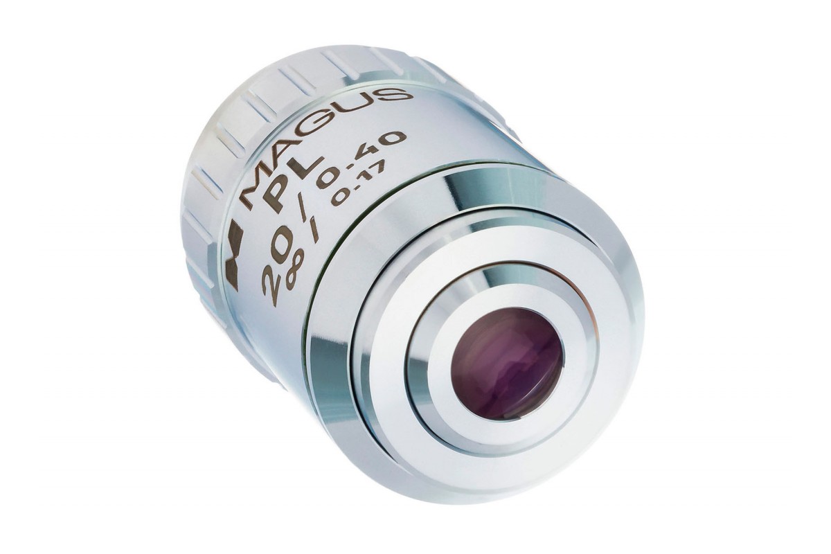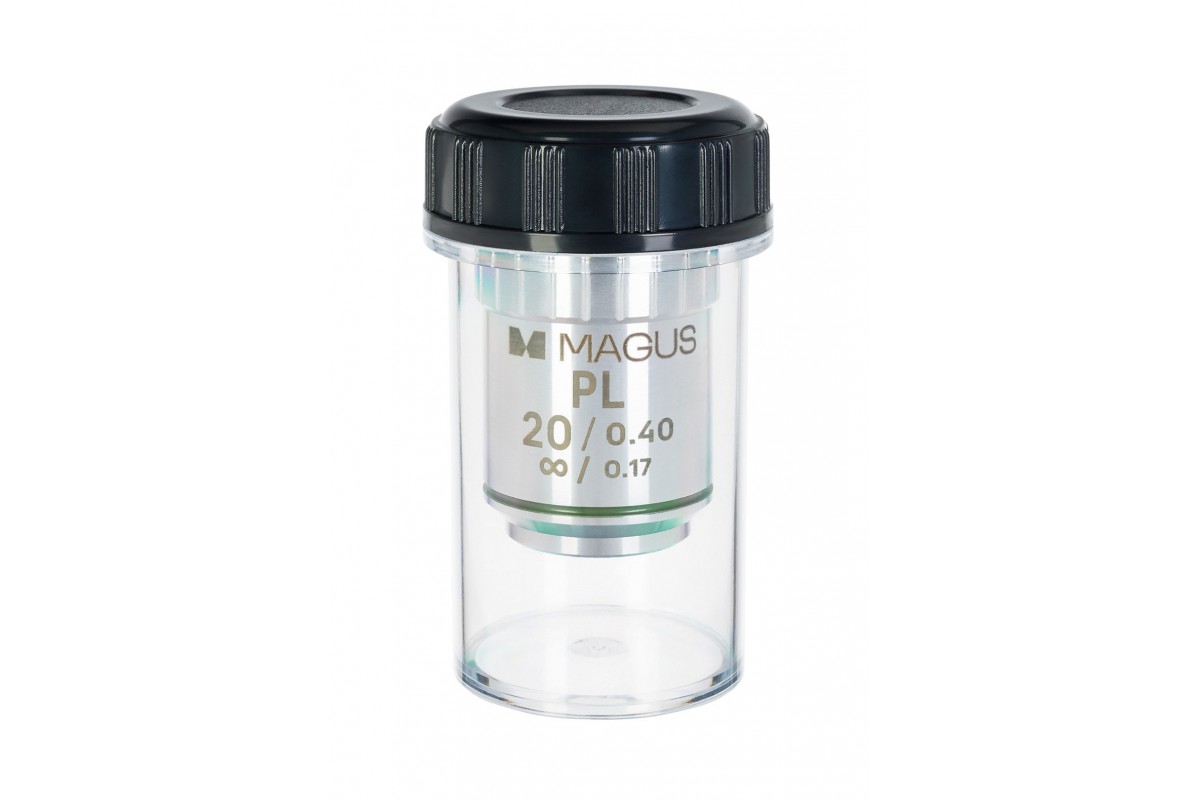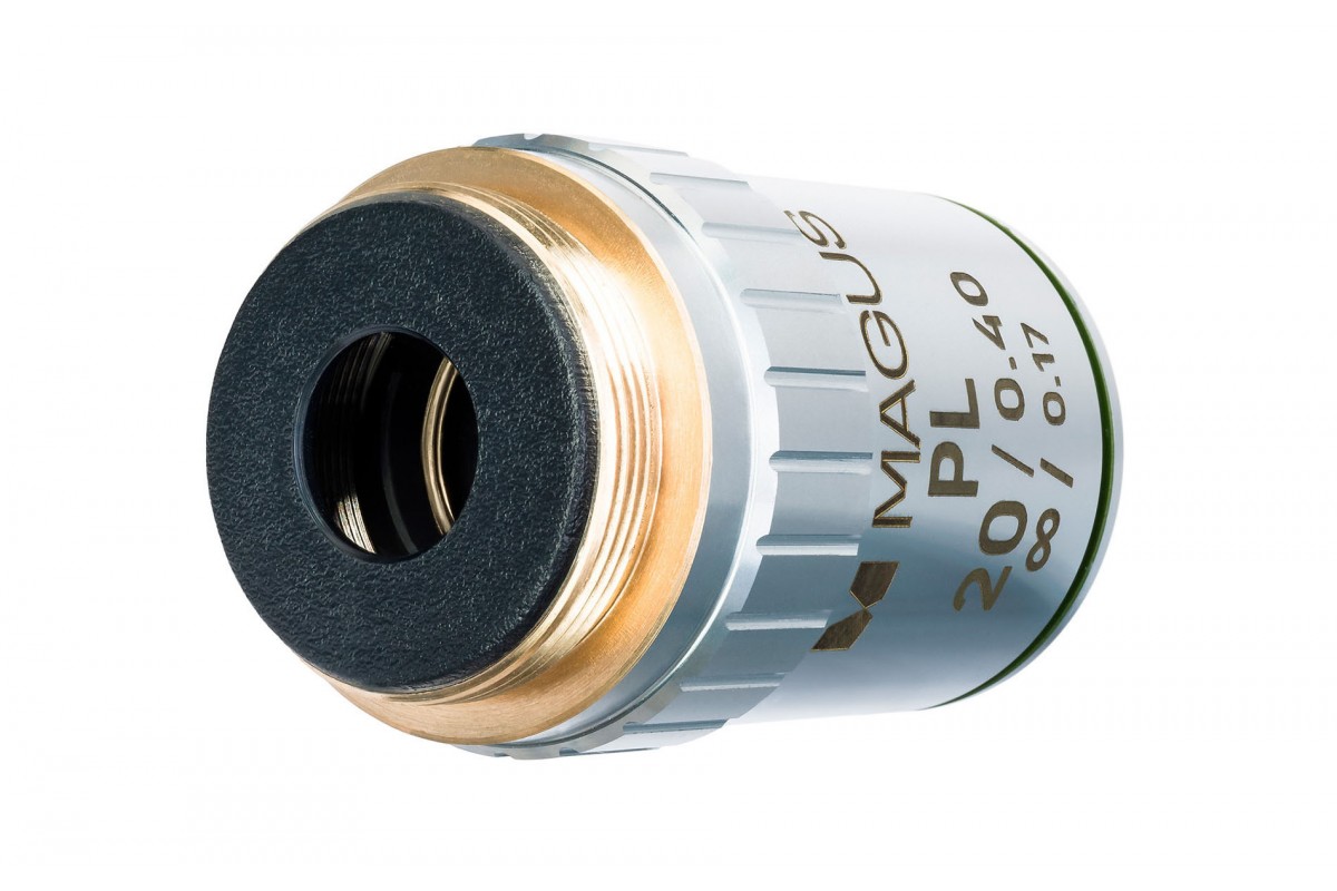 Объектив дает увеличение 20 крат при пределе разрешения 0,69 мкм. Эту модель рекомендуется сочетать с окулярами кратностью от 10х до 20х. Вместе они произведут полезное увеличение микроскопа с нижним порогом 200х и верхним 400х. Планахроматическая оптика дает широкое поле изображения, поэтому ее хорошо комбинировать с окулярами с полем зрения 22 мм. Окуляр 10х/22 мм в этом сочетании даст поле зрения 1,1 мм.