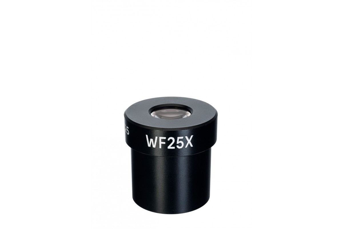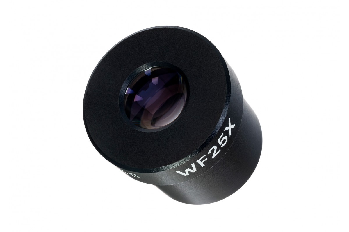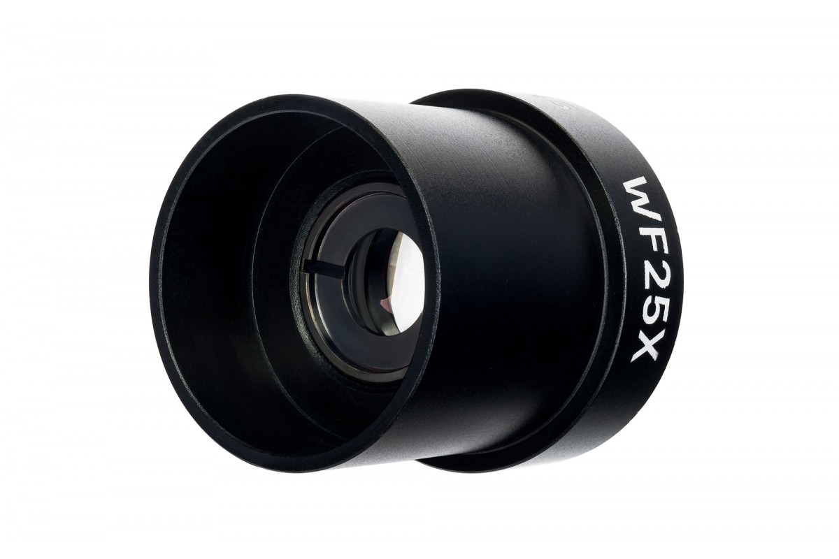 Окуляр для стереомикроскопа SE25 обладает кратностью 25х и устанавливается в окулярную трубку на 30 мм. Устройство не имеет механизма подстройки под миопию или гиперметропию глаз пользователя, поэтому комфортно работать с этим окуляром смогут исследователи с одинаковым зрением на разных глазах. Если корректировка диоптрий необходима, используйте настройку на окулярном тубусе микроскопа (при ее наличии).