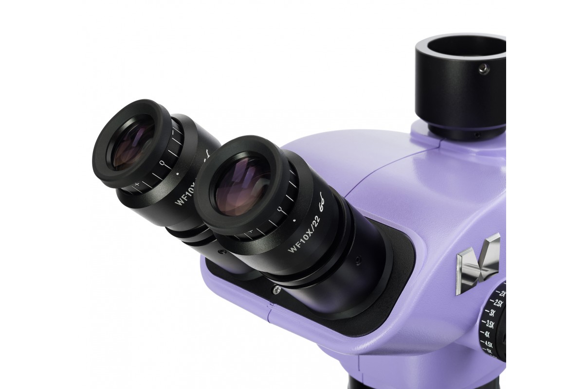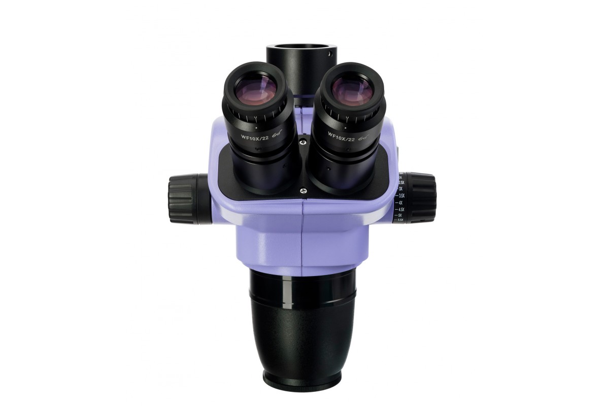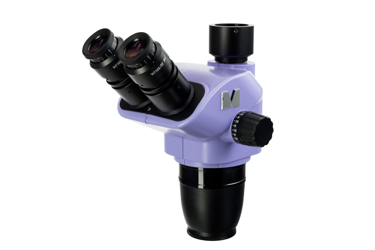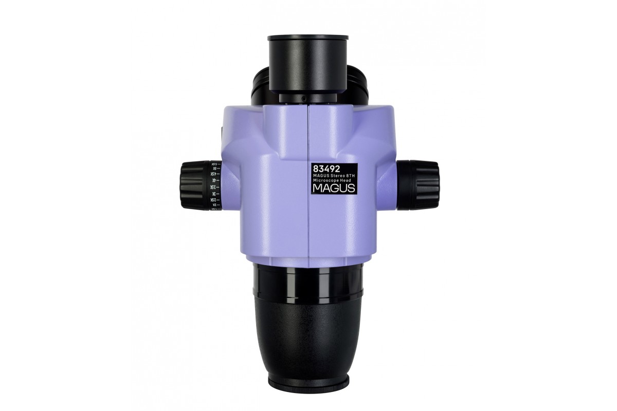Объектив плавно изменяет увеличение в 8,4 раза без потери фокуса. Оптическая система формирует прямое (неперевернутое) объемное изображение. Дополнительные насадки на объектив изменяют диапазон увеличения, поле зрения и рабочее расстояние микроскопа.