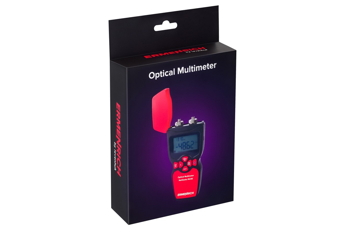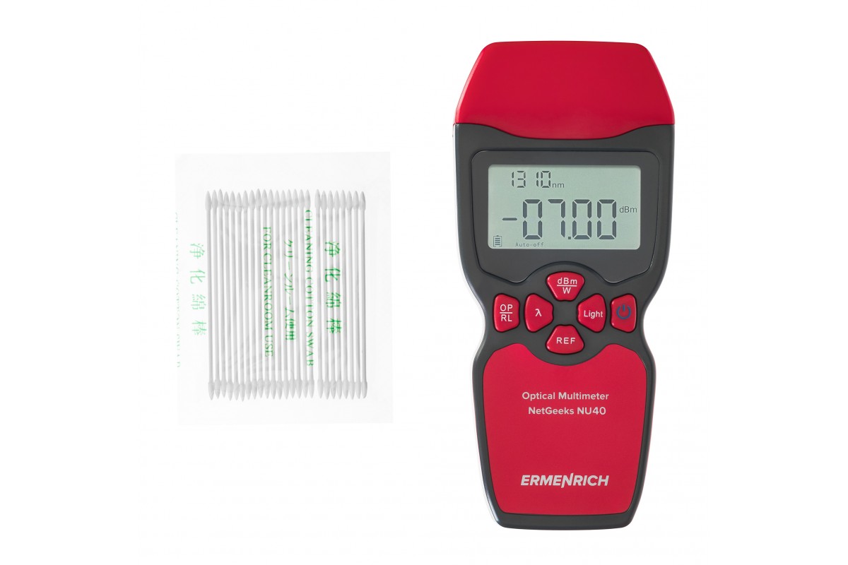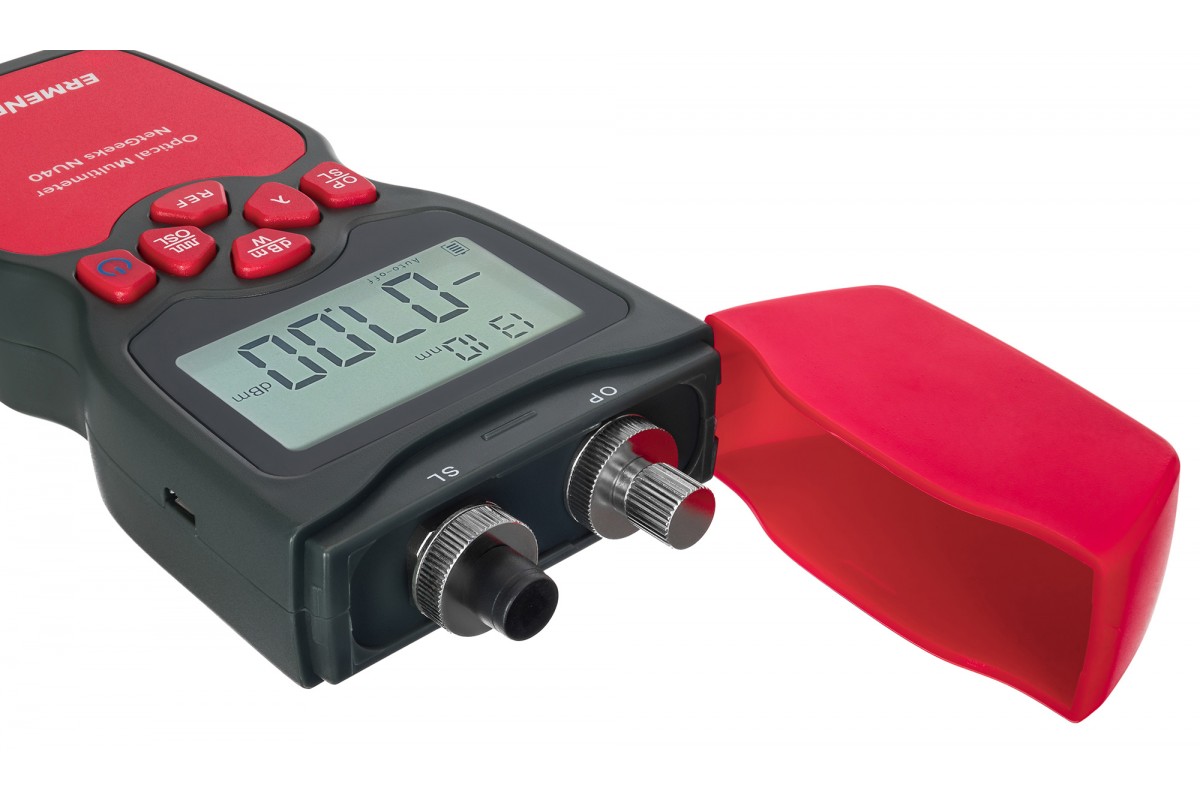 Мультиметр Ermenrich NetGeeks NU40 подходит для тестирования одномодовых и многомодовых кабелей. Для подключения к линии используется интерфейс FC, поддерживаются дополнительные интерфейсы SC и ST. Измерения выполняются в дБм или Вт, единица измерения выбирается отдельной кнопкой. С помощью отдельной кнопки можно установить опорный уровень для быстрого определения потерь. Результат с указанием единиц измерения отображается на монохромном дисплее с подсветкой. Прибор питается от 3 батареек типа AAA (не входят в комплект поставки).