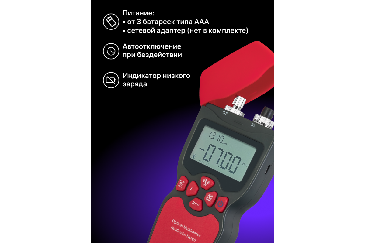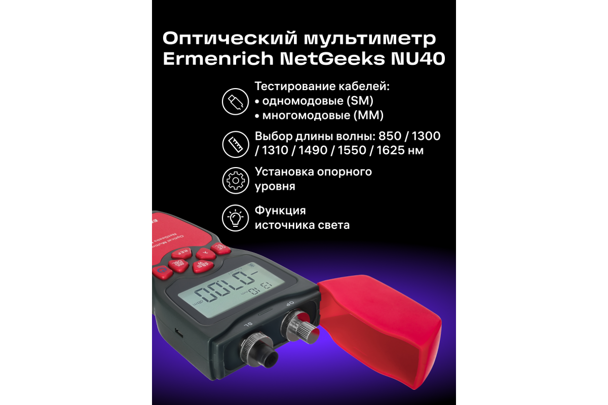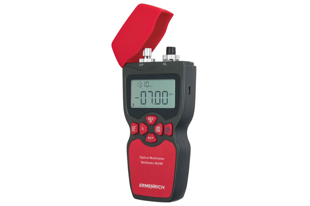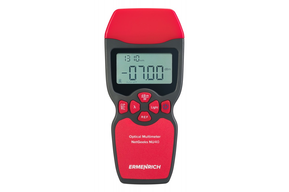 Мультиметр Ermenrich NetGeeks NU40 подходит для тестирования одномодовых и многомодовых кабелей. Для подключения к линии используется интерфейс FC, поддерживаются дополнительные интерфейсы SC и ST. Измерения выполняются в дБм или Вт, единица измерения выбирается отдельной кнопкой. С помощью отдельной кнопки можно установить опорный уровень для быстрого определения потерь. Результат с указанием единиц измерения отображается на монохромном дисплее с подсветкой. Прибор питается от 3 батареек типа AAA (не входят в комплект поставки).