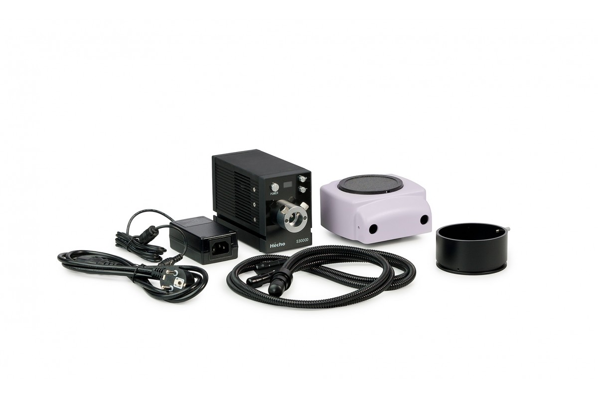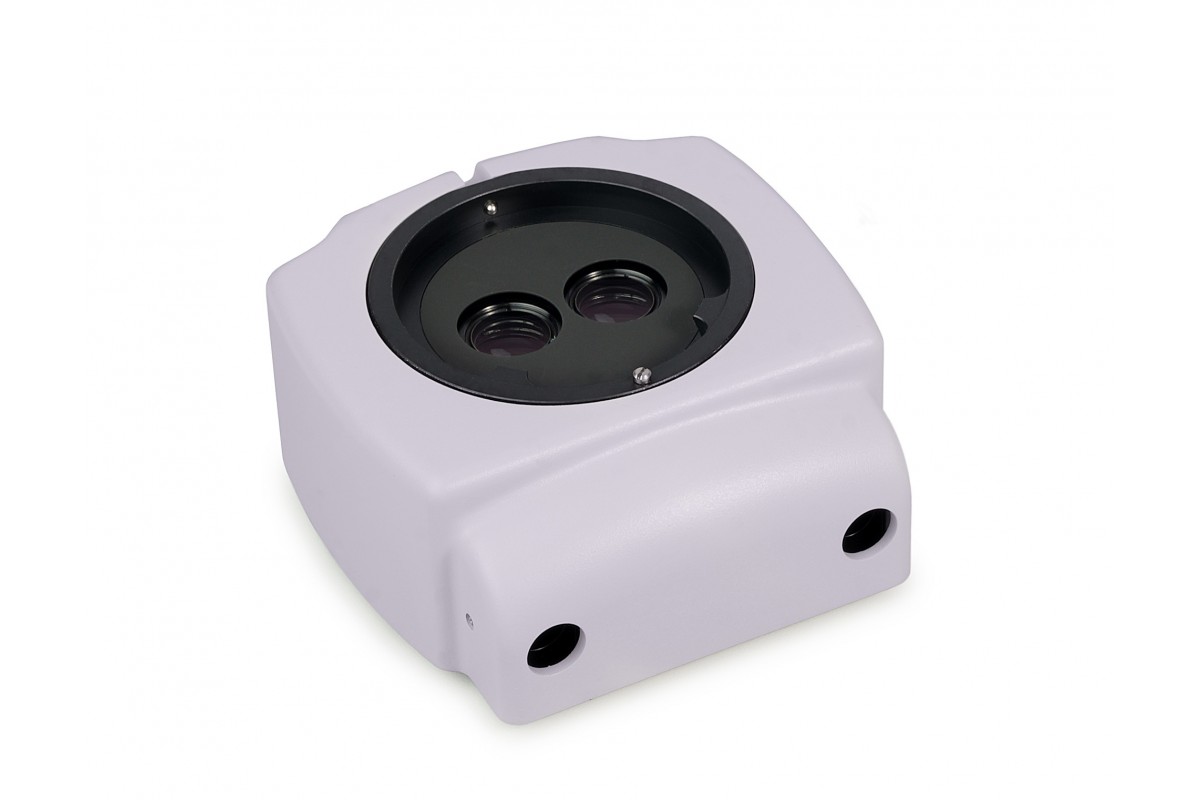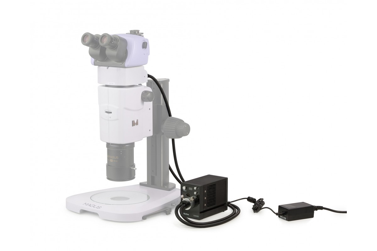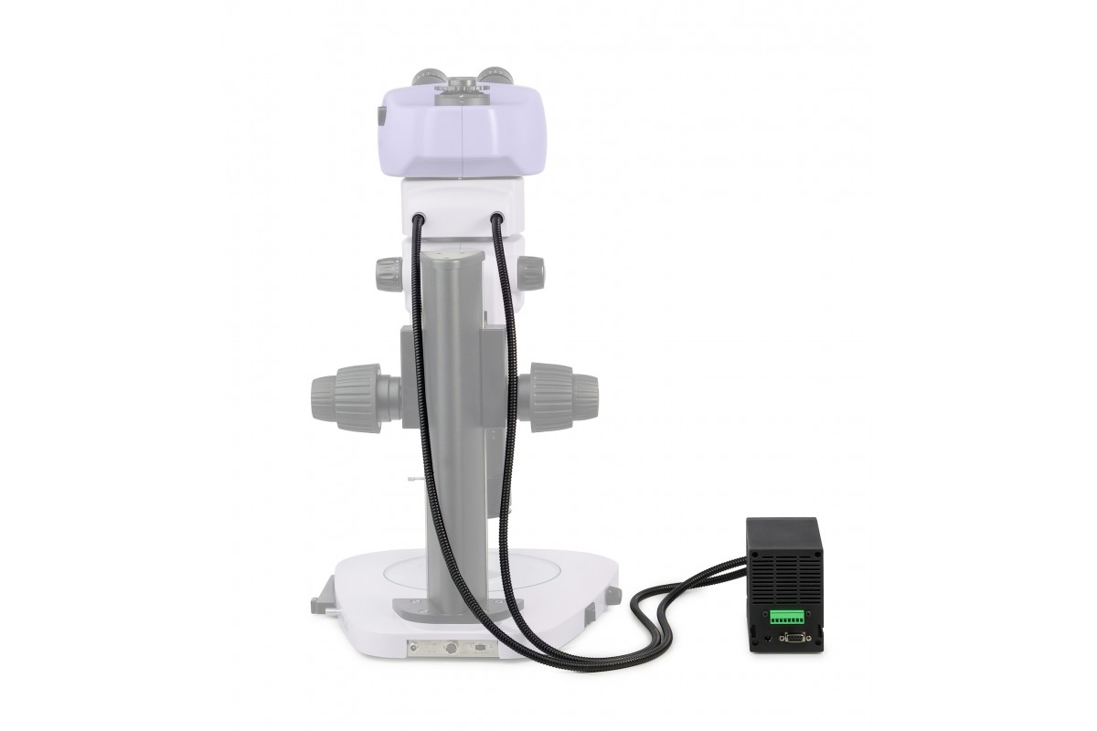 Источник света находится в блоке питания и устанавливается на расстоянии от микроскопа. К осветителю присоединяется двойной световод, а между визуальной насадкой и панкратическим объективом монтируется вставка.