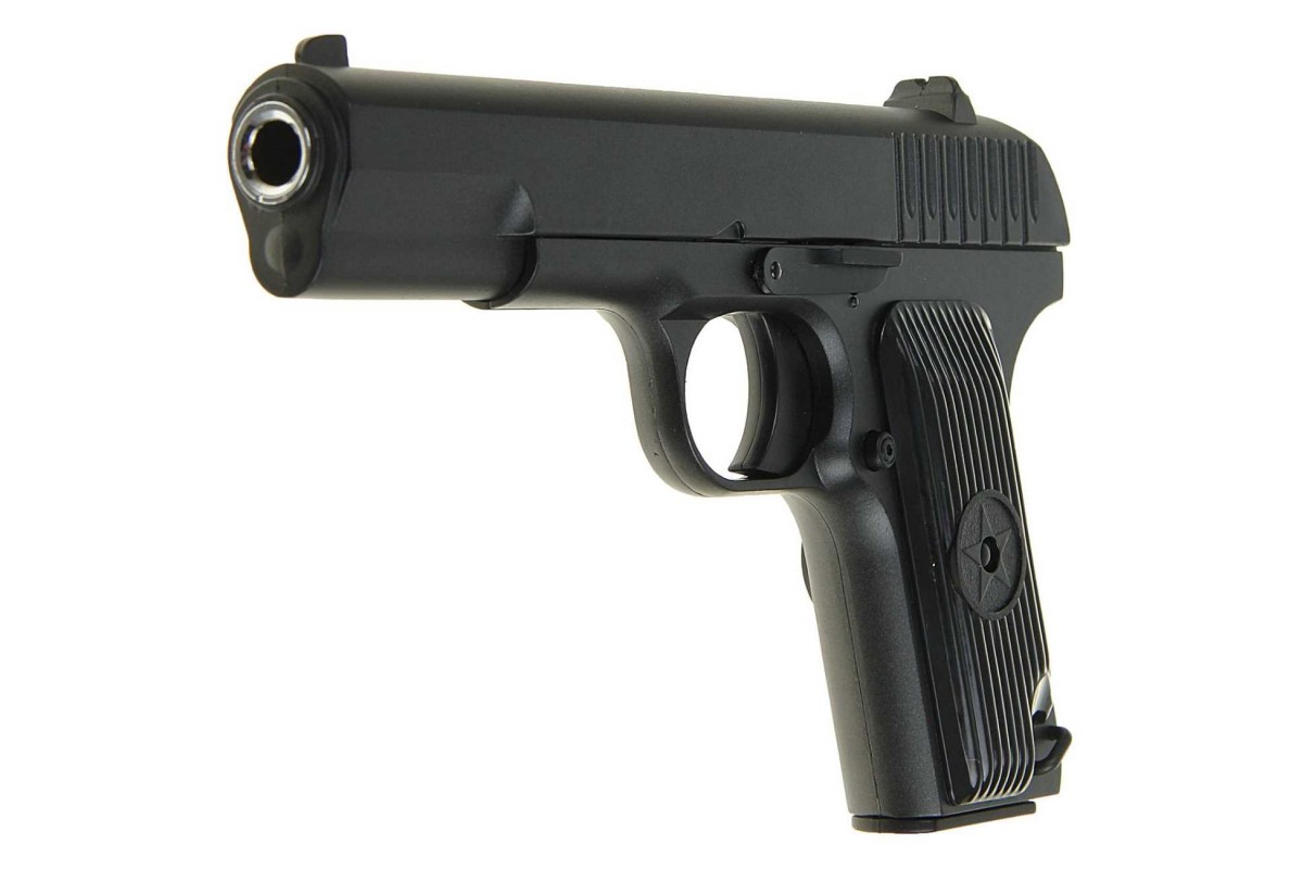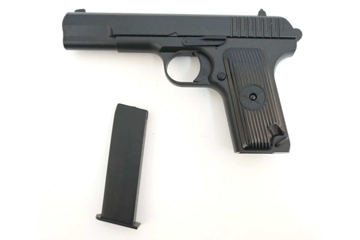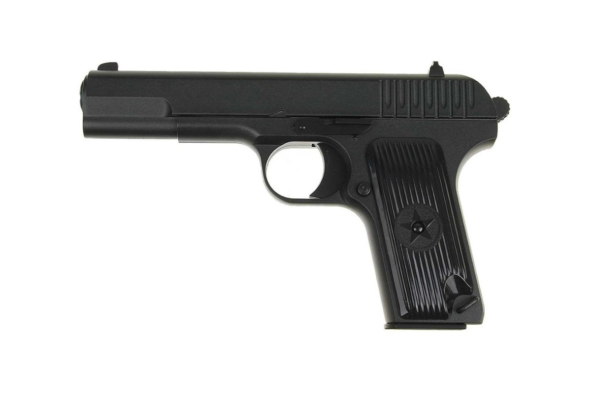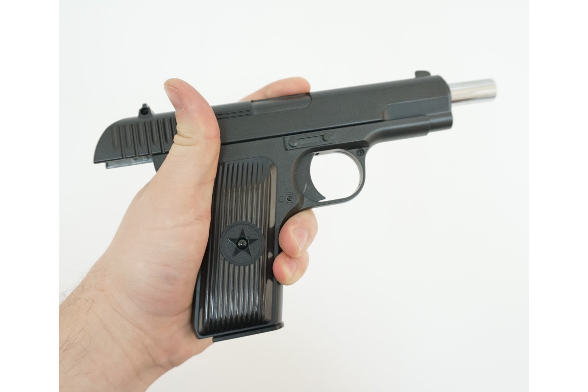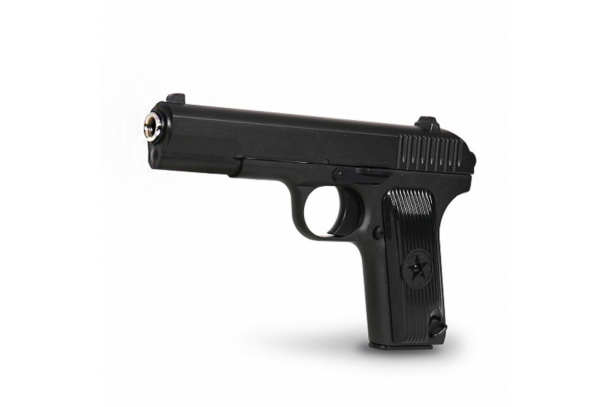 - Пистолет с пружинным механизмом и металлическим корпусом.