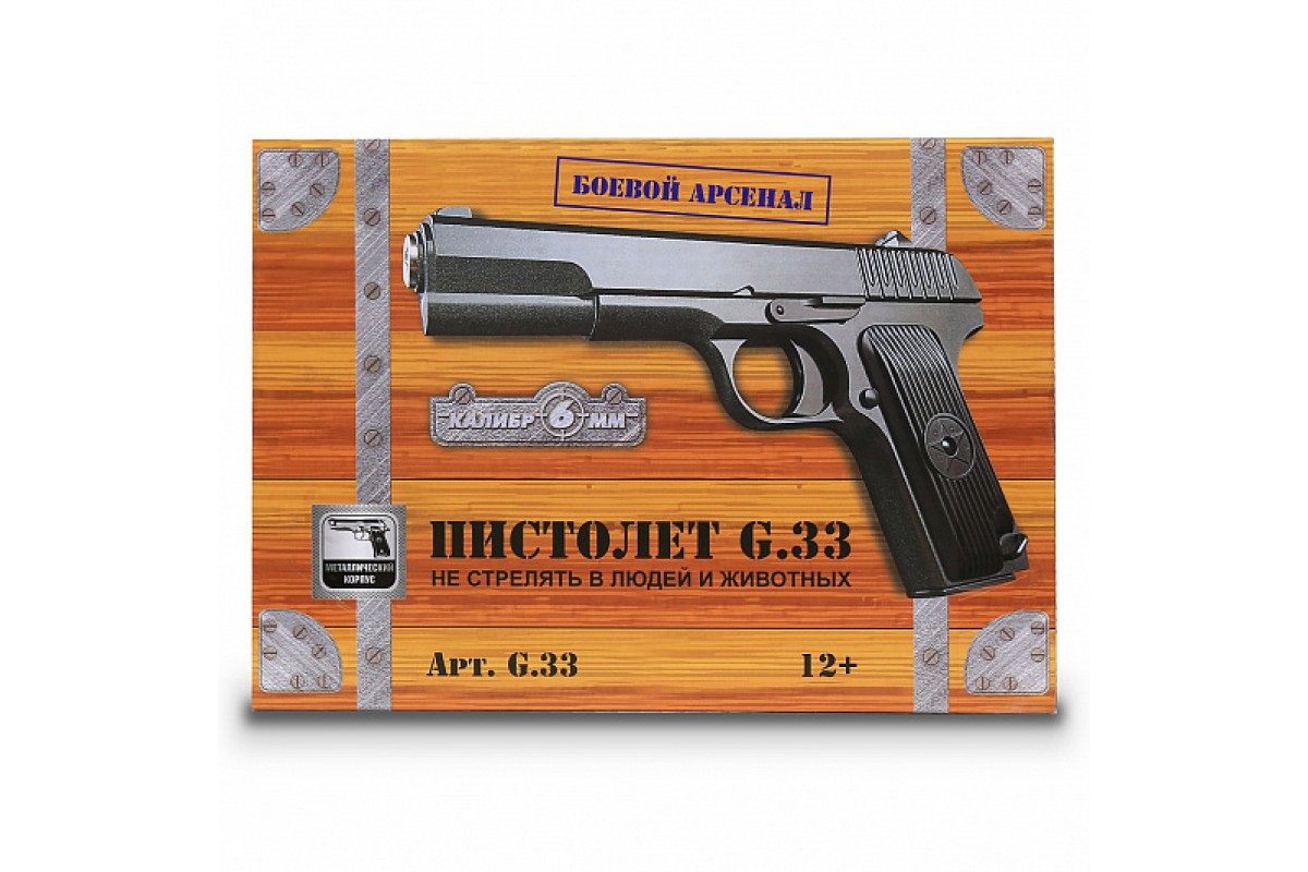 Пистолет металлический (пневматика, 20,5 см) - G.33 - это качественная спринговая страйкбольная модель классического пистолета , изготовленная из качественного цинкового сплава и пластика. Цвет черный. Начальная скорость выстрела шарика 50-59 метров в секунду.