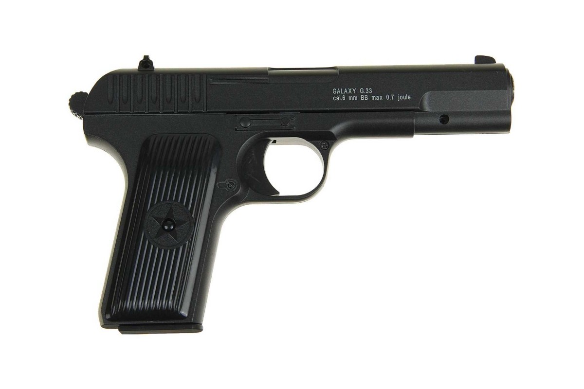 Пистолет страйкбольный Galaxy G.33 представляет собой игровую версию пистолета . Он изготовлен из высокопрочного пластика и оцинкованного металла, не подвержен коррозии и даже не нуждается в регулярной чистке, будучи пригодным к эксплуатации в игре сразу после вскрытия упаковки.