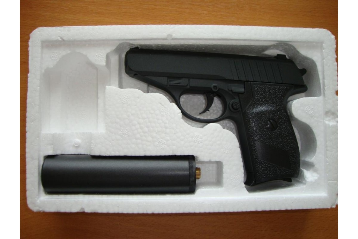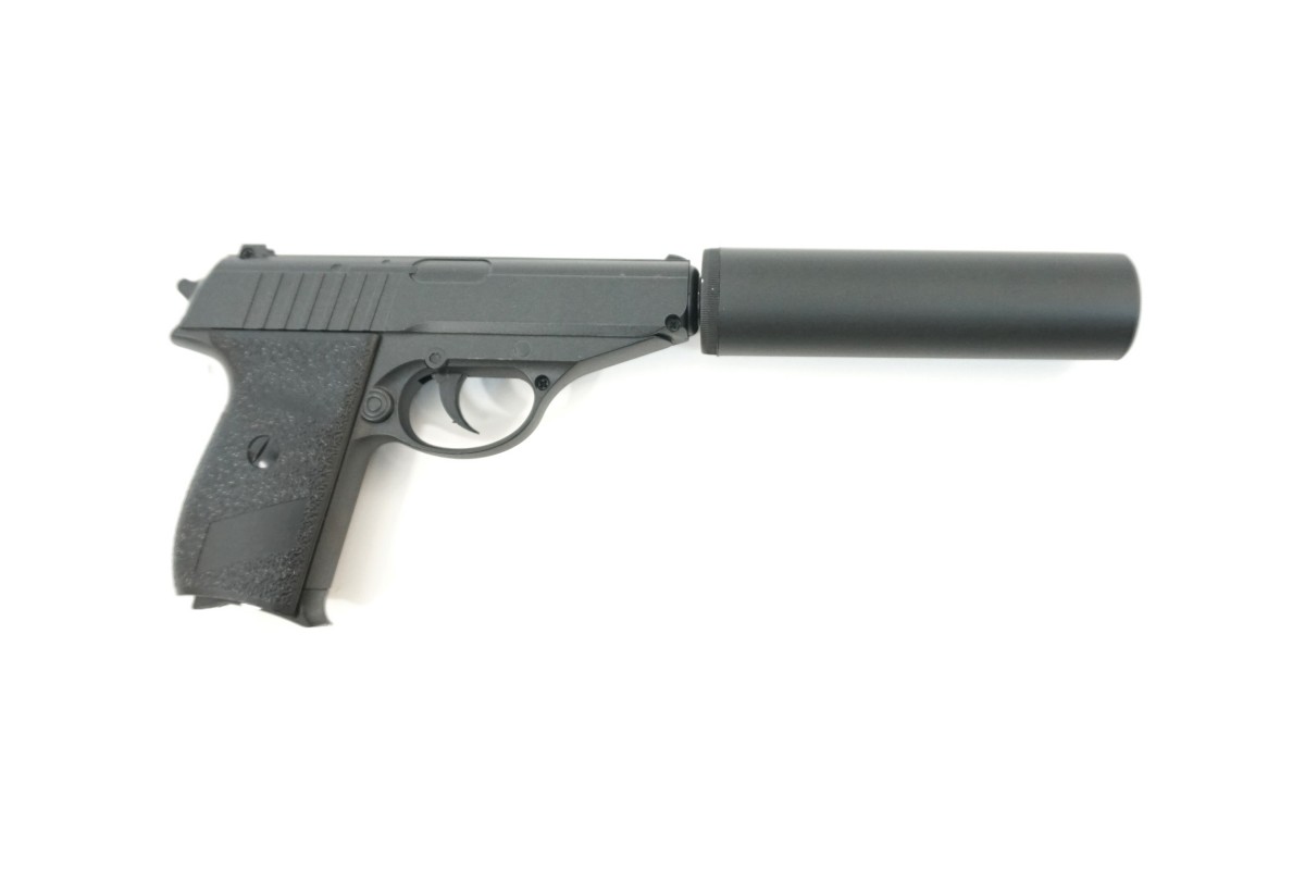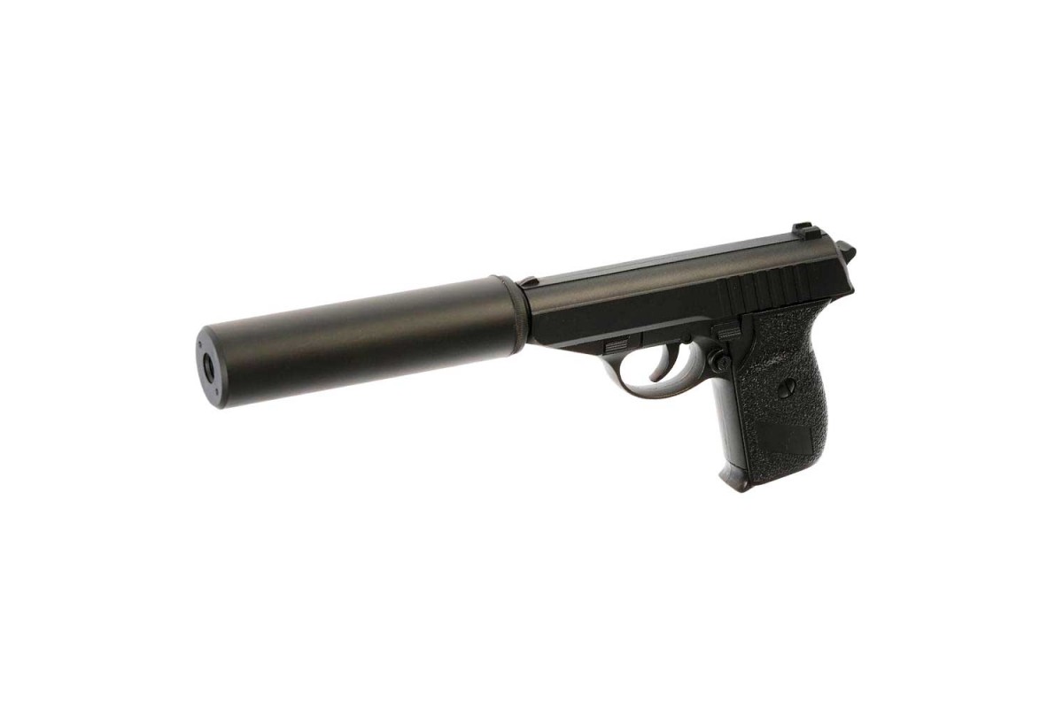 Пистолет пневматика металлический 15 см с глушителем - G.3A - это качественная спринговая страйкбольная модель классического пистолета с имитацией глушителя, изготовленная из качественного цинкового сплава и пластика. Начальная скорость выстрела шарика 60-69 метров в секунду.