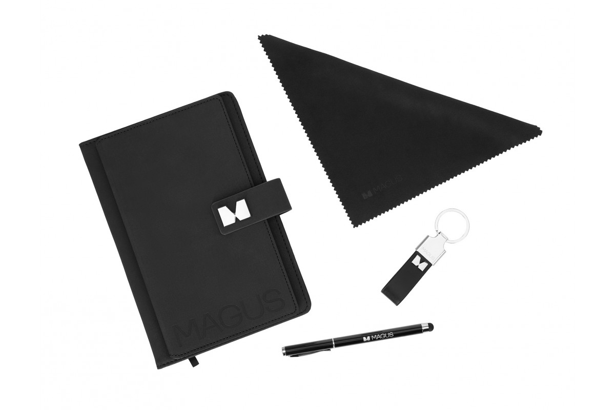 В подарочный набор MAGUS входит брендированная канцелярия, украшенная логотипом MAGUS, которую можно использовать ежедневно для ведения и хранения важных записей. Блокнот, салфетка для ухода за оптикой, ручка и брелок упакованы в фирменную коробку из плотного картона с матовым покрытием – лаконично и стильно.