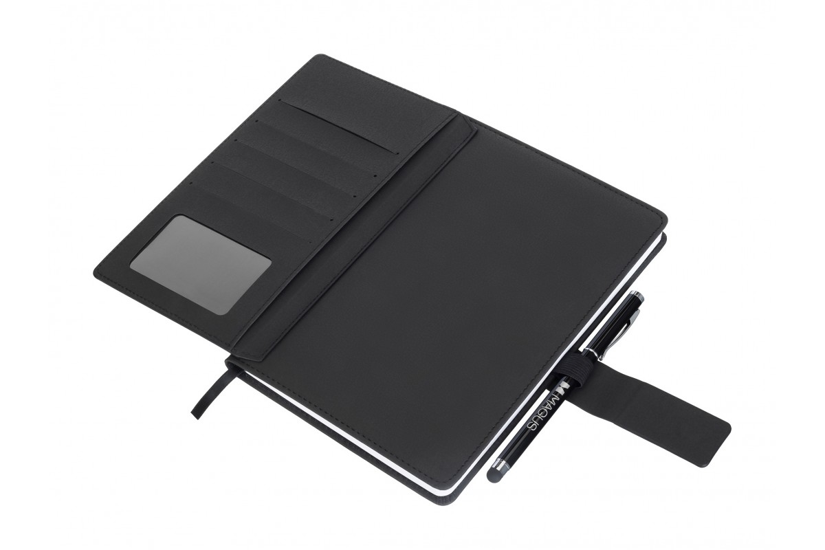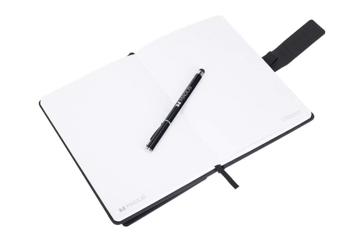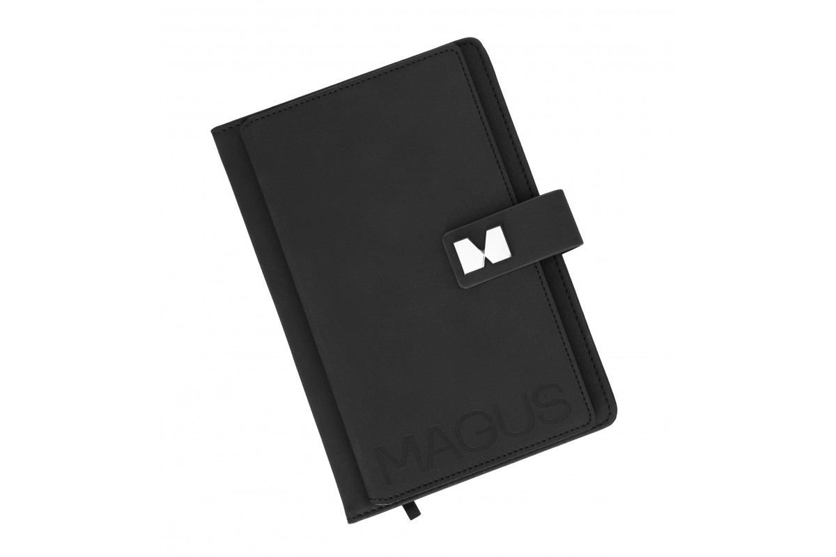 Блокнот имеет размеры 22х15 сантиметров – на страницах удобно вести большие по объему записи. Обложка блокнота изготовлена из матовой, тактильно приятной искусственной кожи. Закрывается блокнот на магнитный ремешок с металлическим шильдиком в виде логотипа MAGUS. Внутри лицевого декоративного форзаца находятся кармашки, в которых можно хранить визитки, карты и записки. Страницы в блокноте недатированные, нелинованные, выполнены из плотной белой бумаги.