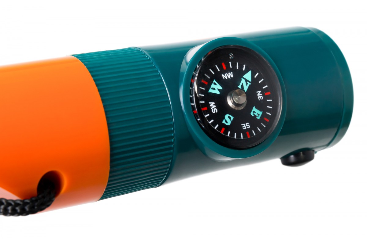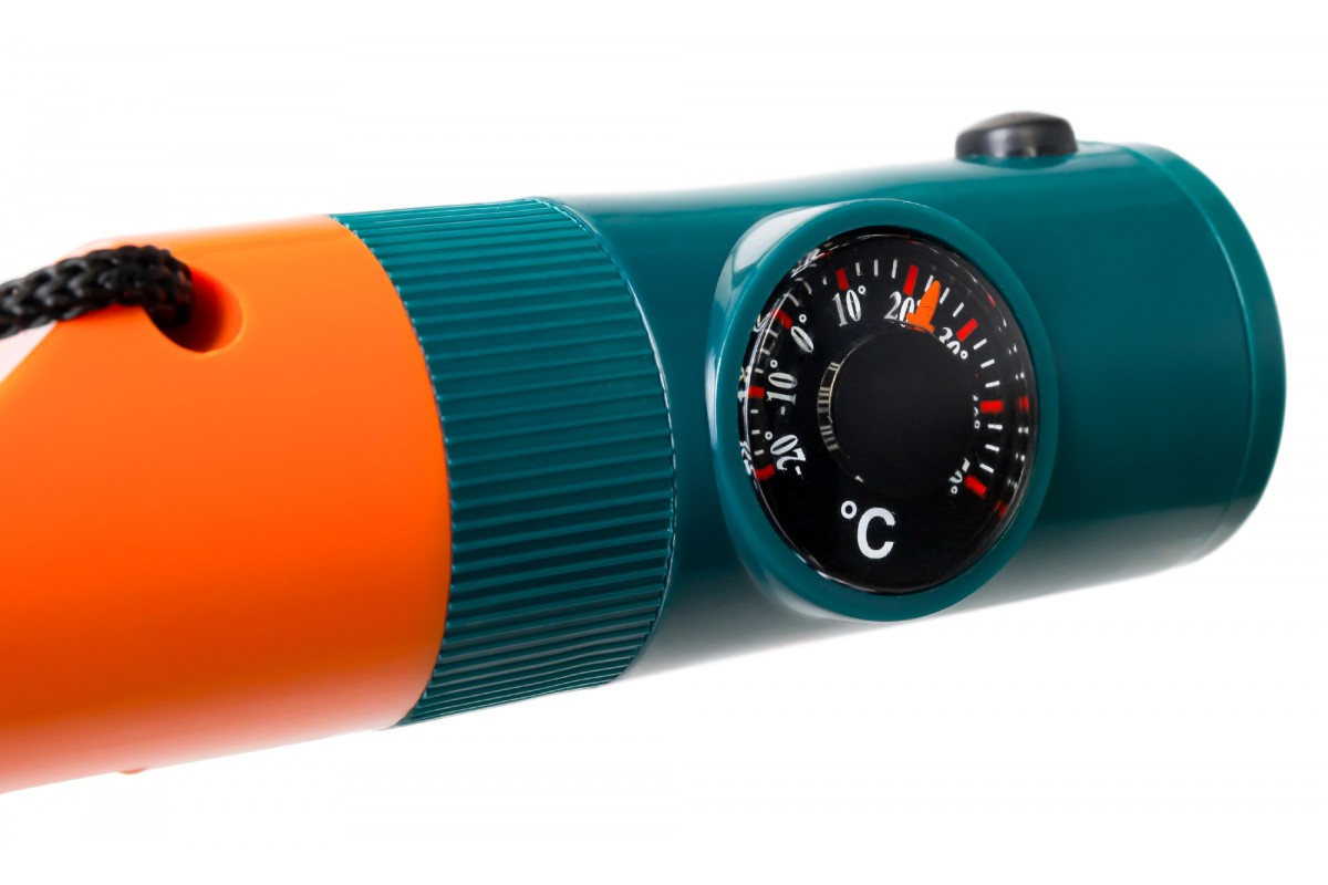 Достаточно лишь немного повернуть корпус – все аксессуары станут мгновенно доступны. Свисток и зеркальце расположены в первой части. Вторая секция – это небольшая лупа. А компас, термометр и фонарик ребенок найдет в последнем отделе устройства.