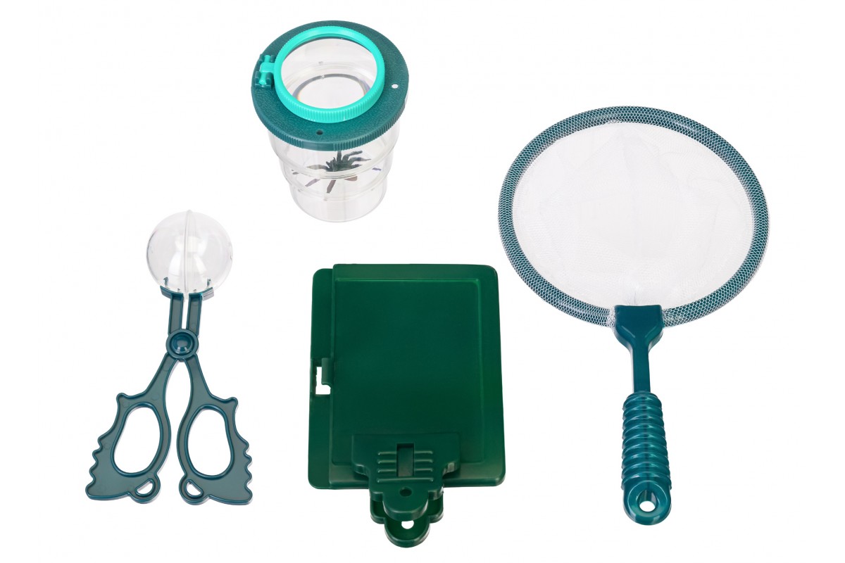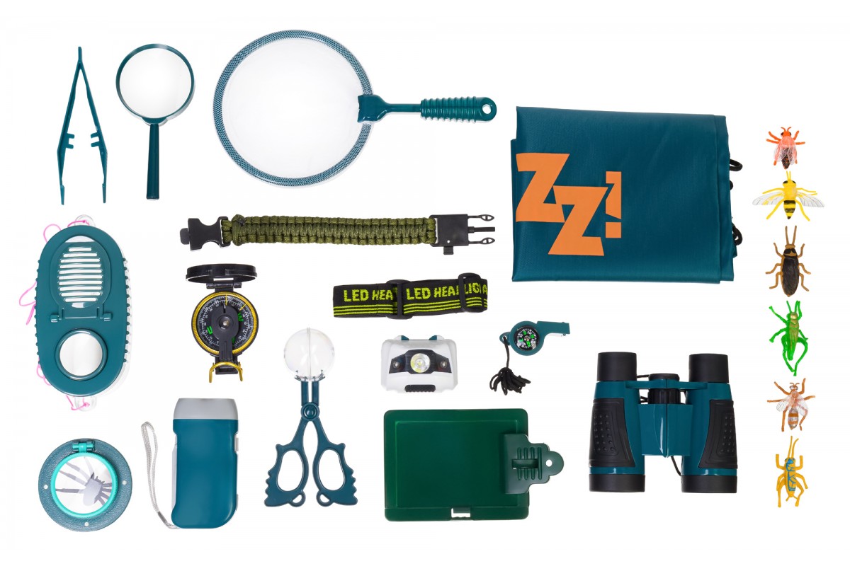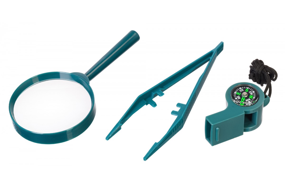 В многодневном походе пригодятся два светодиодных фонаря: налобный и динамо-фонарик, работающий без батареек. Для игр в выживальщиков отлично подойдет многофункциональный браслет-огниво. Также в наборе есть бинокль на призмах roof, компас и свисток. Что касается энтомологического снаряжения, это лупа-стакан, ручная ловушка, сачок и специальный пинцет. Есть здесь и универсальная ручная лупа. Делать маршрутные записи туриста и описывать интересные находки можно, используя блокнот-планшет.