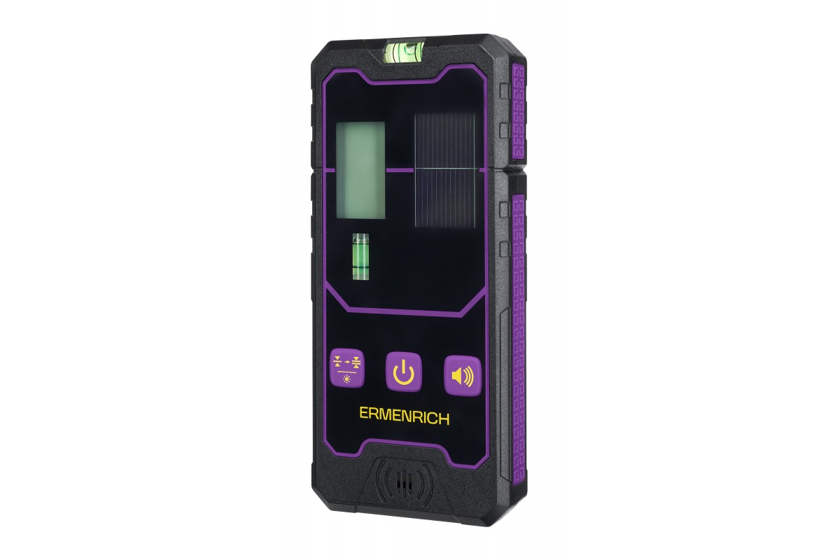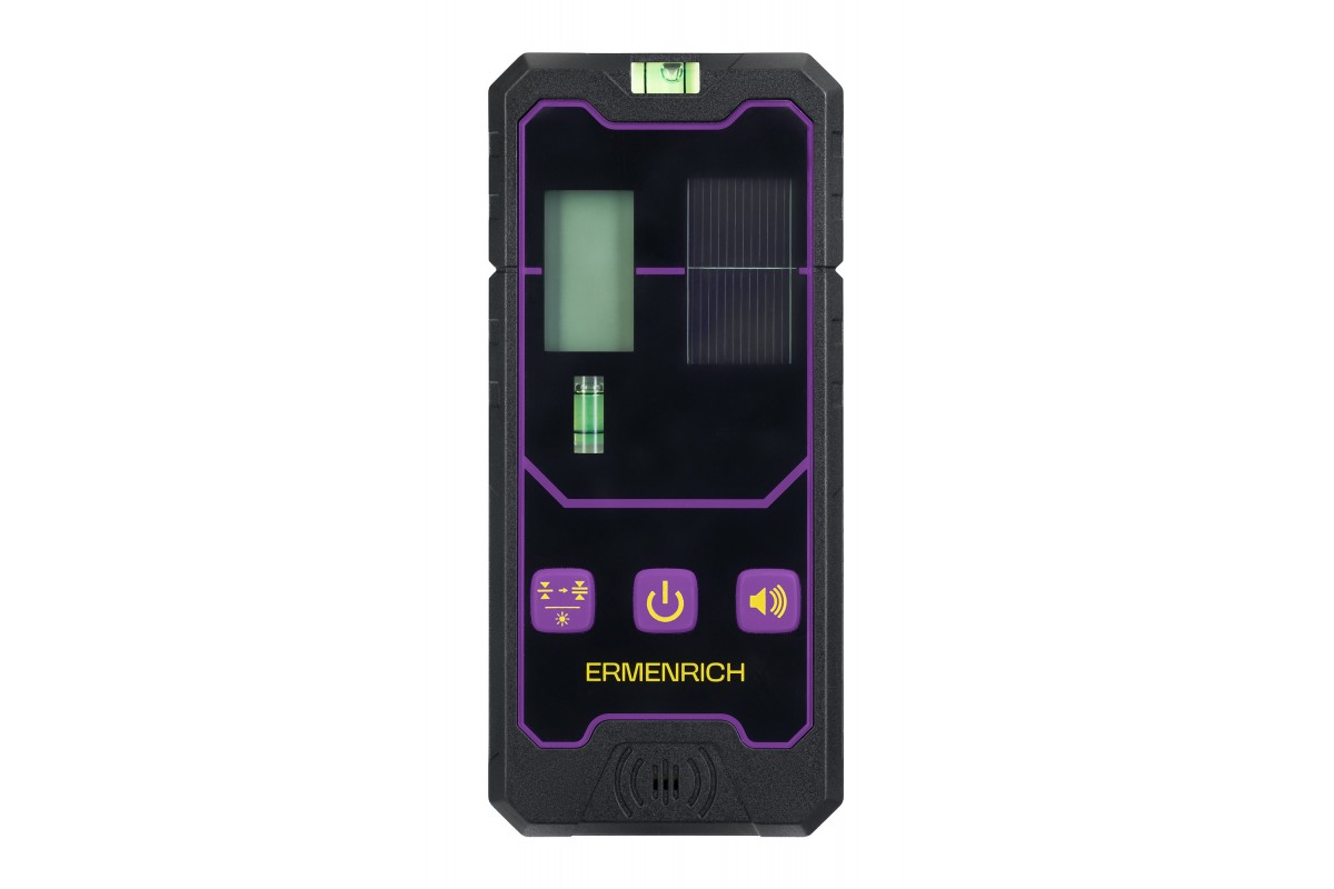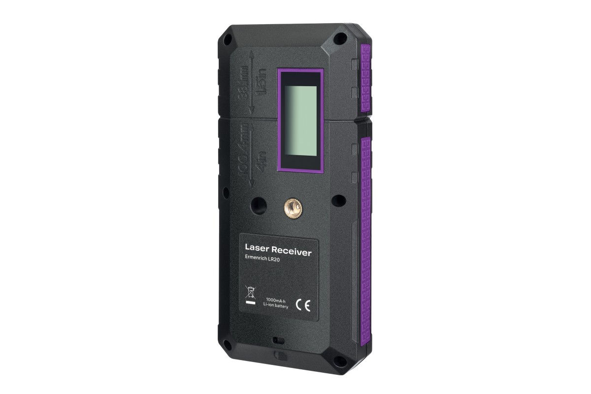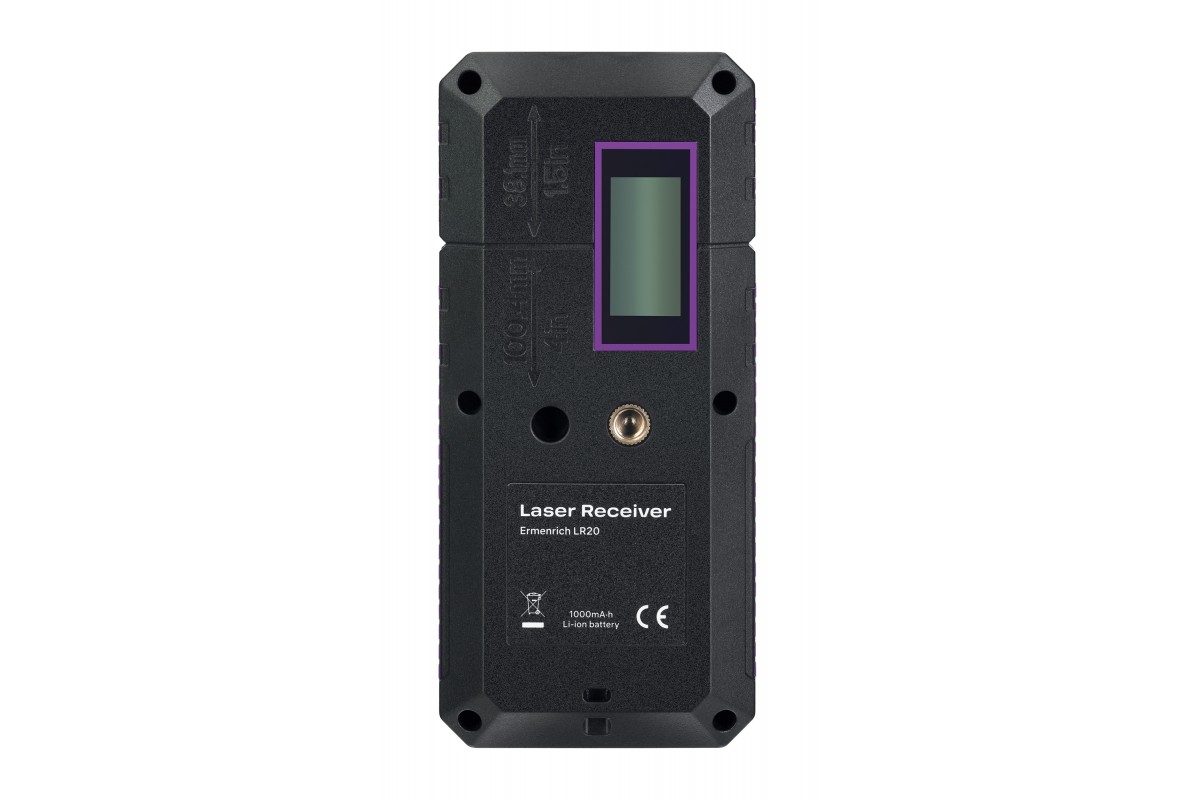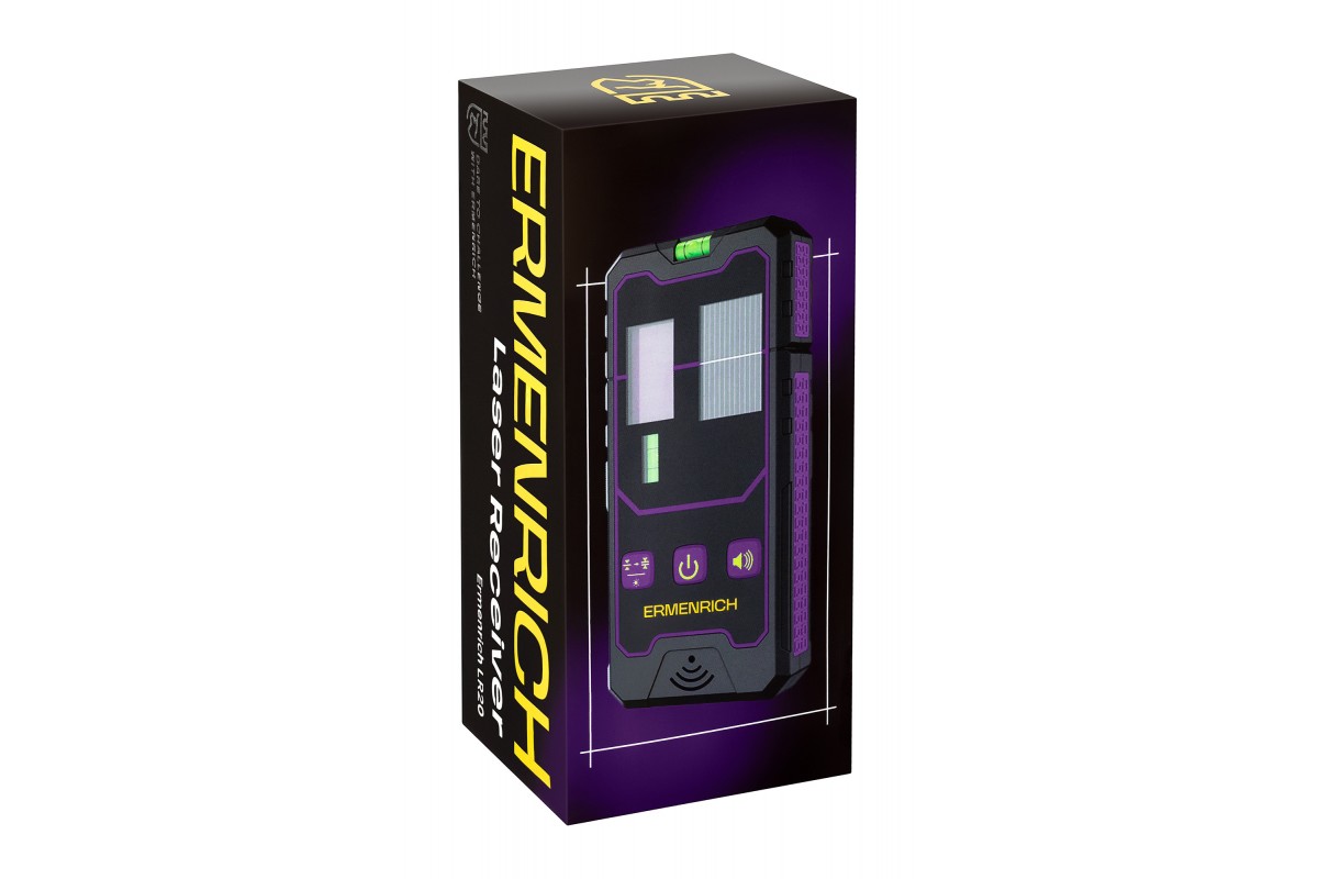 Ermenrich LR20 создан для оптимизации работы с лазерными уровнями и эффективен на удалении до 50 метров. Этот приемник совместим с приборами, оснащенными как зеленым, так и красным лазером. Принцип действия приемника весьма прост: при взаимодействии с лазером появляется сигнал световых и звуковых индикаторов, свидетельствующих о том, что нахождение луча определено. Для простоты и удобства пользования модель обладает крупным приемным окном и подсветкой экрана.
