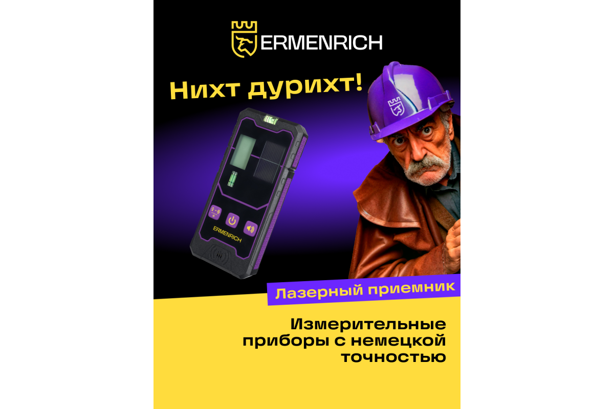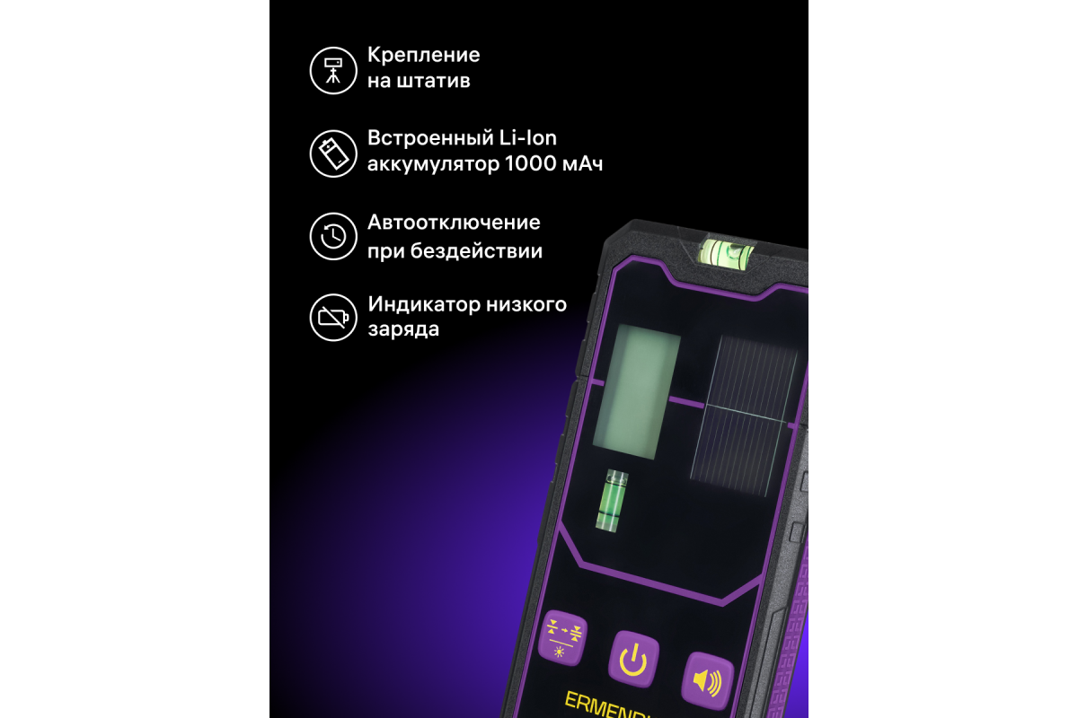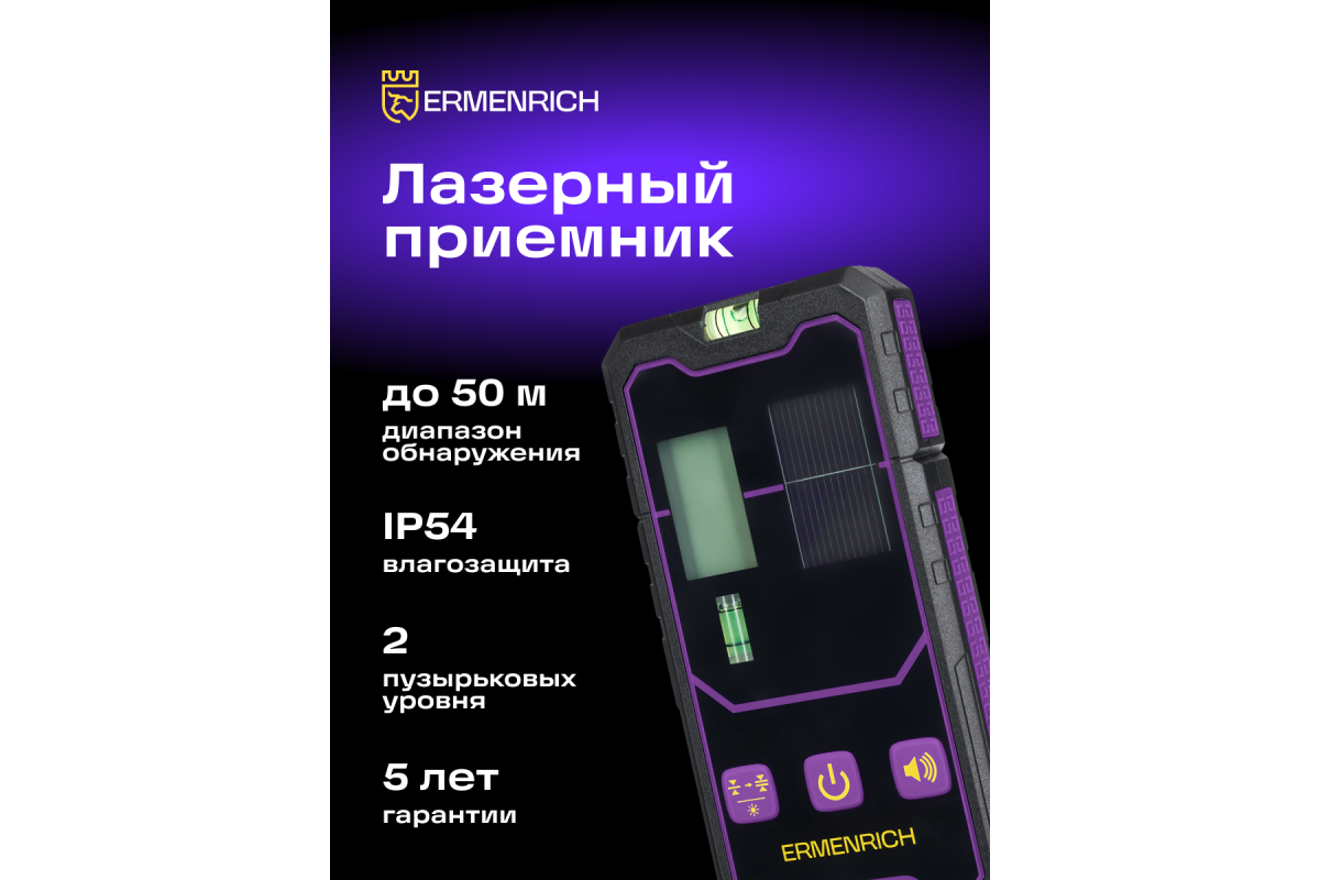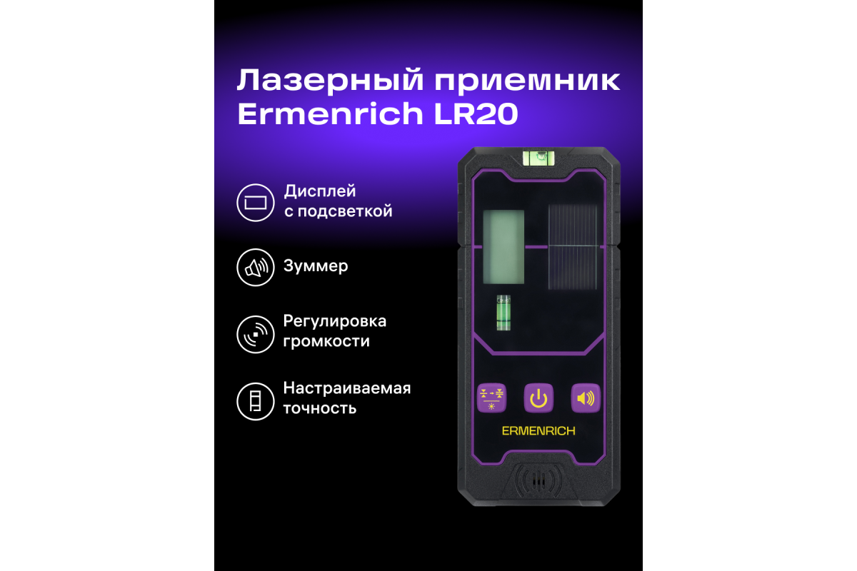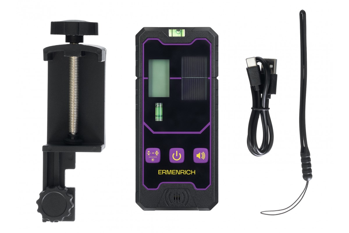 Ermenrich LR20 создан для оптимизации работы с лазерными уровнями и эффективен на удалении до 50 метров. Этот приемник совместим с приборами, оснащенными как зеленым, так и красным лазером. Принцип действия приемника весьма прост: при взаимодействии с лазером появляется сигнал световых и звуковых индикаторов, свидетельствующих о том, что нахождение луча определено. Для простоты и удобства пользования модель обладает крупным приемным окном и подсветкой экрана.