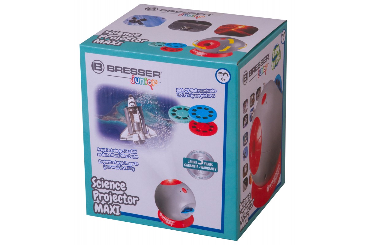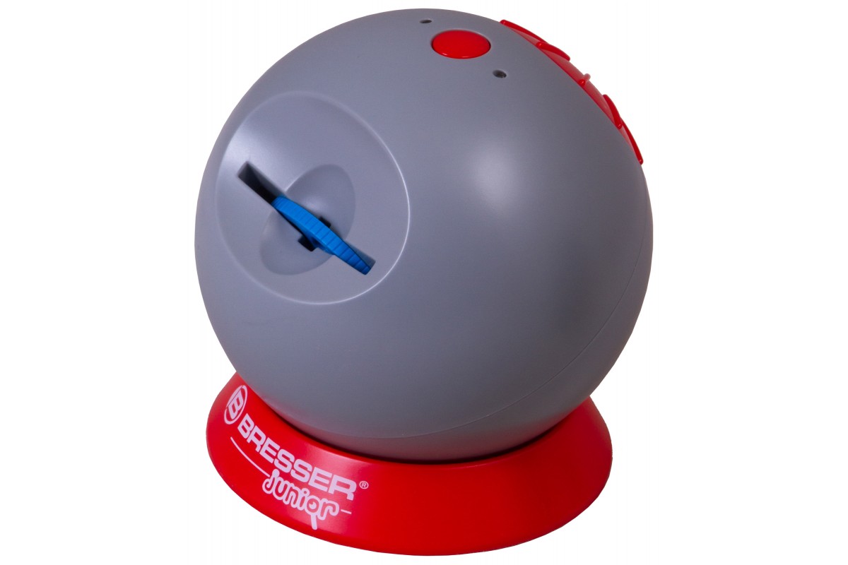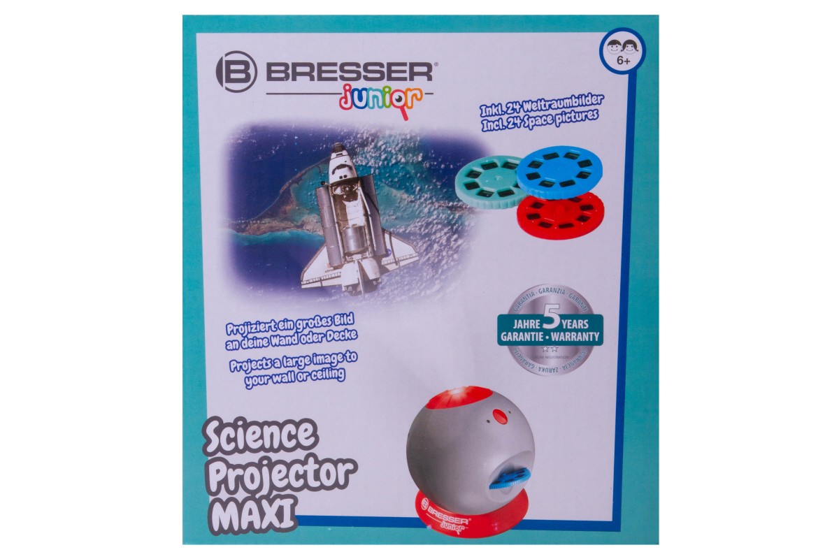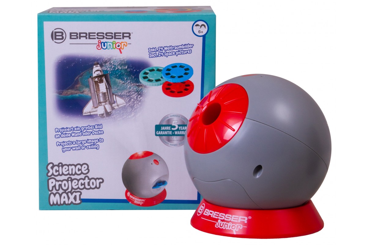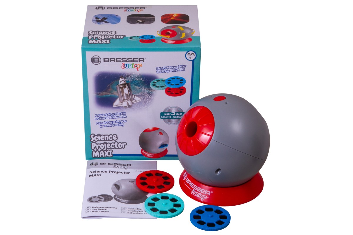 Обучающий проектор Bresser Junior MAXI познакомит маленького ребенка с красотами космоса. Прибор предназначен для проецирования изображений на стену или потолок. Для этого просто установите его напротив ровной поверхности и вставьте диск со слайдами в специальный слот. После включения проектора нужно лишь подстроить резкость при помощи диска фокусировки. В комплект поставки включены три диска с 8 изображениями на каждом. Всего можно изучить 24 слайда, на которых показаны планеты, галактики и этапы освоения космоса.