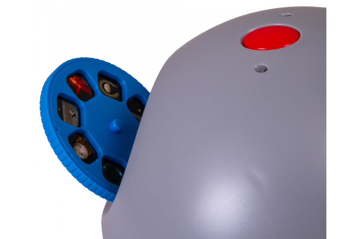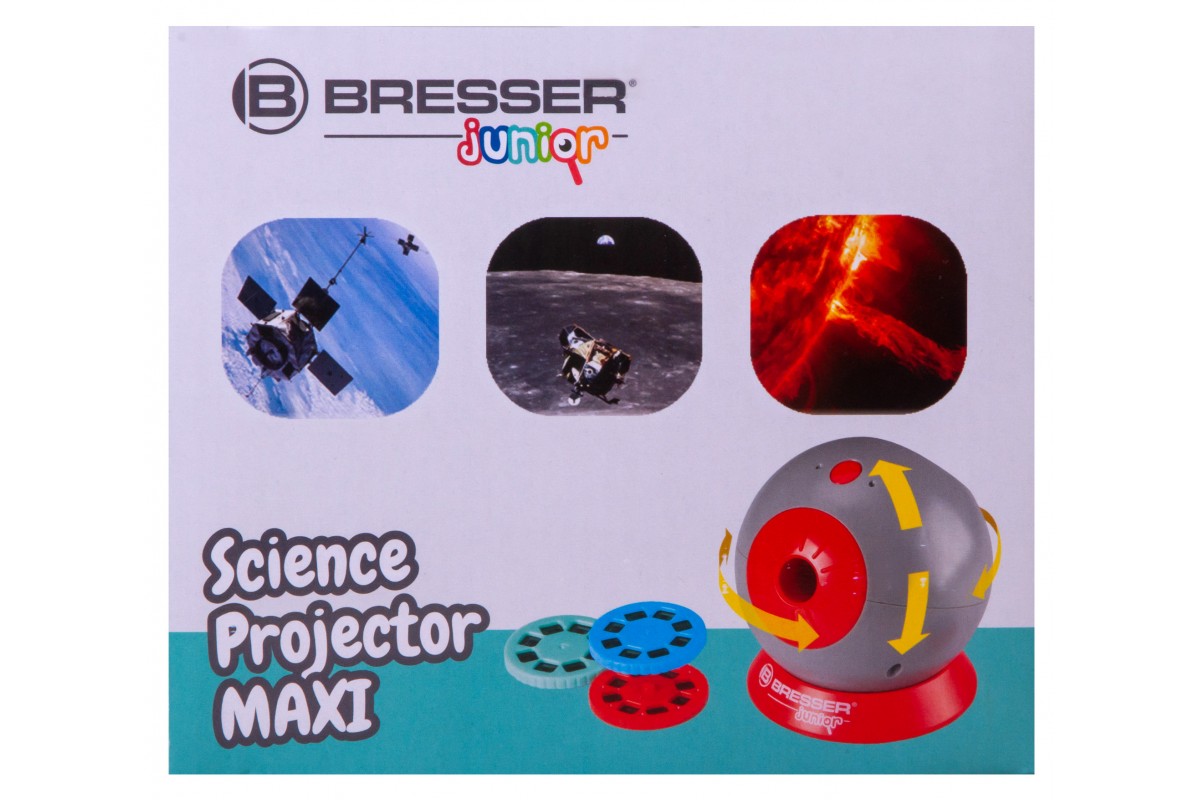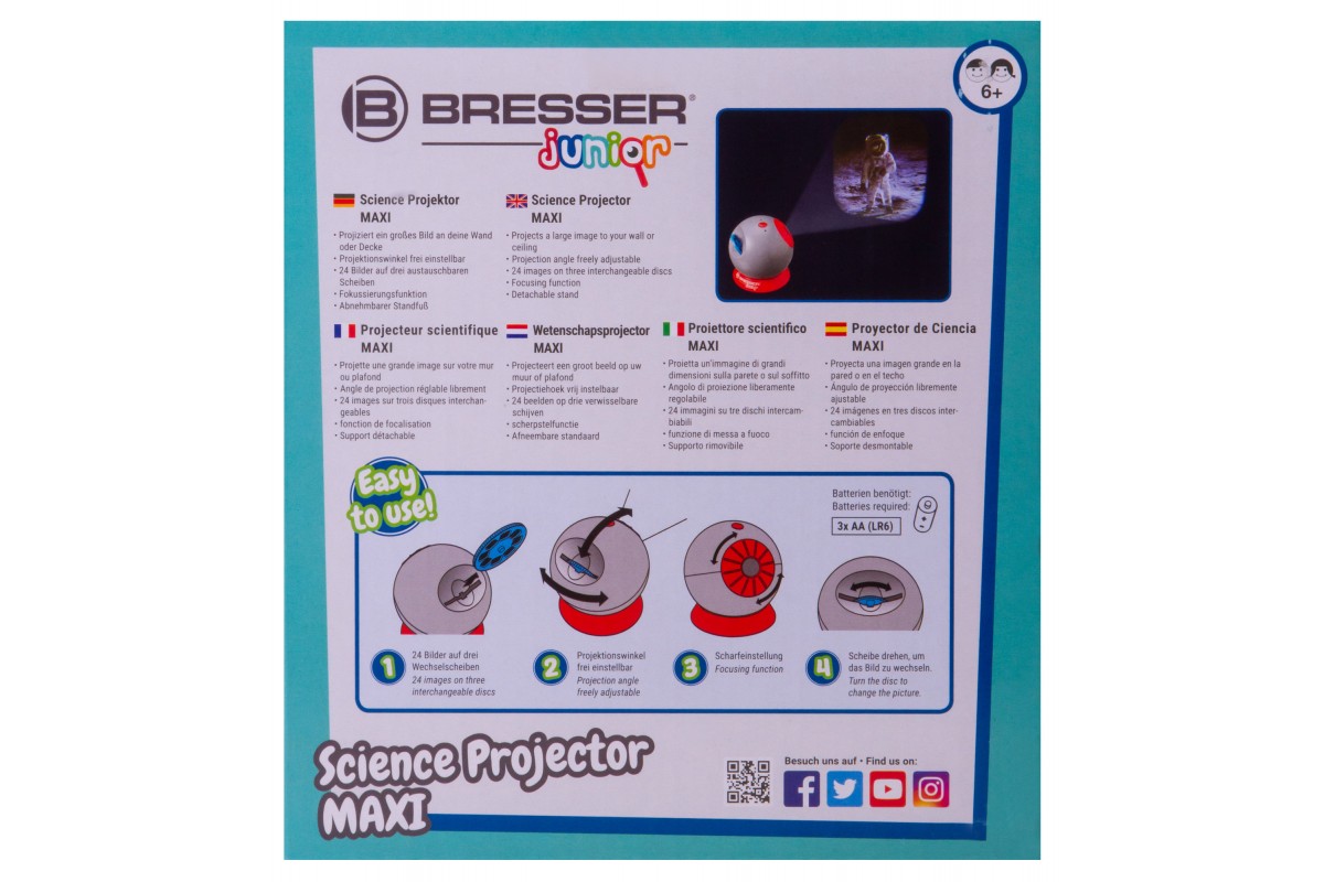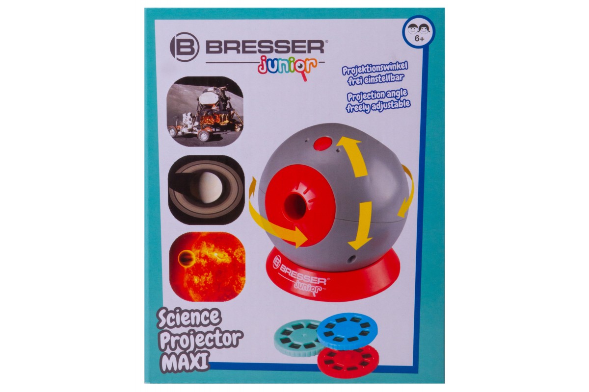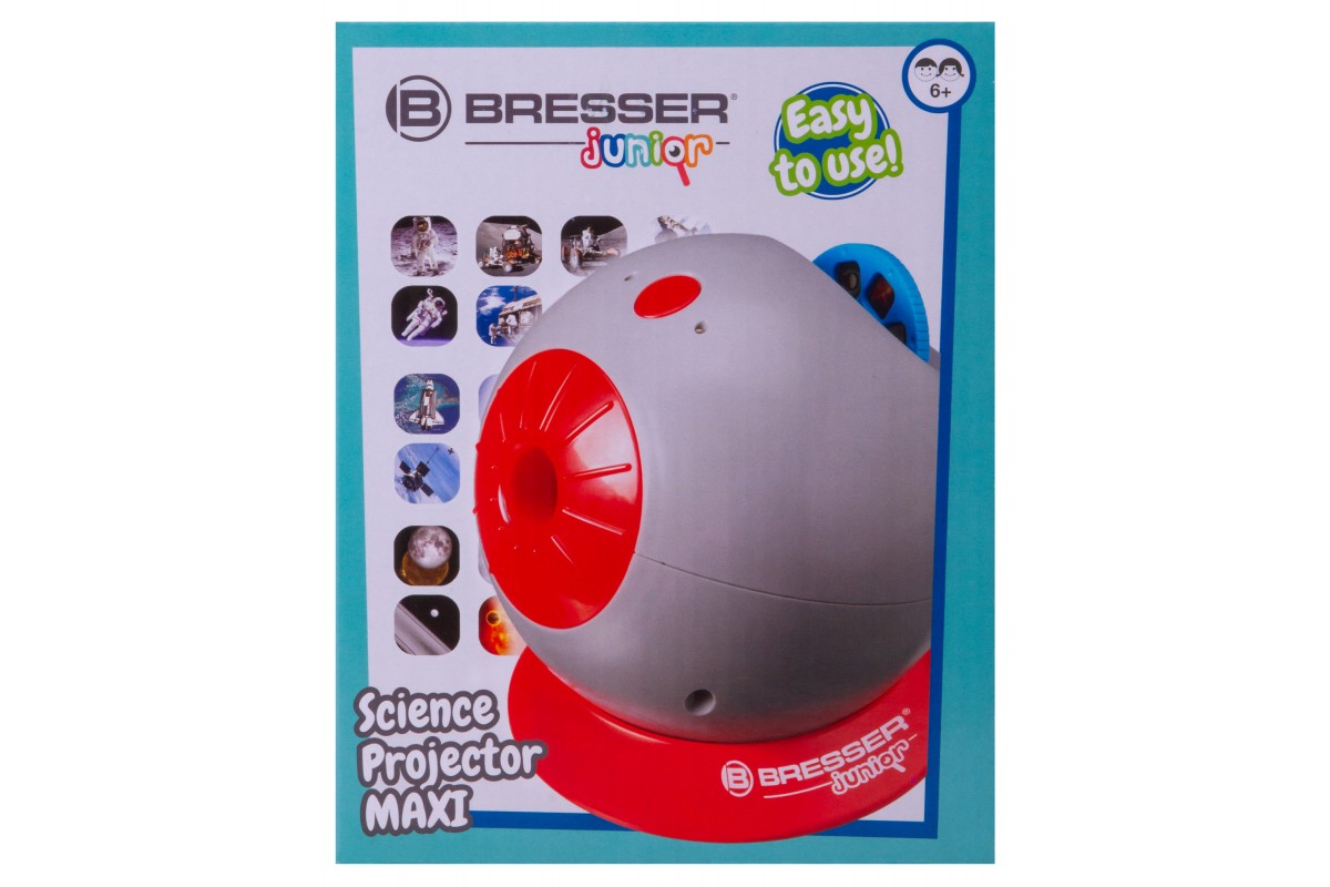 Обучающий проектор Bresser Junior MAXI познакомит маленького ребенка с красотами космоса. Прибор предназначен для проецирования изображений на стену или потолок. Для этого просто установите его напротив ровной поверхности и вставьте диск со слайдами в специальный слот. После включения проектора нужно лишь подстроить резкость при помощи диска фокусировки. В комплект поставки включены три диска с 8 изображениями на каждом. Всего можно изучить 24 слайда, на которых показаны планеты, галактики и этапы освоения космоса.