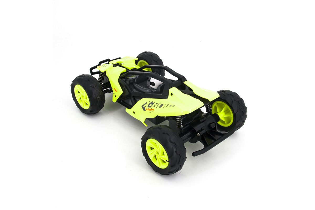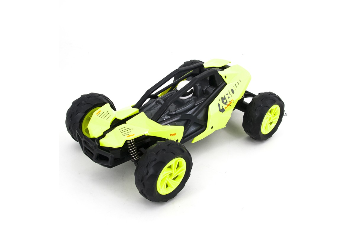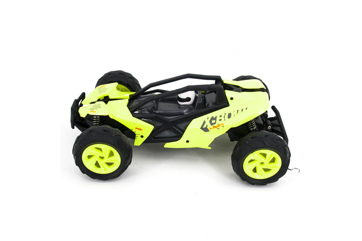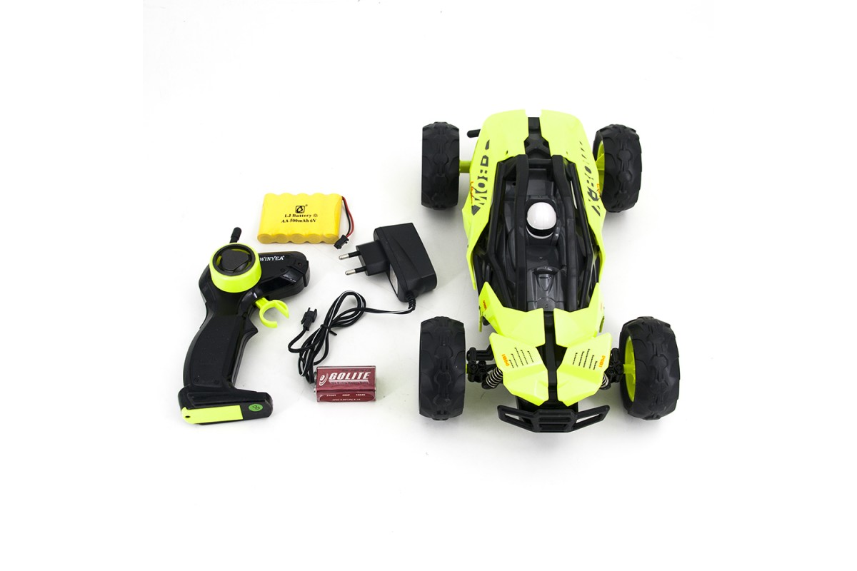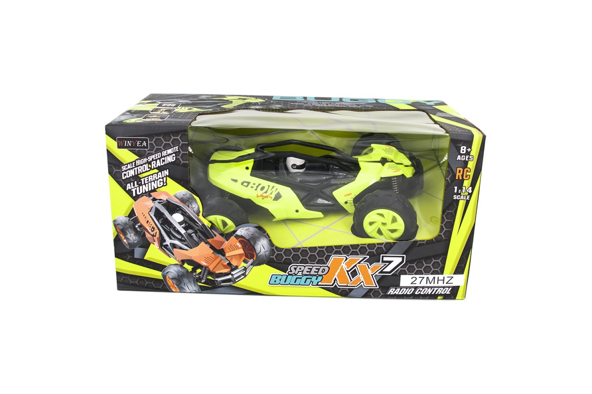 Радиоуправляемая багги Wineya Yellow Speed Buggy KX7 1:14 2.4G - W3681 - это резвая игрушка для улицы, при полном заряде аккумулятора хватает на двадцать минут резвой игры, время зарядки от штатного зарядного 3-4 часа. Машинка собрана из качественного прочного пластика, и при разумной эксплуатации переживать о поломке корпуса или движущихся частей не прийдется. Каждое колесо машинки имеет независимую подвеску друг от друга, что придает ей хорошую устойчивость по бездорожью. Согласно данных производителя, редуктор собран на основе металлических шестерен, а также используются подшипники во всех колесных осях. Пульт выполнен в виде рукоятки с курком, сбоку на нем расположено колесо для управления поворота колес. Радиус действия контролера до 25 метров, в зависимости от уровня заряда аккумулятора машины и батарейки пульта. Машинка укомплектована аккумулятором в виде блока пальчиковых аккумуляторов. Пульт питается от стандартной кроны на 9В.