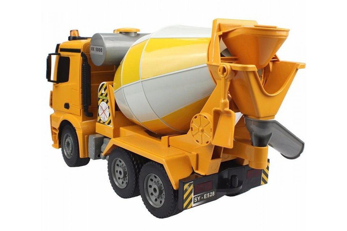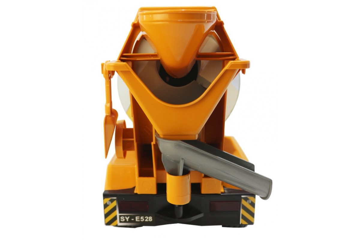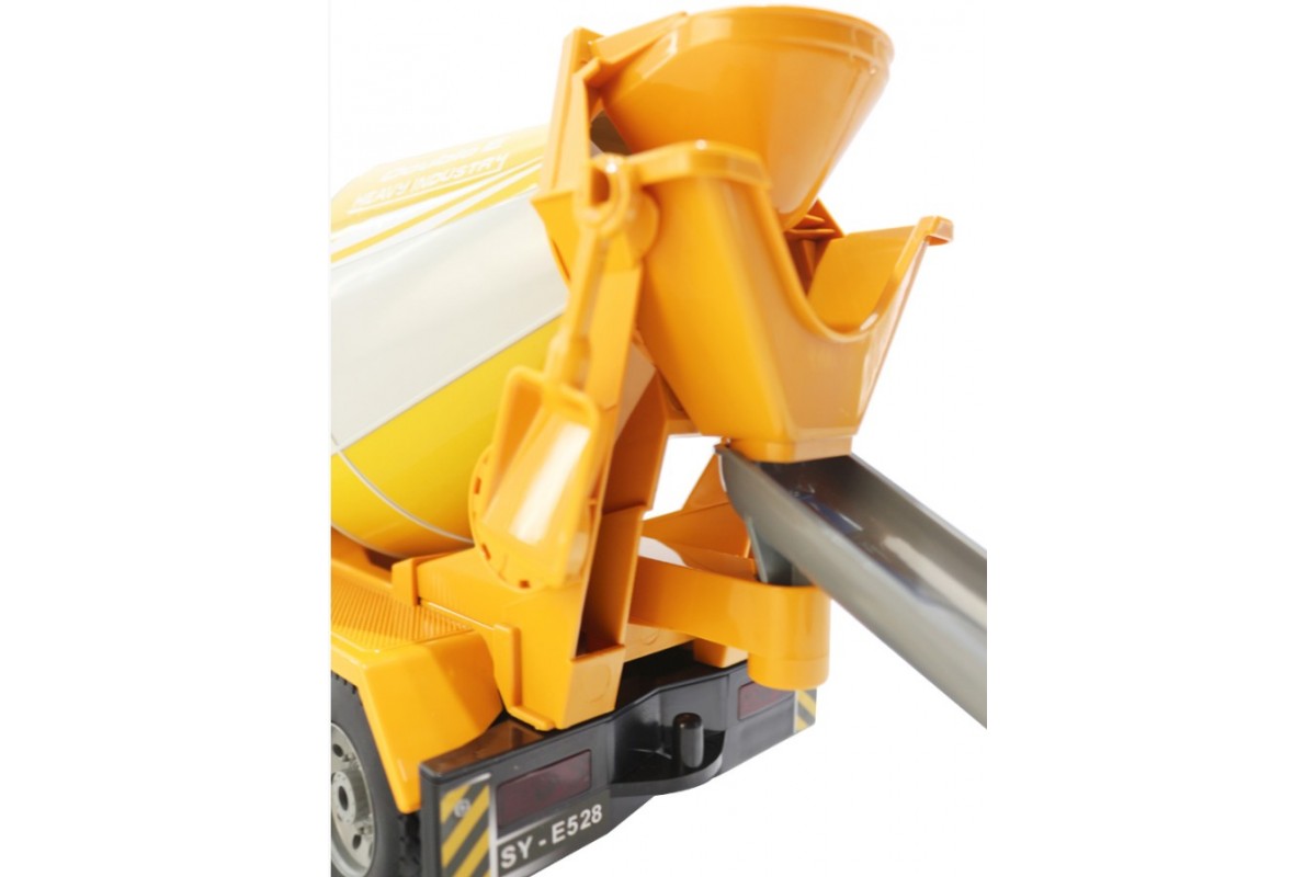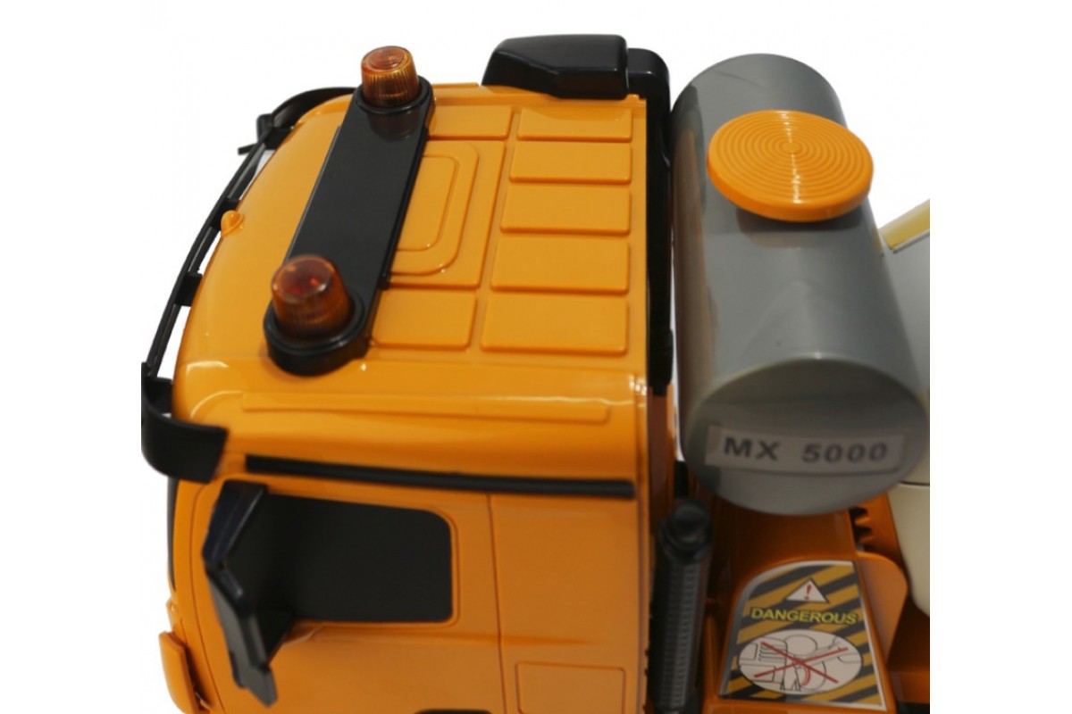 Модель данной строительной машины демонстрирует устройство бетоновоза. Большая кабина, платформа, цистерна помогут ребенку представить себя водителем этой интересной машины. Машиной легко управлять, она не имеет опасных мелких деталей, поэтому дети от 6 лет без труда справятся с управлением бензовозом. Интерес к игре усиливается с помощью дополнительного оснащения бензовоза. Машина издает звуки шума двигателя и другие звуковые сигналы, которые могут быть отключены, модель в этом случае будет работать в беззвучном режиме. На кабине имеются светящиеся части, вместе яркой окраской тем самым усиливается внешняя привлекательность бетоновоза. Особый механизм, расположенный возле кабины машины, подкручивает цистерну, имитируя процесс приготовления бетона.