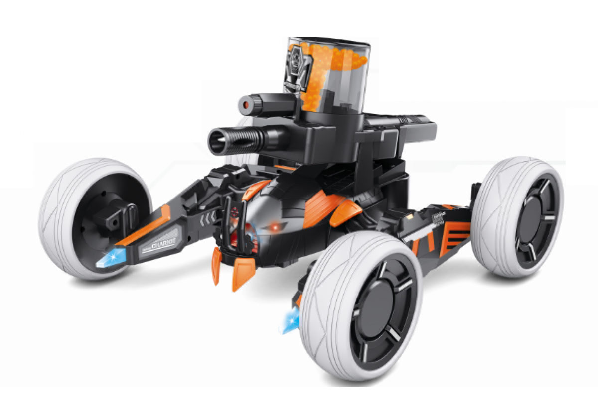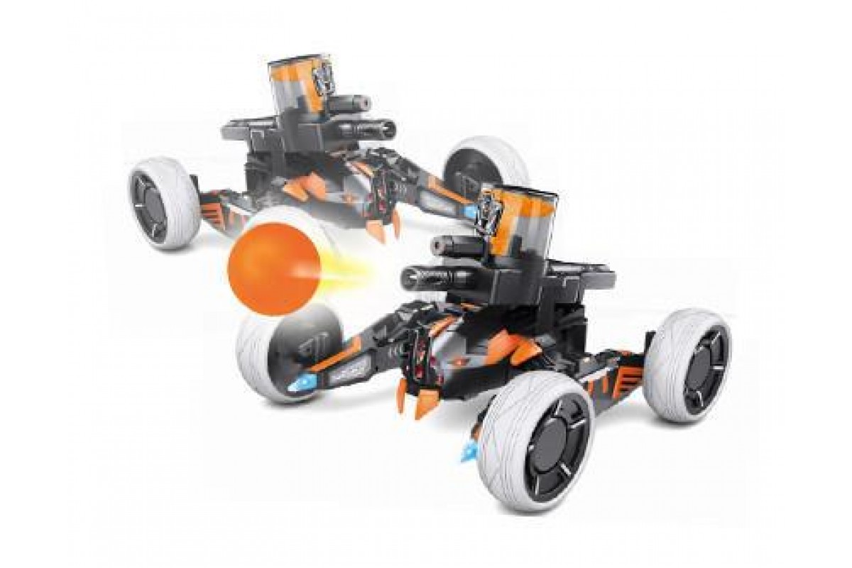 Пусковая установка управляется пультом дистанционного управления. Во время боя, Вы стреляете во врага и после трех попаданий он выйдет из строя (потребуется перезапуск). Также у Вас есть возможность отрегулировать высоту пушки, что поможет точно поразить цель. Заднеприводные колеса позволяют двигаться во всех направлениях и делать повороты на 360°. Светодиодные индикаторы фар вовремя проинформируют Вас о том сколько жизней у Вас осталось. Модель оснащена амортизаторами, которые сглаживают неровности, позволяя вам мягко и непринужденно двигаться практически по любой поверхности.