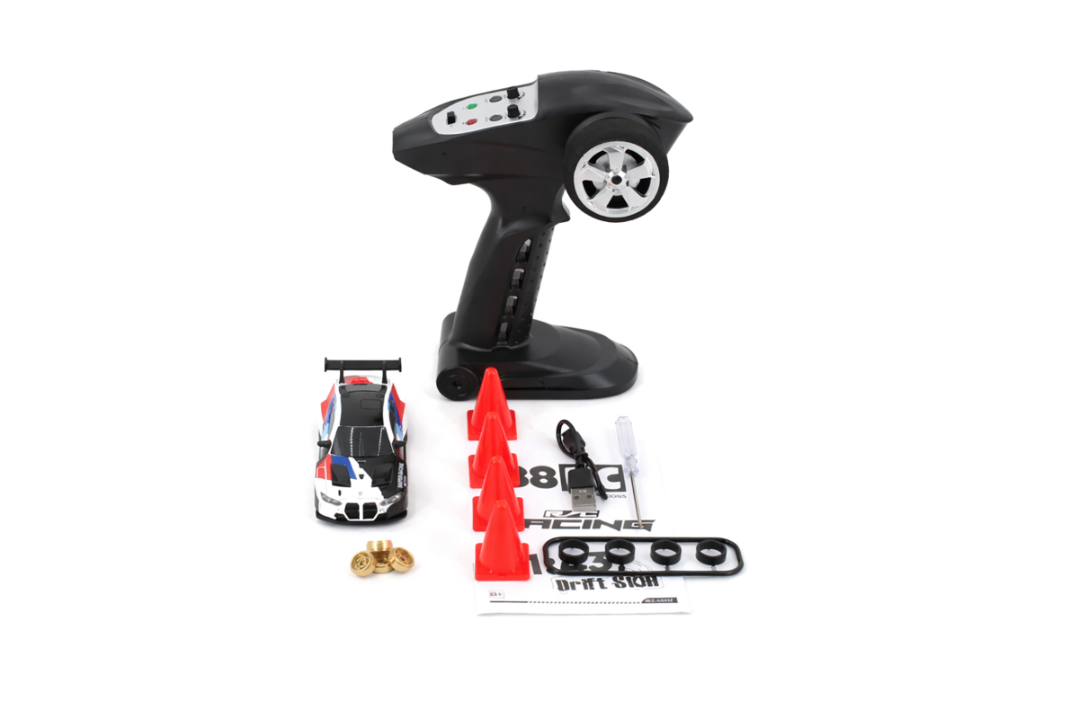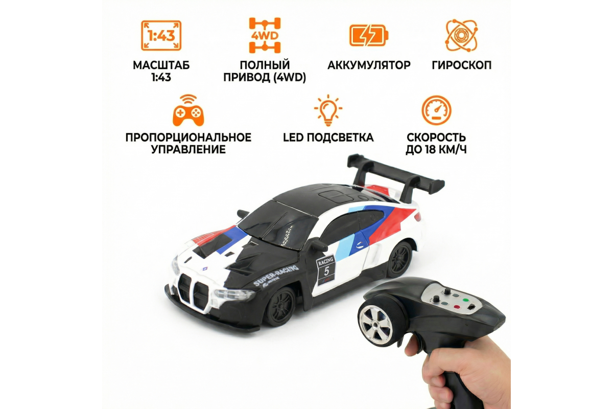 Радиоуправляемая дрифт машина с гироскопом BMW M4 1:43 - RC43-B - это машина, которая предназначена для дрифта. Она имеет полный привод и выполненная в масштабе 1:43. Машинка управляется при помощи пульта ДУ, работающего на частоте 2,4 ГГц. В наборе также поставляются комплект запасных колес, дорожные конусы, зарядное устройство и аккумулятор. Во время движения у машинки светятся фары.