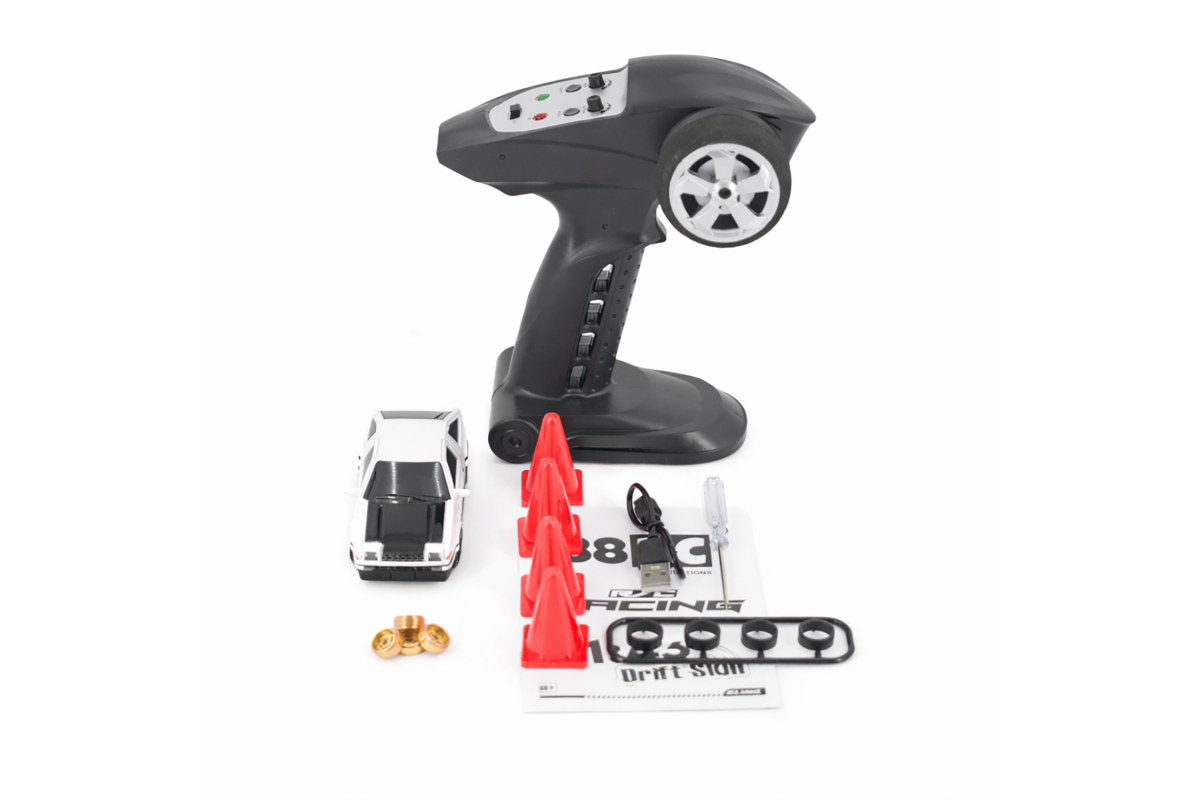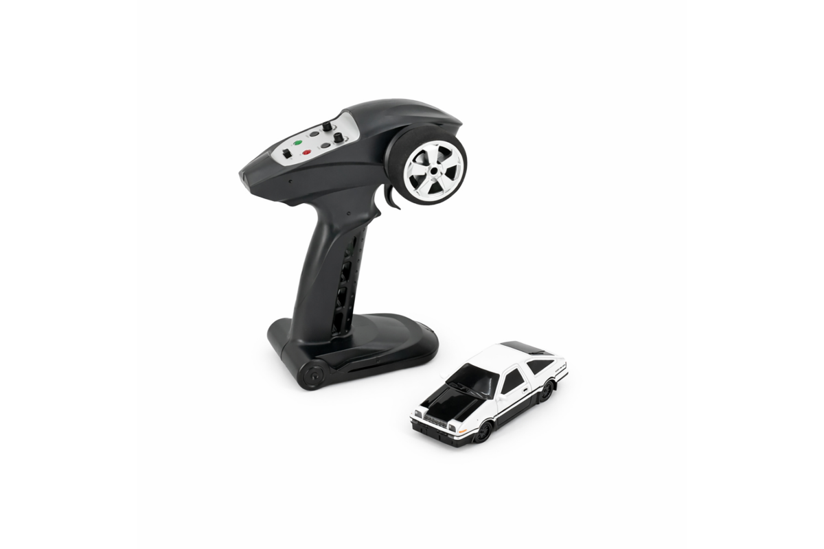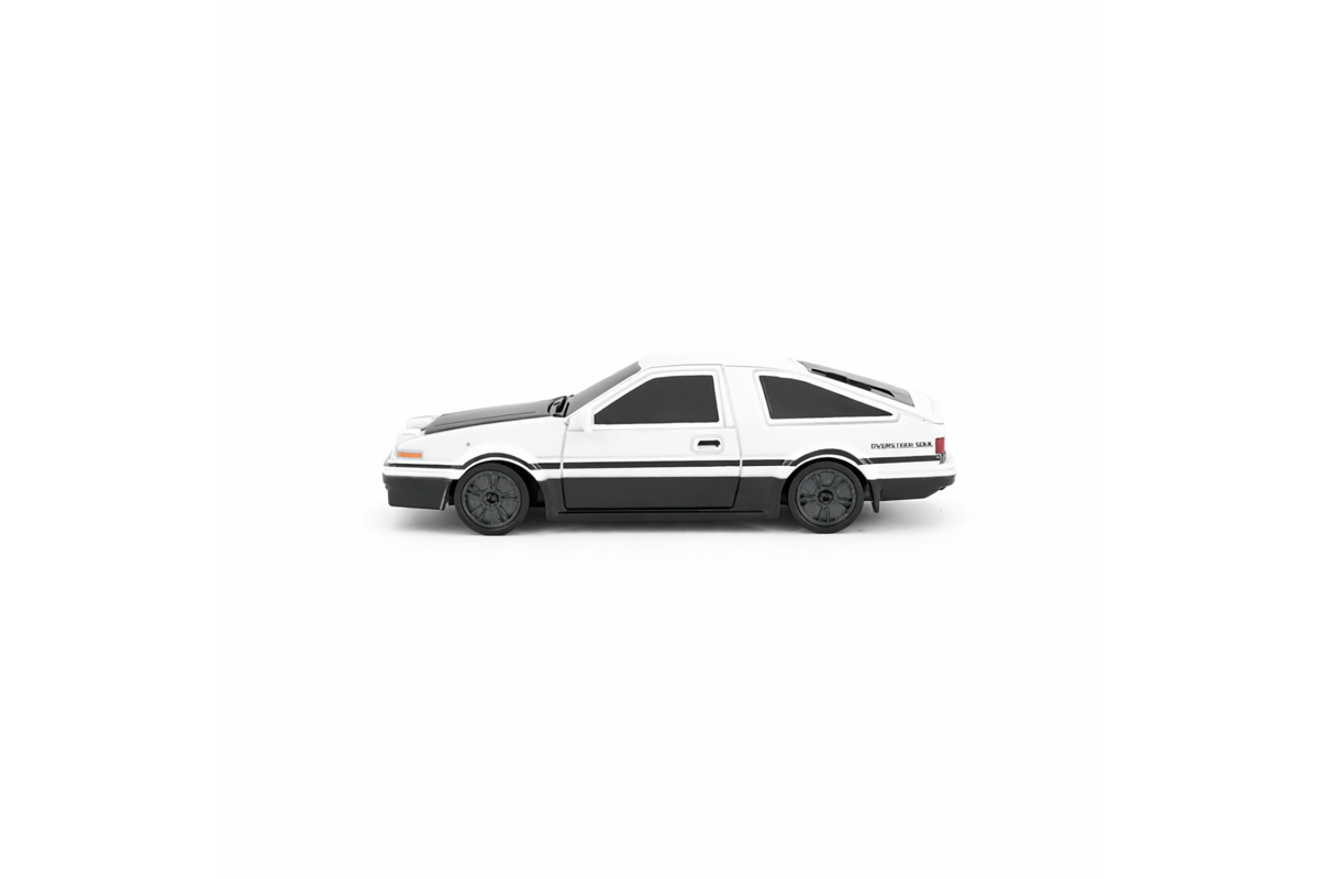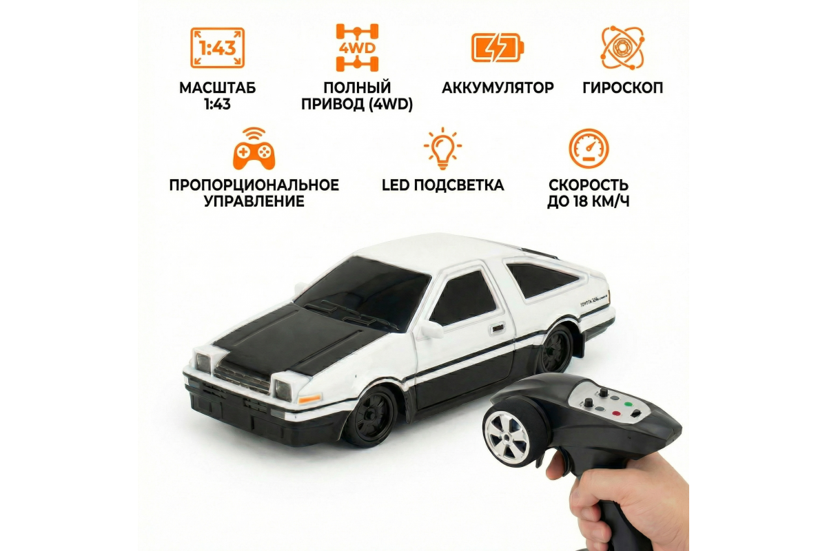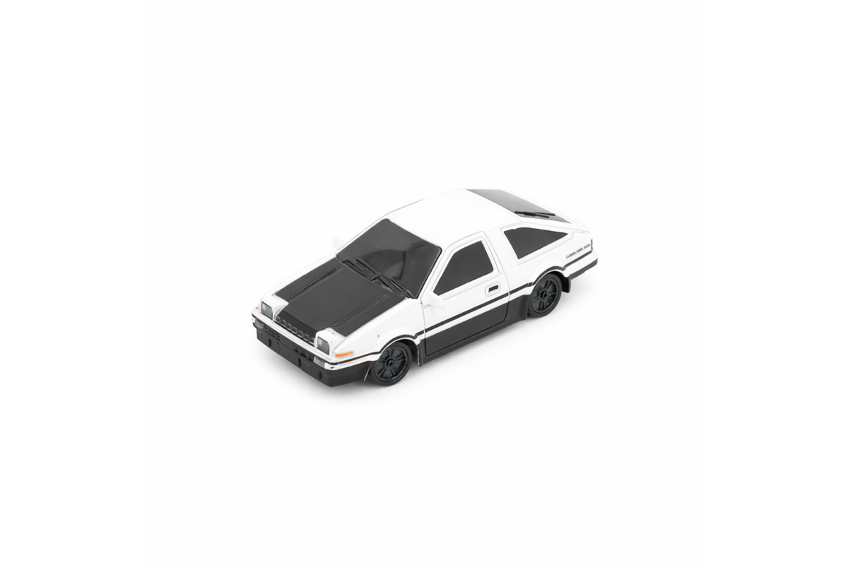Радиоуправляемая дрифт машина Toyota AE86 1:43 - RC43-A1 - это машина, которая предназначена для дрифта. Она имеет полный привод и выполненная в масштабе 1:43. Машинка управляется при помощи пульта ДУ, работающего на частоте 2,4 ГГц. В наборе также поставляются комплект запасных колес, дорожные конусы, зарядное устройство и аккумулятор. Во время движения у машинки светятся фары.