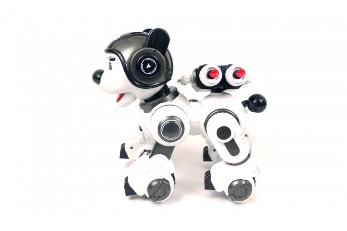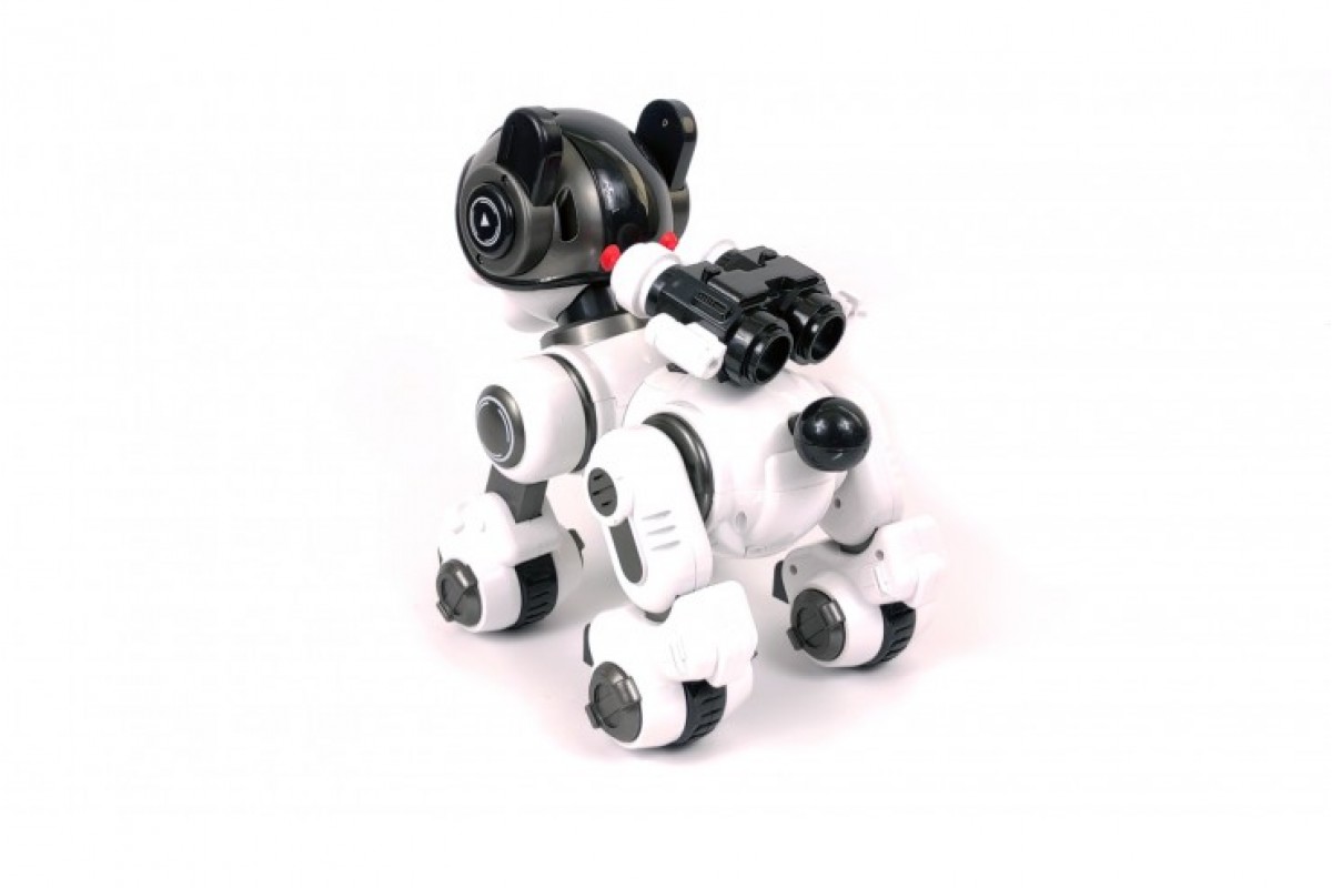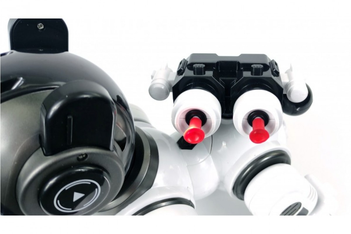 С помощью кнопок громкости можно регулировать громкость звуковых эффектов робота. Робот поворачивает голову в разные стороны. Нажмите кнопку "Патруль" и собака начнет осматривать территорию. При нажатии кнопки собака начинает лаять. Погладьте (нажмите кнопку) собаку по голове и собака воспроизведет 6 фраз на выбор. Так же робот танцует, поет 5 песен, демонстрирует что он умеет, рассказывает истории и научные факты.
