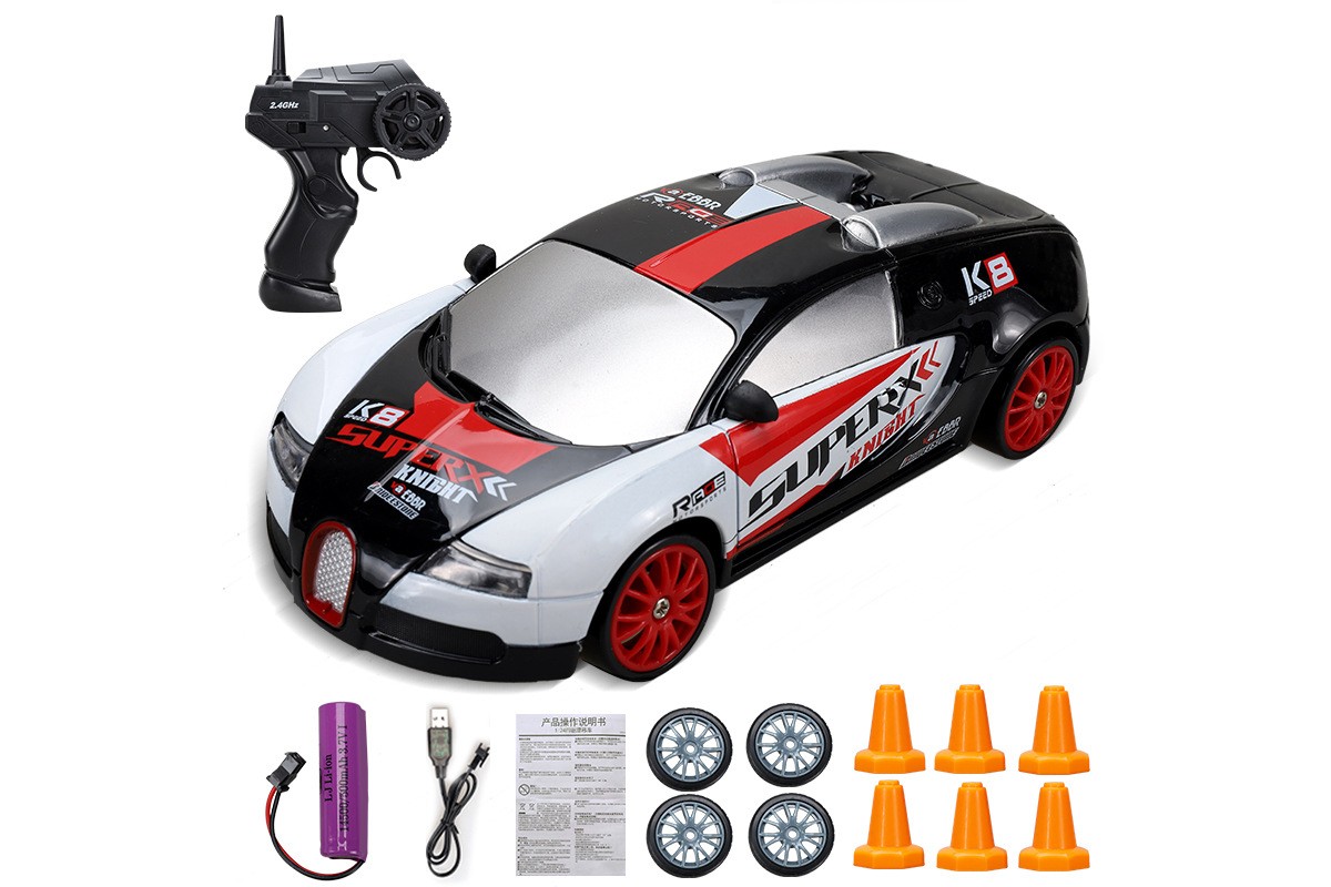 Радиоуправляемая машина для дрифта Bugatti Veyron (19 см, 15 км/ч, сменные колеса, фишки) - SC24A10 - это машина, которая предназначена для дрифта. Она имеет полный привод и выполненная в масштабе 1:24. Машинка управляется при помощи пульта ДУ, работающего на частоте 2,4 ГГц. В наборе также поставляются комплект запасных колес, дорожные конусы, зарядное устройство и аккумулятор. Во время движения у машинки светятся фары.