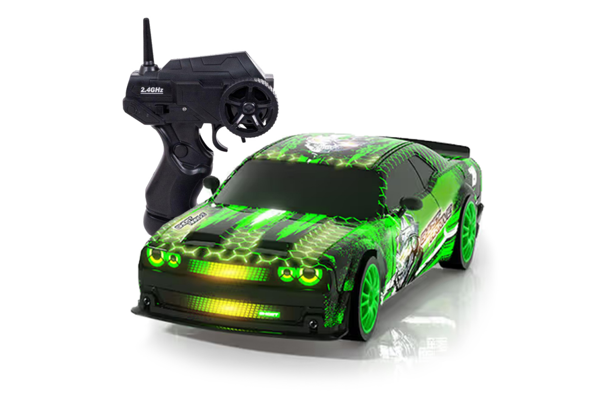 Радиоуправляемая машина для дрифта Dodge (19 см, 15 км/ч, сменные колеса, фишки) - SC24A25 - это машина, которая предназначена для дрифта. Она имеет полный привод и выполненная в масштабе 1:24. Машинка управляется при помощи пульта ДУ, работающего на частоте 2,4 ГГц. В наборе также поставляются комплект запасных колес, дорожные конусы, зарядное устройство и аккумулятор. Во время движения у машинки светятся фары.