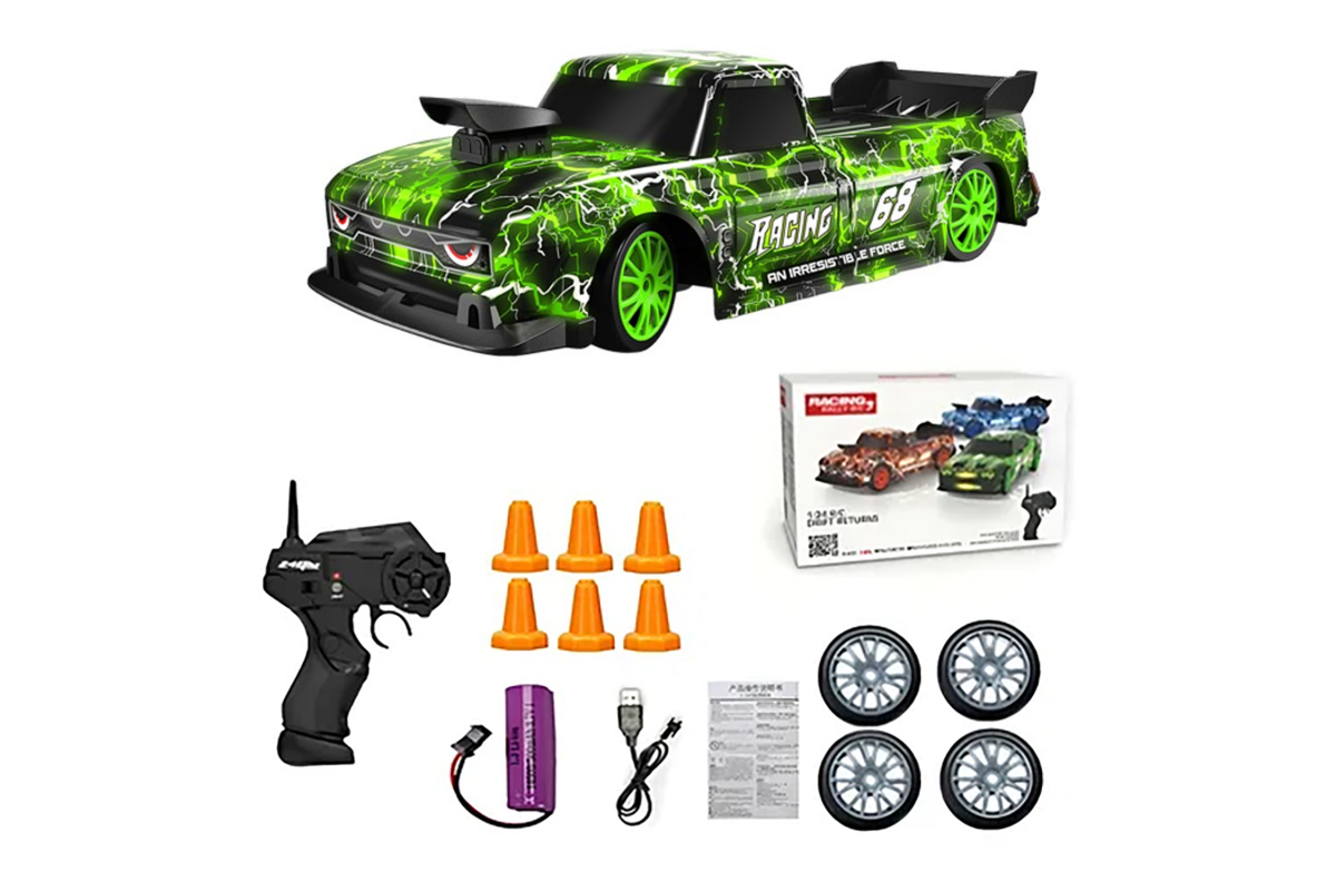 Радиоуправляемая машина для дрифта Ford F150 (19 см, 15 км/ч, сменные колеса, фишки) - SC24A22 - это машина, которая предназначена для дрифта. Она имеет полный привод и выполненная в масштабе 1:24. Машинка управляется при помощи пульта ДУ, работающего на частоте 2,4 ГГц. В наборе также поставляются комплект запасных колес, дорожные конусы, зарядное устройство и аккумулятор. Во время движения у машинки светятся фары.