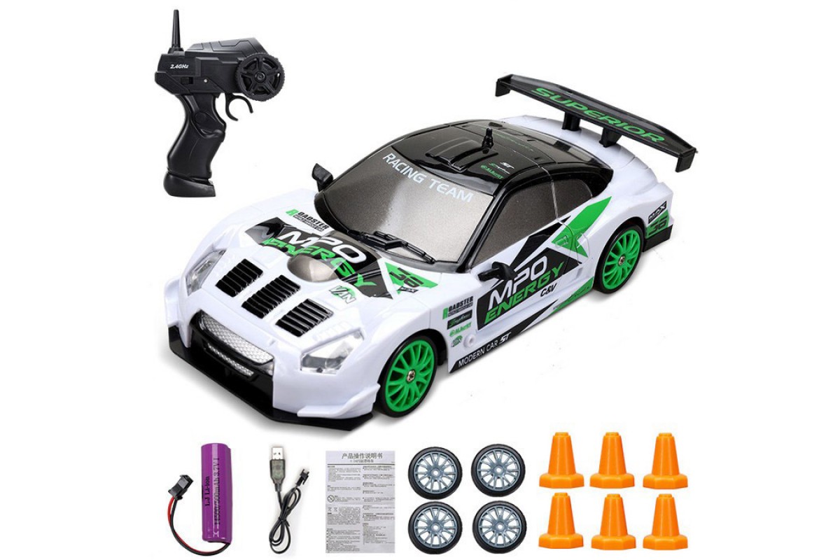 Радиоуправляемая машина для дрифта Nissan 350Z (19 см, 15 км/ч, сменные колеса, фишки) - SC24A11 - это машина, которая предназначена для дрифта. Она имеет полный привод и выполненная в масштабе 1:24. Машинка управляется при помощи пульта ДУ, работающего на частоте 2,4 ГГц. В наборе также поставляются комплект запасных колес, дорожные конусы, зарядное устройство и аккумулятор. Во время движения у машинки светятся фары.