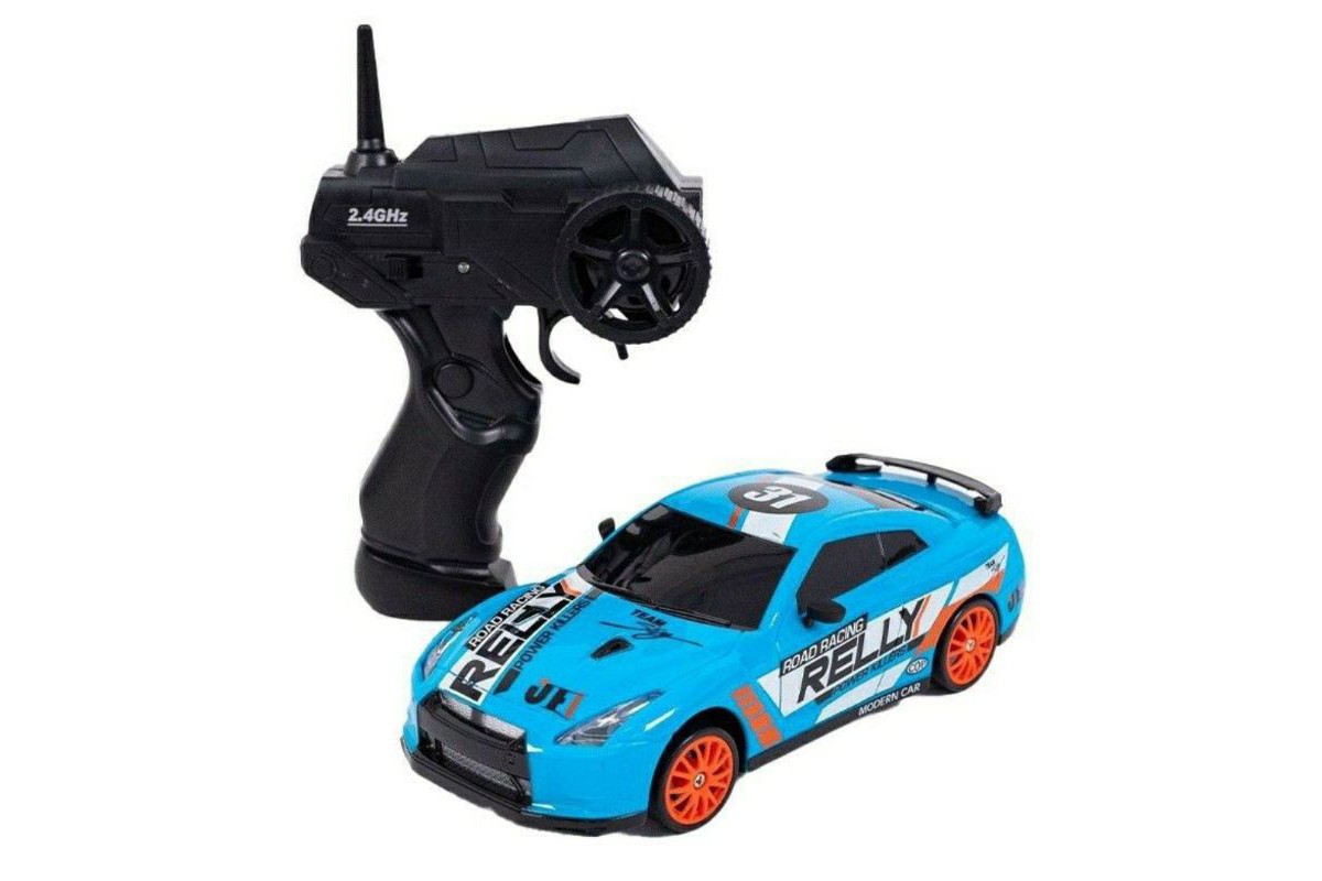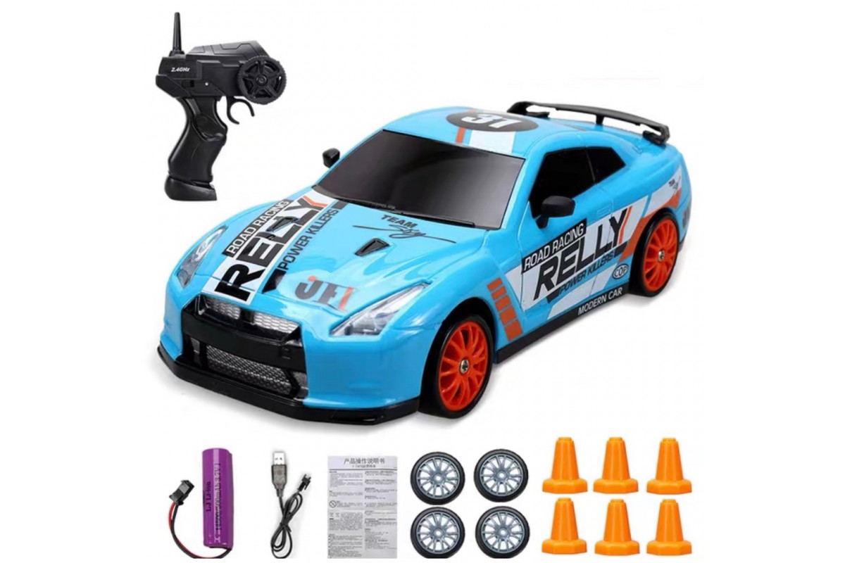 Радиоуправляемая машина для дрифта Nissan GT-R (19 см, 15 км/ч, сменные колеса, фишки) - SC24A08 - это машина, которая предназначена для дрифта. Она имеет полный привод и выполненная в масштабе 1:24. Машинка управляется при помощи пульта ДУ, работающего на частоте 2,4 ГГц. В наборе также поставляются комплект запасных колес, дорожные конусы, зарядное устройство и аккумулятор. Во время движения у машинки светятся фары.