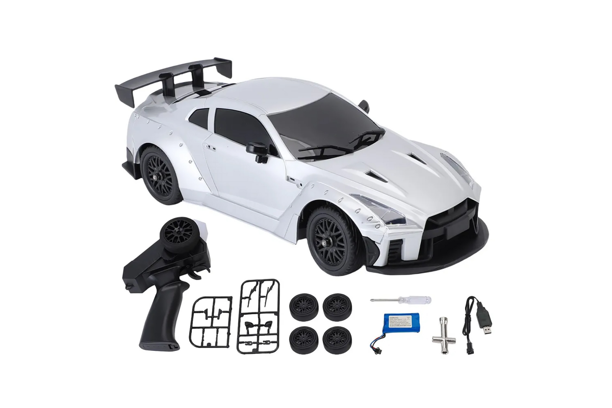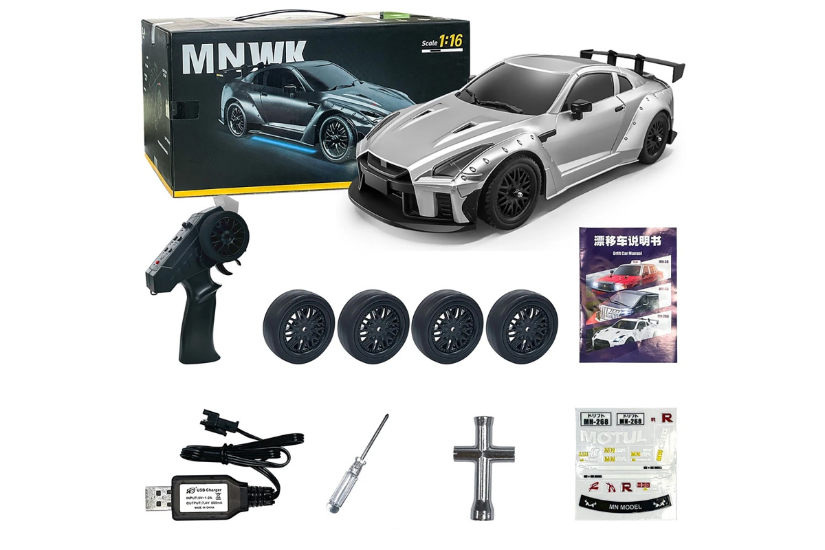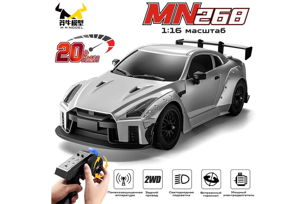 Радиоуправляемая машина для дрифта Nissan GTR (31 см, 20 км/ч, акб, 1:16) - MN-268-GREY - это спортивный автомобиль для дрифта с классическим задним приводом в масштабе 1:16, который поставляется в полностью готовом к использованию виде. Модель работает от электрического двигателя и развивает скорость около 20 км/ч. Вспомогательный гироскоп для обеспечения высокой стабильности при дрифте. В комплекте есть все, что нужно для первого заезда.