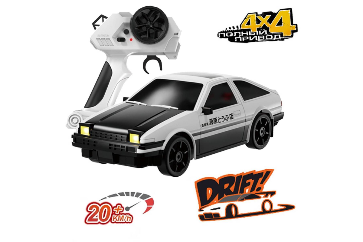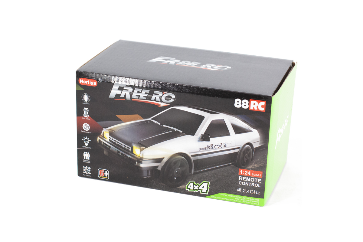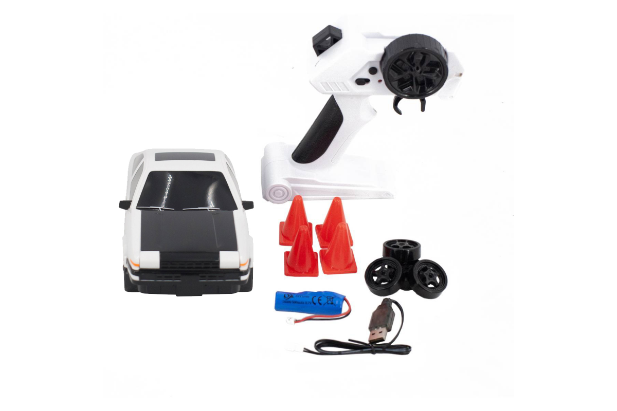 Радиоуправляемая машина для дрифта Toyota AE86 (19 см, 15 км/ч, свет, сменные колеса, фишки) - RC-24A - это машина, которая предназначена для дрифта. Она имеет полный привод и выполненная в масштабе 1:24. Машинка управляется при помощи пульта ДУ, работающего на частоте 2,4 ГГц. В наборе также поставляются комплект запасных колес, дорожные конусы, зарядное устройство и аккумулятор. Во время движения у машинки светятся фары, которые можно поднимать и опускать прямо с пульта управления.