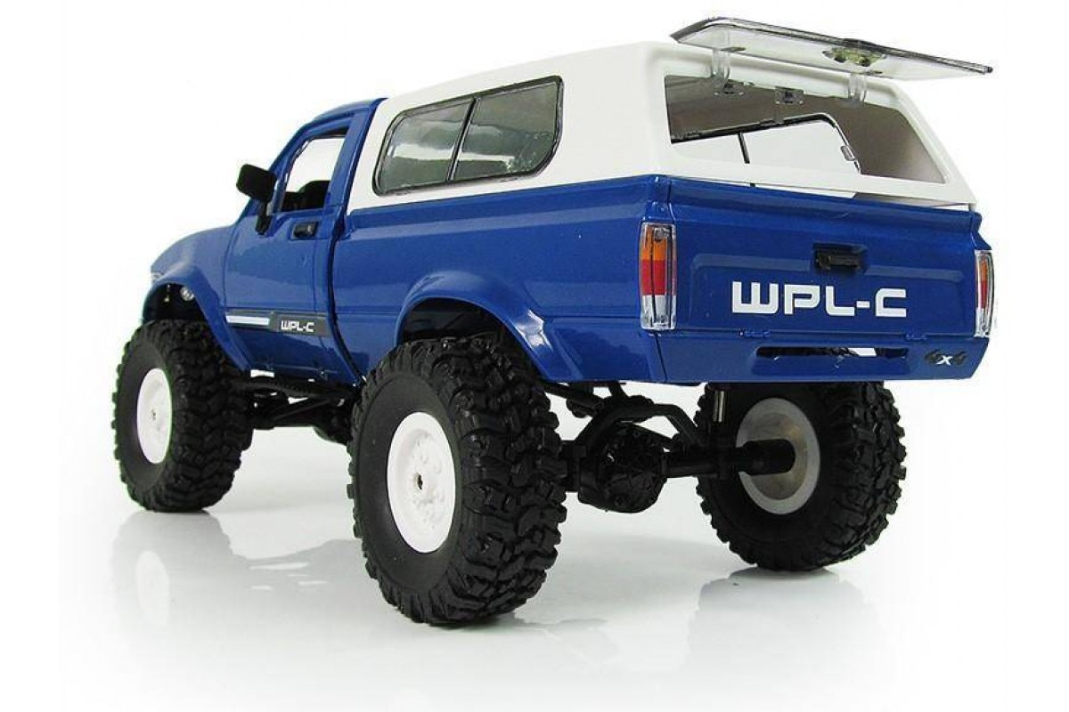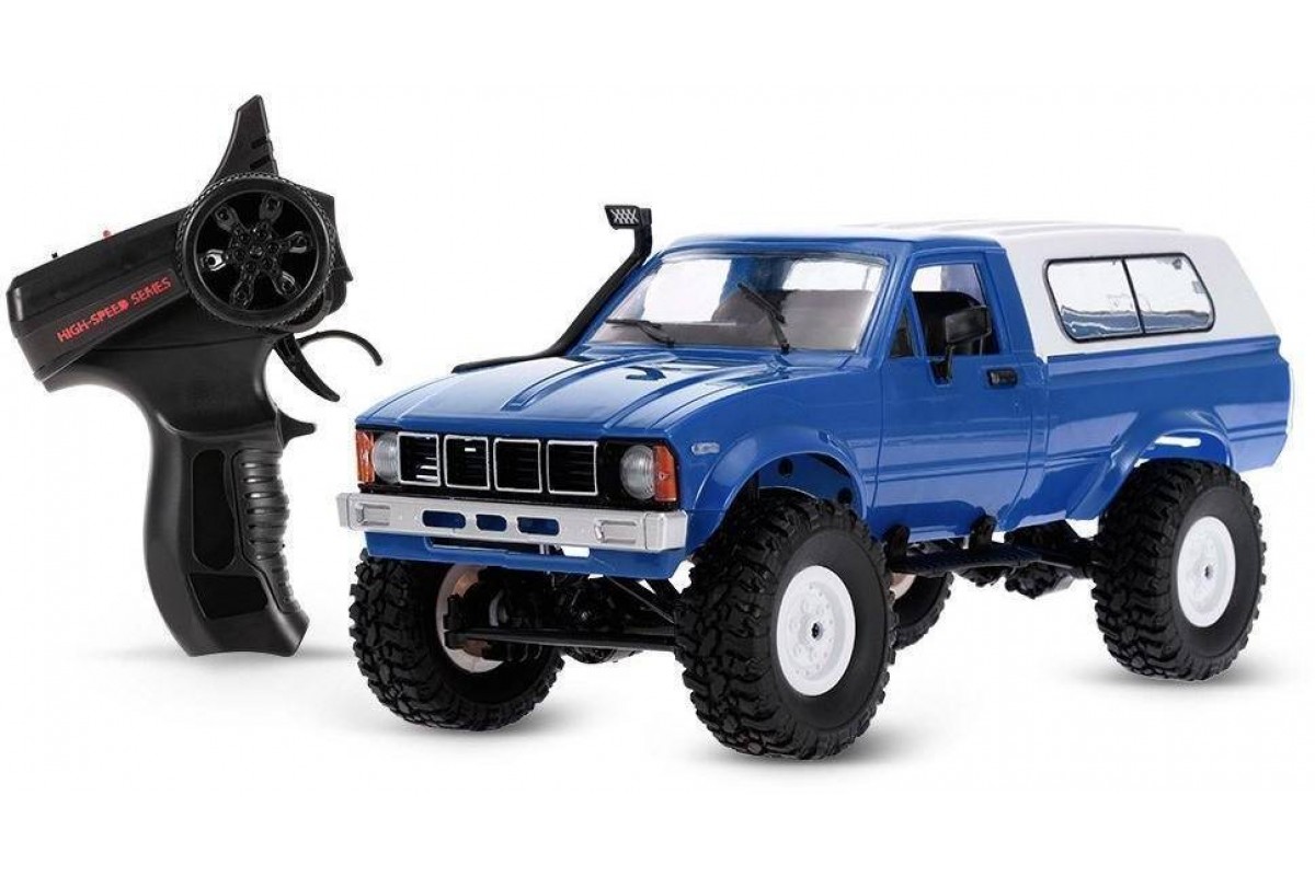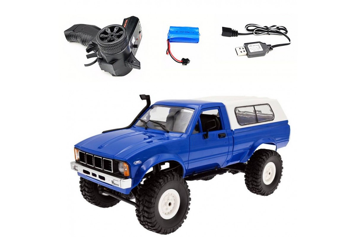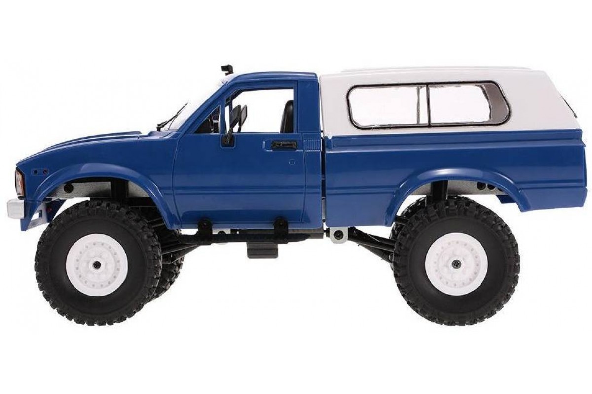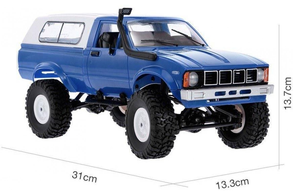 Радиоуправляемая машина WPL пикап Hilux (синий) 4WD 2.4G 1:16 RTR - WPLC-24-BLUE - это радиоуправляемый внедорожник синего цвета в масштабе 1/16 оснащен полным приводом, длинноходной пружинной подвеской, как у моделей ''краулер'', и мощным коллекторным электромотором. Внедорожник имеет богатую деталировку и может быть оборудован светящимися фарами. Кузов изготовлен из прочного АВS пластика, в кабине можно увидеть сиденья, руль и интерьер. Легкосъемная задняя часть кузова позволяет быстро превратить внедорожник в грузовой пикап. Li-Ion аккумулятор 7.4В 500мАч спрятан в багажном отсеке под кабиной. Для установки батареи предусмотрен открывающийся люк.