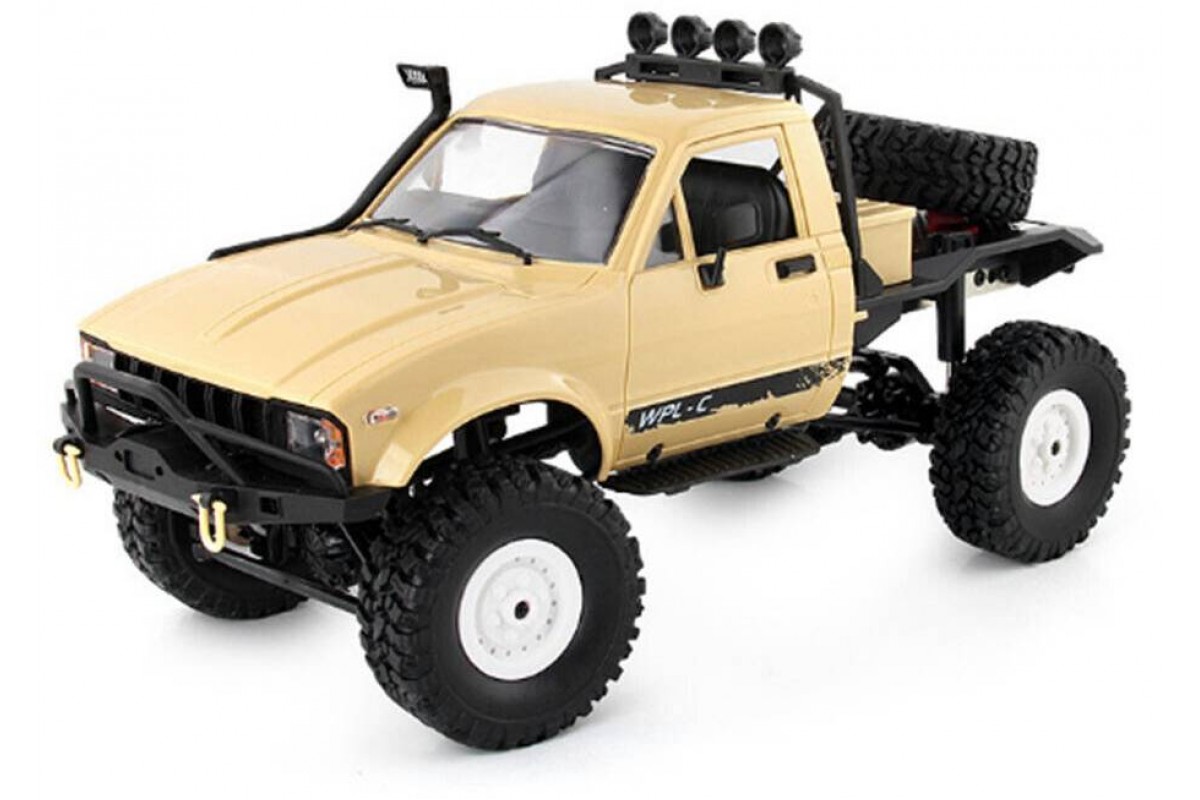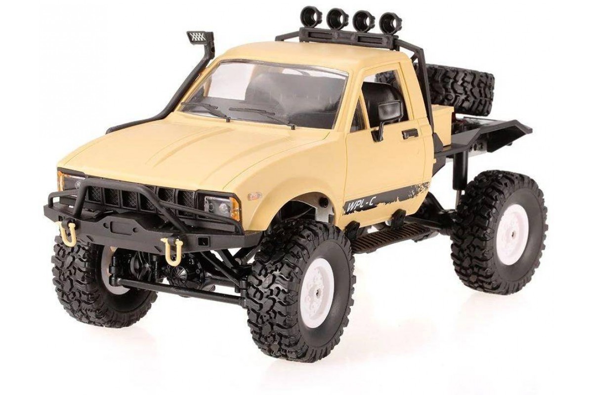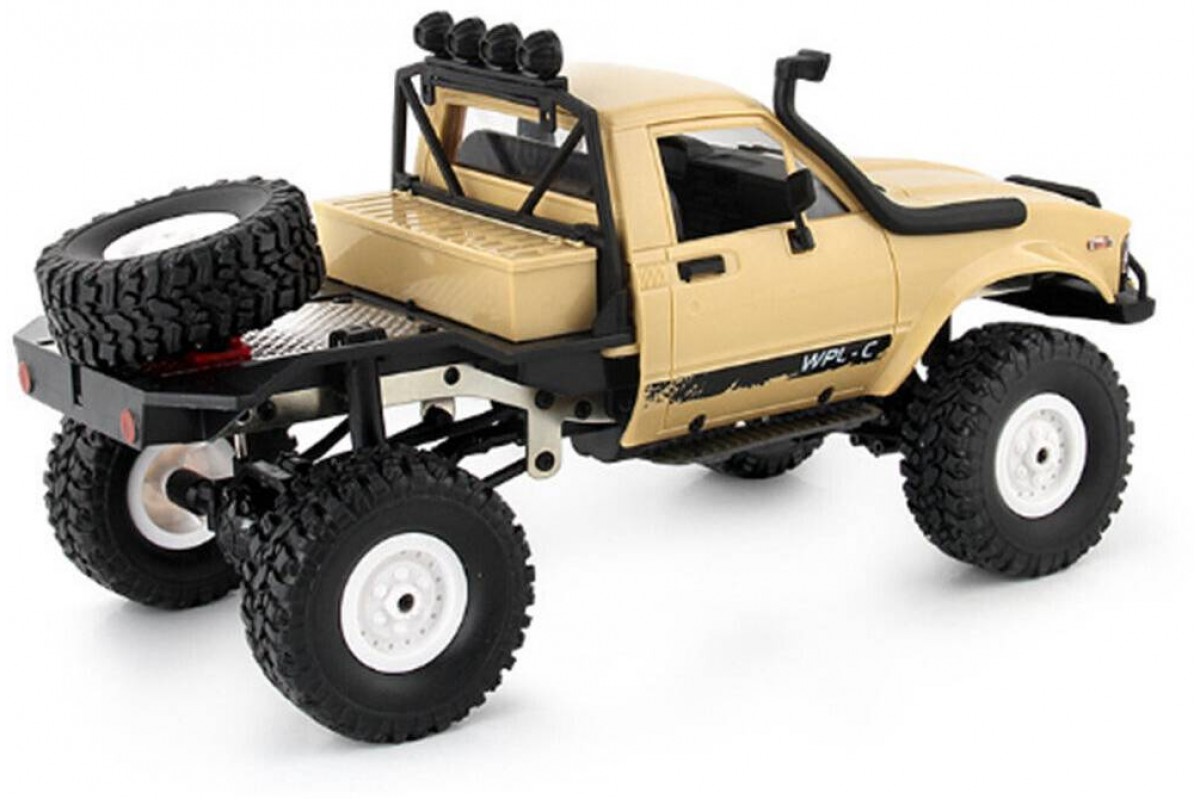 Радиоуправляемая машина WPL пикап Hilux (желтый) 4WD 2.4G 1:16 RTR - WPLC-14-YELLOW - это радиоуправляемый внедорожный джип 1/16, оснащен полным приводом, действующей рессорной подвеской как у моделей ''краулер'' и мощным коллекторным электромотором. Внедорожник выпускается в различных вариантах окраски, имеет богатую деталировку и светящиеся передние фары. В кабине можно увидеть сиденья, руль и интерьер. Кабина изготовлена из прочного АВS пластика и установлена на металлическую раму. Li-Ion аккумулятор 7.4В 500 мАч спрятан под кабиной. Для установки батареи предусмотрен открывающийся люк.