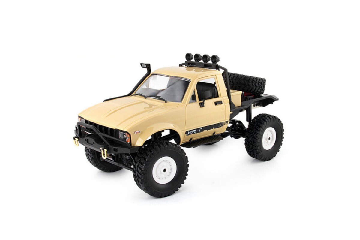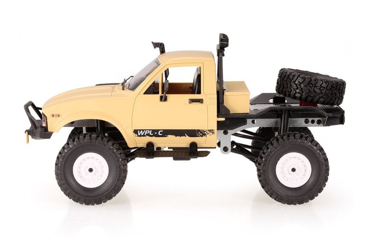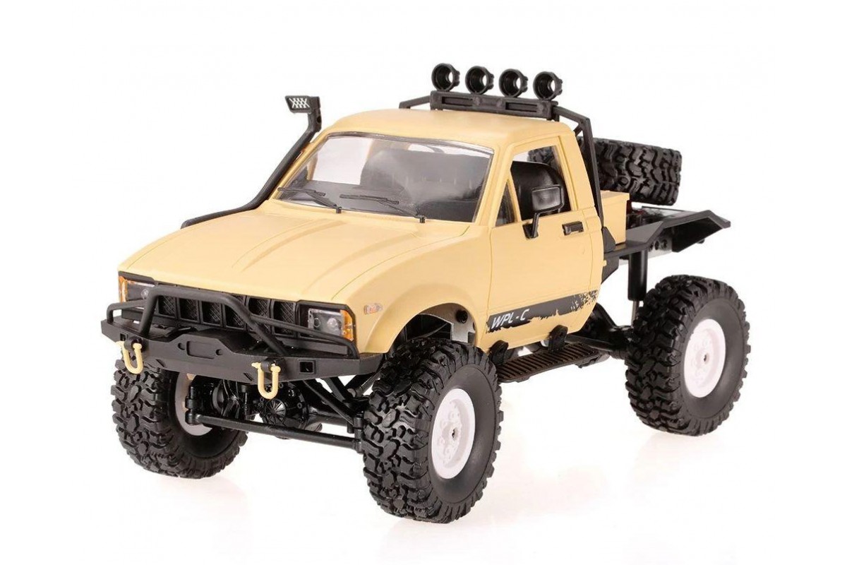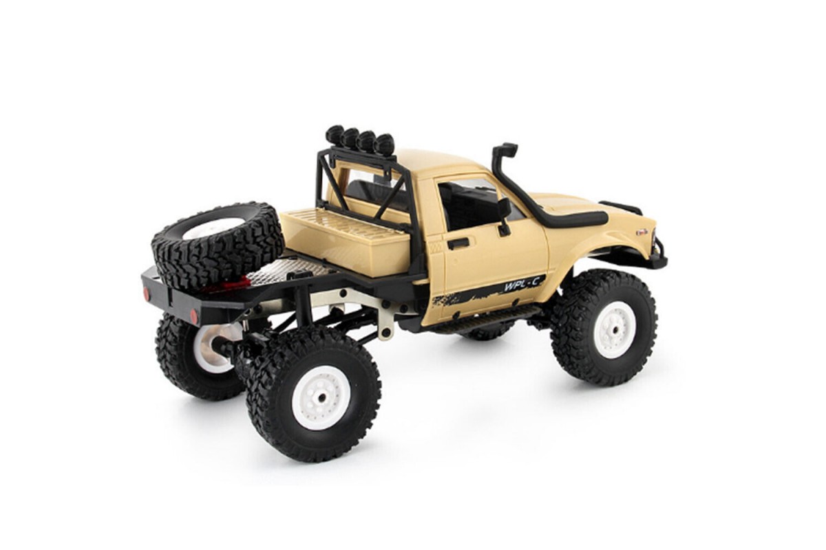 Радиоуправляемая машина WPL пикап Hilux (желтый) 4WD 2.4G 1:16 RTR - WPLC-14R-YELLOW - это радиоуправляемый внедорожный джип 1/16, оснащен полным приводом, действующей рессорной подвеской как у моделей ''краулер'' и мощным коллекторным электромотором. Внедорожник выпускается в различных вариантах окраски, имеет богатую деталировку и светящиеся передние фары. В кабине можно увидеть сиденья, руль и интерьер. Кабина изготовлена из прочного АВS пластика и установлена на металлическую раму. NiCD аккумулятор 6В 700 мАч спрятан под кабиной. Для установки батареи предусмотрен открывающийся люк.