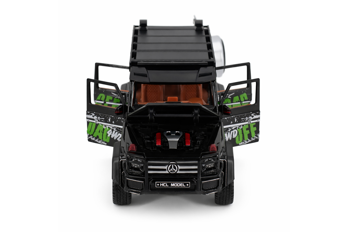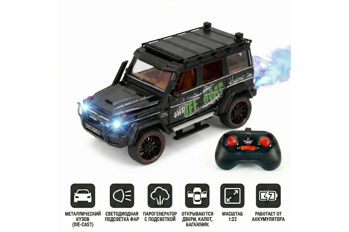 Радиоуправляемая металлическая машина Mercedes G500 1:22 - HCL-3801-BLACK - это стильная и детализированная модель с кузовом DIE-CAST, светодиодной подсветкой фар и эффектным парогенератором с подсветкой. Открывающиеся двери, капот и багажник делают модель максимально реалистичной. Отличный вариант для игры и подарка.