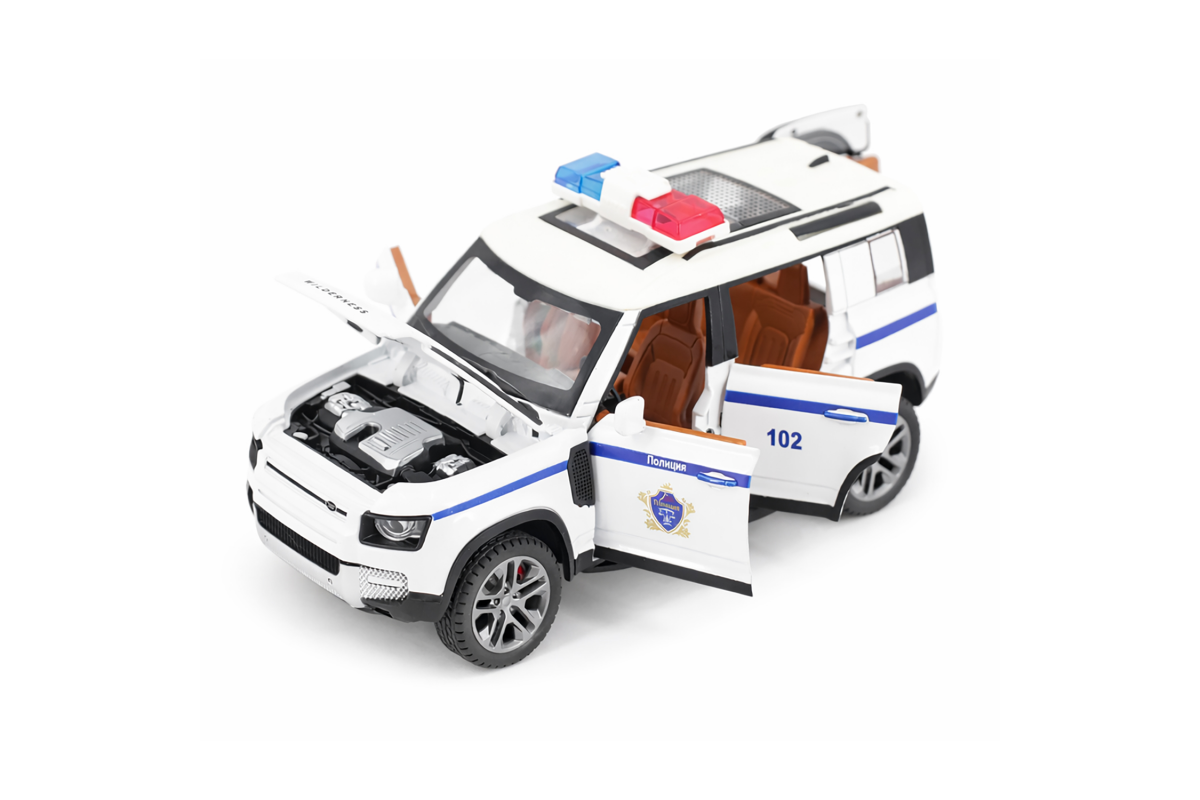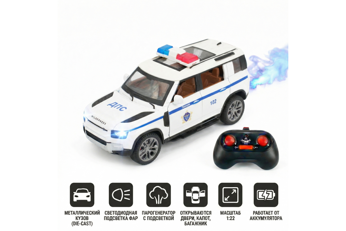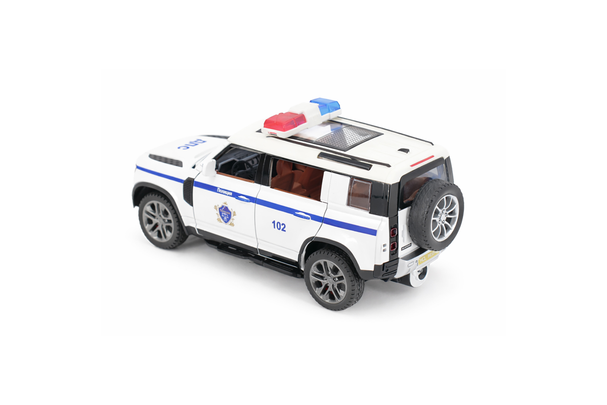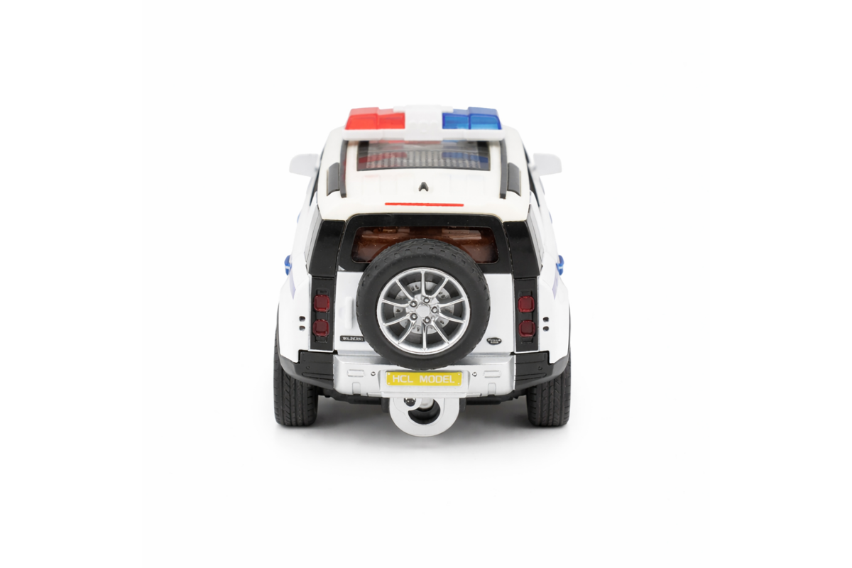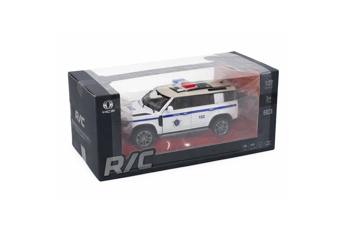 Радиоуправляемая металлическая полицейская машина Land Rover Defender 1:22 - HCL-3610-WHITE - это стильная и детализированная модель с кузовом DIE-CAST, светодиодной подсветкой фар и эффектным парогенератором с подсветкой. Открывающиеся двери, капот и багажник делают модель максимально реалистичной. Отличный вариант для игры и подарка.