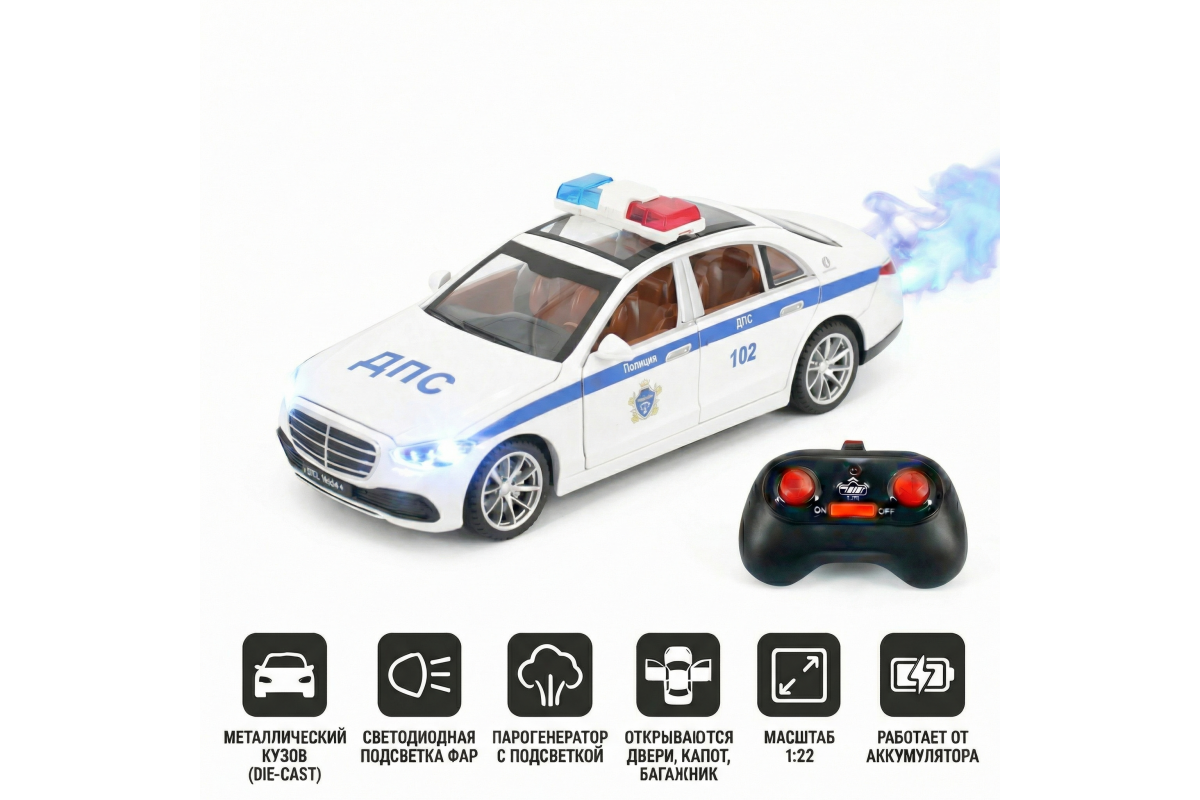 Радиоуправляемая металлическая полицейская машина Mercedes S600 1:22 - HCL-3613-WHITE - это стильная и детализированная модель с кузовом DIE-CAST, светодиодной подсветкой фар и эффектным парогенератором с подсветкой. Открывающиеся двери, капот и багажник делают модель максимально реалистичной. Отличный вариант для игры и подарка.