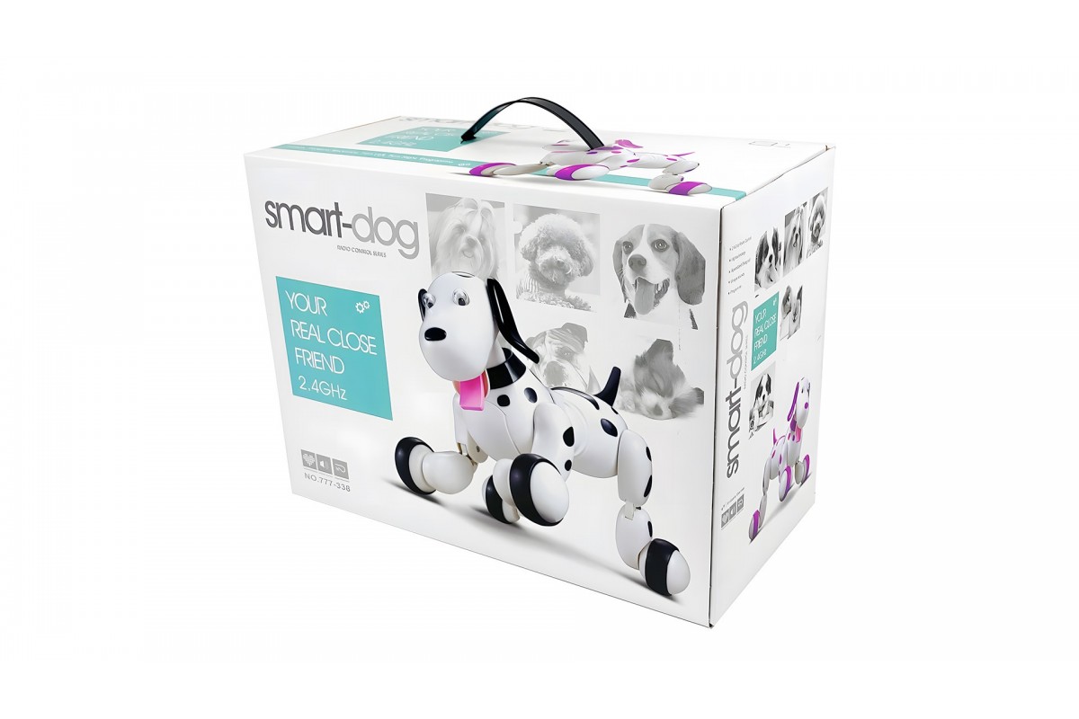 Радиоуправляемый HappyCow Smart Dog — это уникальная игрушка, которая имеет реалистичный облик, показывает различные эмоции и издает звуки. Собака двигает головой вперед-назад, влево-вправо, виляет хвостом, ложится, встает, садится и подает голос.