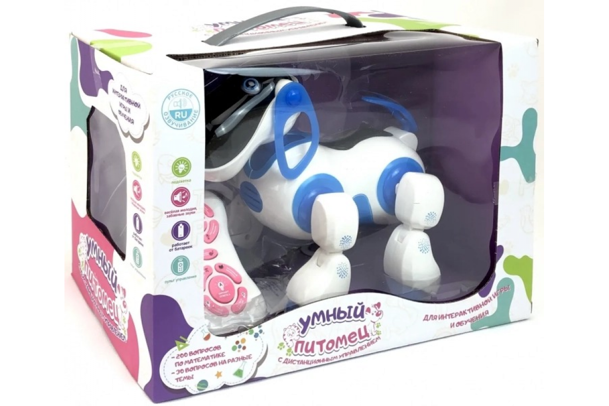 - В отличие от настоящей собаки этот робот-песик еще и разговаривает! Он может задать вопрос ребенку и отвечать на его вопросы. Интерактивная собака Киберпёс Ки-Ки задает вопросы, а ребенок на пульте управления нажимает правильный ответ. Если Ваш малыш ошибается, собачка обязательно об этом говорит. Какие вопросы задает интерактивная собака Киберпёс Ки-Ки: