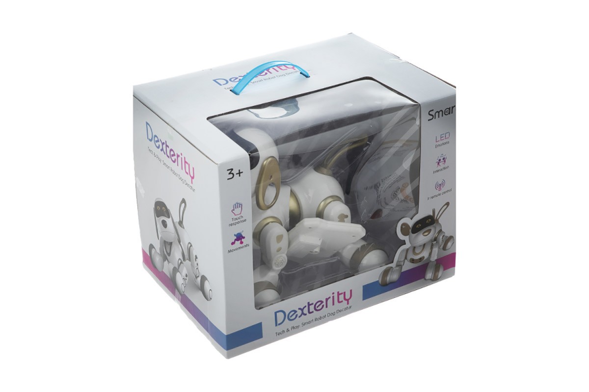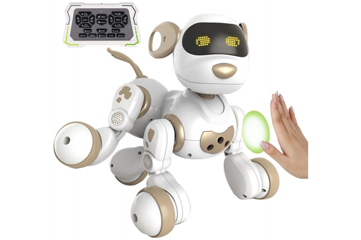 Радиоуправляемая собака-робот Smart Robot Gold Dog ''Dexterity'' - AW-18011-GOLD - это роботизированная, интерактивная собака, оснащенная множеством функций, с помощью которых она существует, как настоящая собака! Большое количество датчиков позволяет ей адаптироваться в пространстве, выполнять команды. Есть кнопки для движения собачки, кнопки для пения, танцев и режим обучения (на англ. языке). Жидкокристаллические глаза показывают внутреннее состояние Вашего любимца - радость, стеснительность и даже любовь! Как и все домашние питомцы, не всегда ведет себя послушно, когда разыграется.