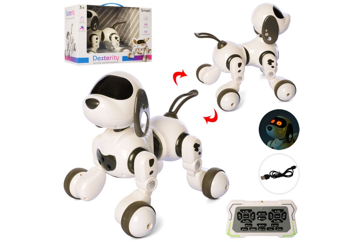 - В комплекте с собачкой идет пульт управления и usb зарядка.